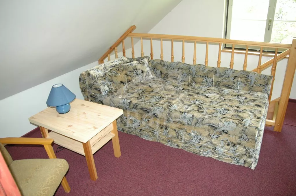 Free-standing cottage with a living area only ca. 36 m2. Enter via the terrace, hallway, kitchen with dining table for 2/3 persons, one electric hotplate, refrigerator, tea kettle and microwave oven. Bathroom with shower and toilet. Stairs to the attic. Upstairs there is a living room/bedroom with sitting area (sofa for two persons, which may be fold-out into a bed for 2 persons), TV and access to the bedroom (only curtain instead of door). In the bedroom there is a double bed. Electric heating. Cottage stands on a large non-fenced meadow, at the brook. There is a terrace, garden furniture with parasol, portable grill and fireplace at disposal. Own parking lot.