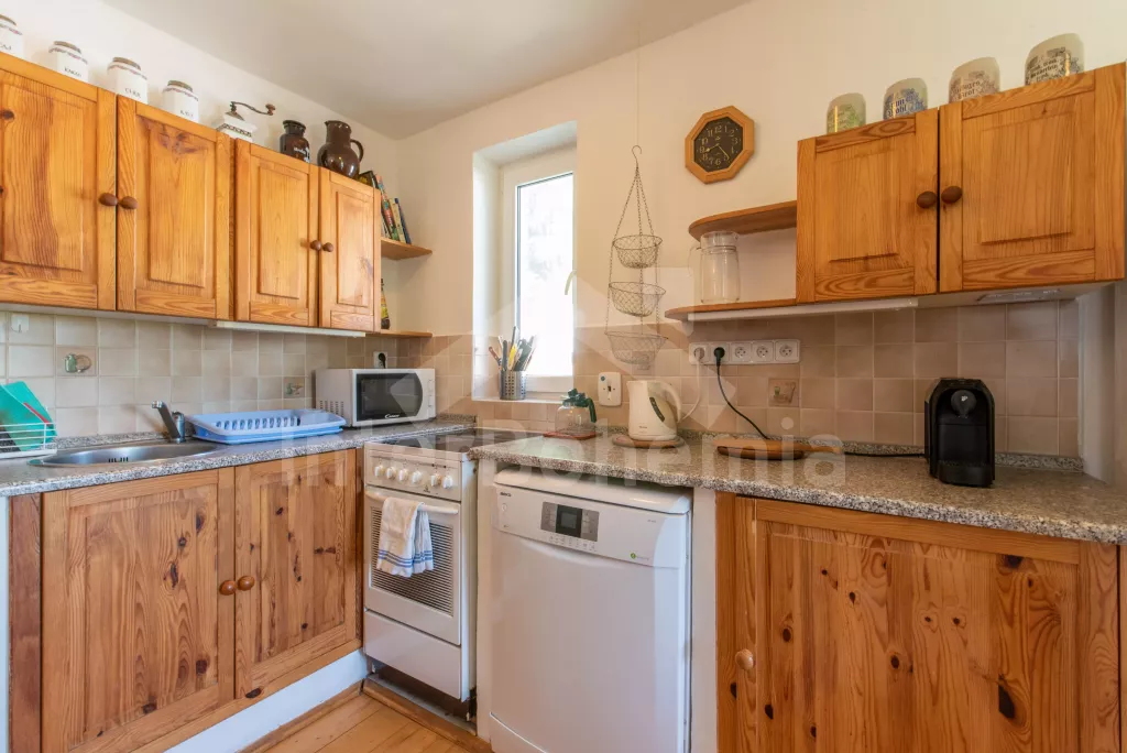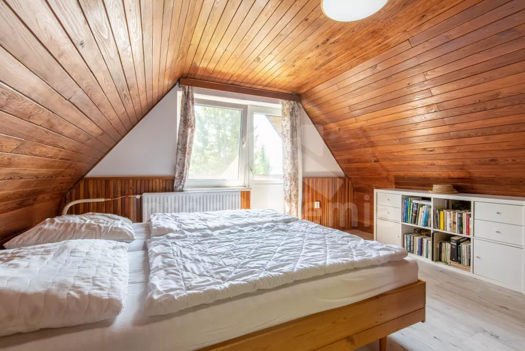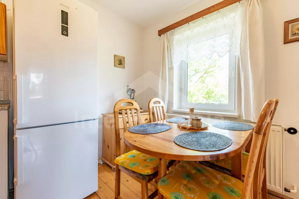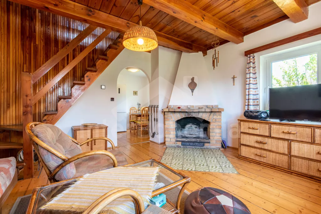 Cottage with partially fenced plot and outdoor seating. The cottage is located on a private area of 600 m2, surrounded by a wooden fence and spruce hedges for privacy. Entrance by stairs to the hall with clothes hangers. Kitchen with dining table for 4 persons, electric stove with oven, fridge with freezer, microwave, kettle, Tchibo capsule coffee machine, basic kitchen equipment and dishwasher. Living room with armchairs, coffee table, LED TV, radio, DVD player, board games, fireplace and extra bed. In the attic, a bedroom with a double bed, bedside tables and access to a balcony with a sofa. Second bedroom with double bed and single bed. Bathroom on the ground floor with shower, sink and toilet. Heating the building through a heat pump. Partially fenced plot with fireplace, grill, swing for children and wooden garden furniture. Parking for 2 cars in front of the cottage.