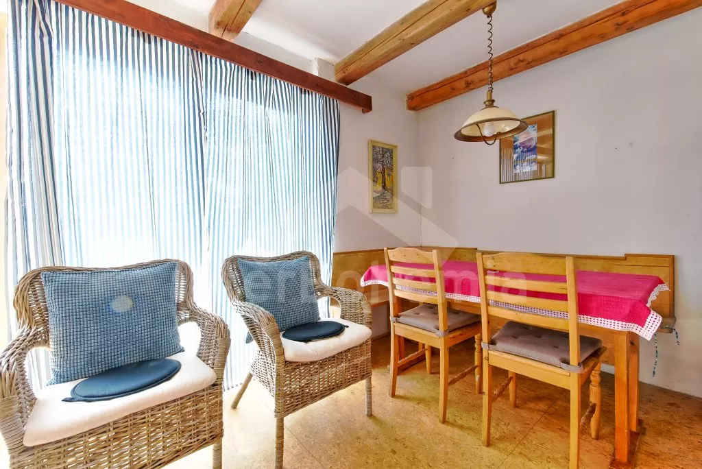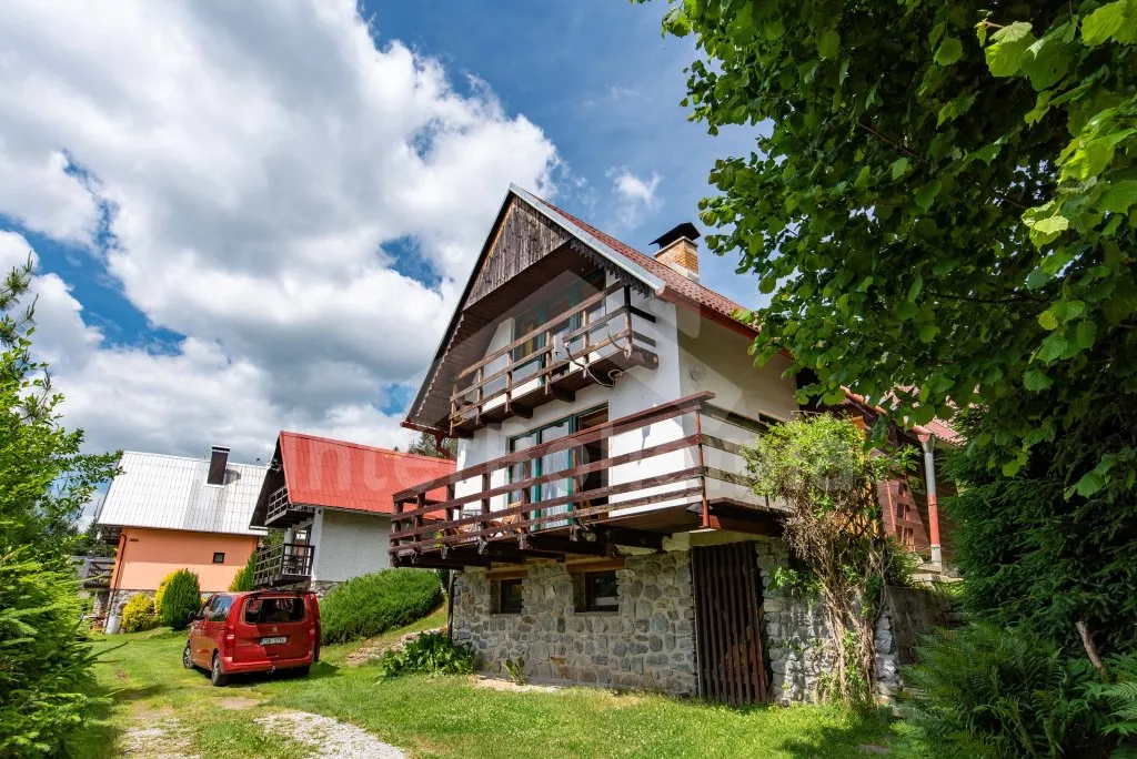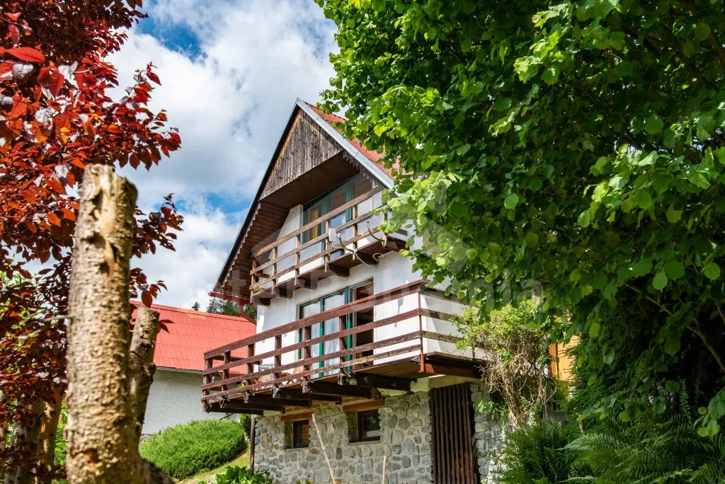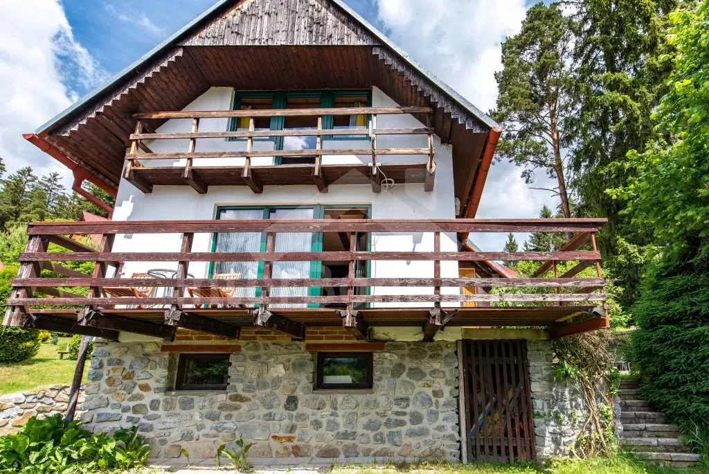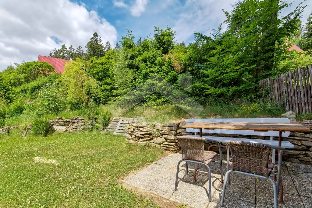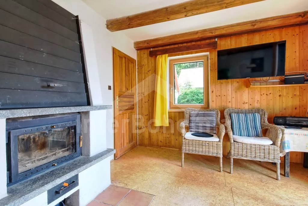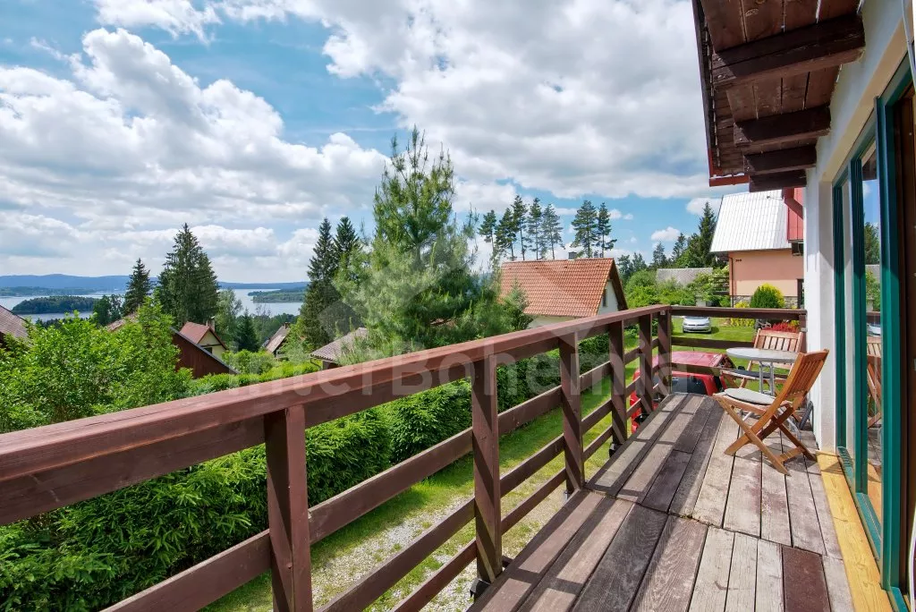 A free-standing brick cottage with a terrace, a balcony and a view of the Lipno dam. On the raised ground floor, a living room with a dining table, rattan armchairs, a wall-mounted TV, a fireplace and access to the terrace. From the living room there is access to the kitchen with an electric hob, microwave oven, kettle, fridge and freezer. Bathroom with shower and sink. Separate WC. Two bedrooms in the attic. The first with a double bed, a single bed, a 4th bed suitable for children under 12 years of age and access to the balcony. Second bedroom with double bed. Heating of the cottage with a fireplace. Guests have available outdoor seating on the terrace, a second seating area in their own garden, a garden grill and a fireplace. The possibility of storing bikes in the garage. Parking in front of the cottage for 2 vehicles.