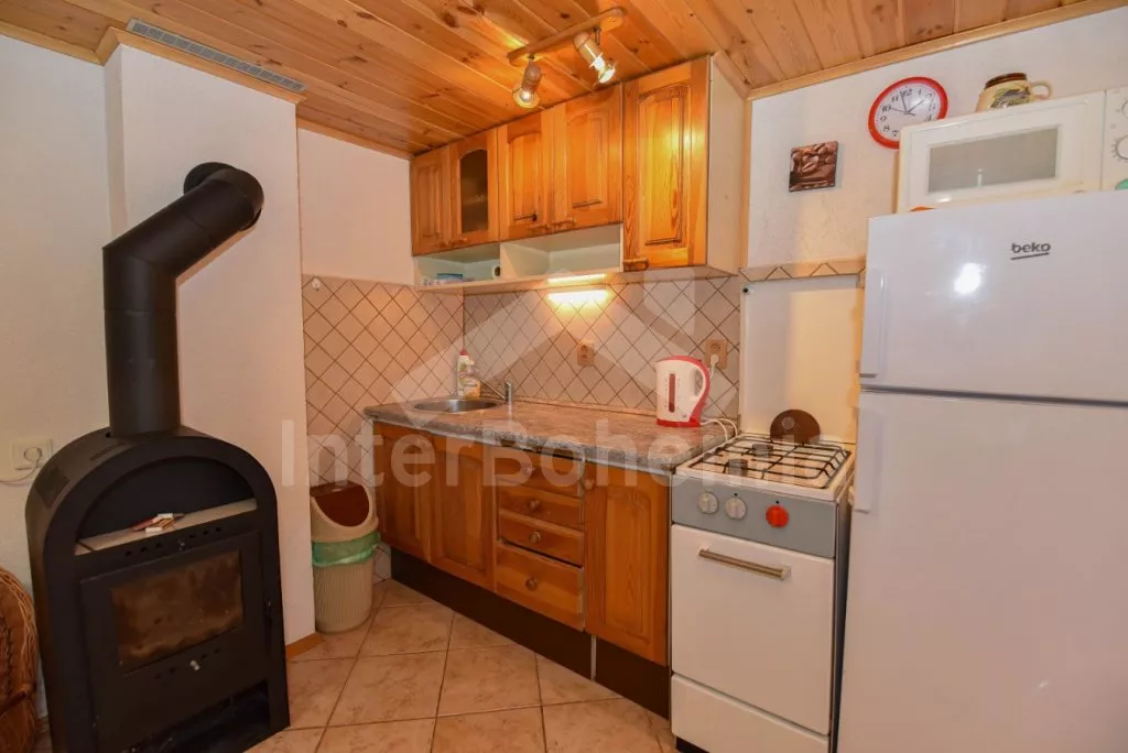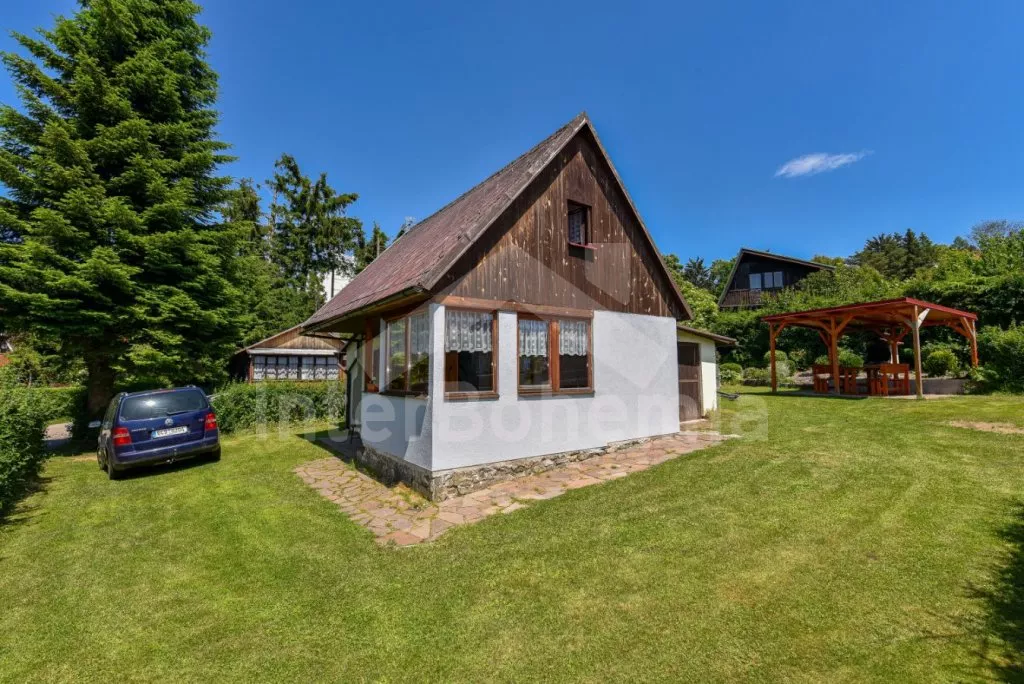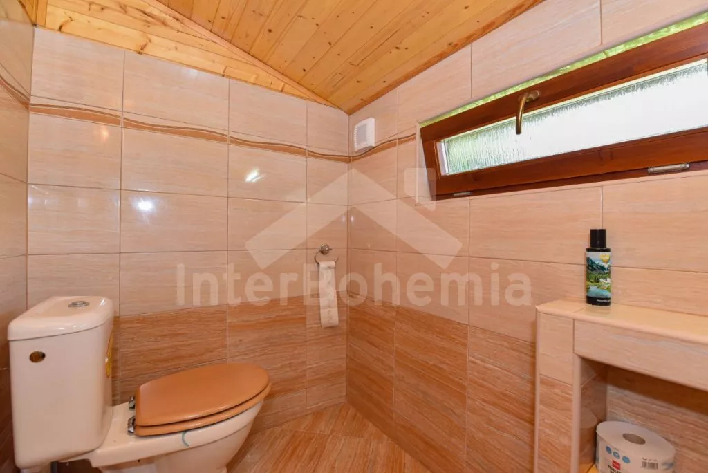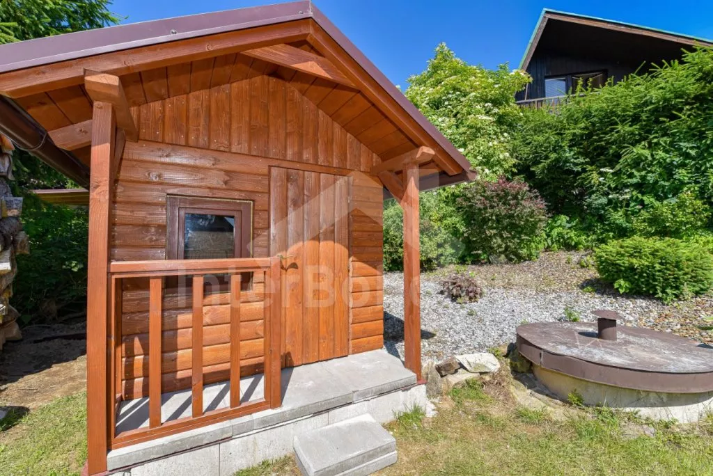 Detached cottage on its own unfenced plot, after reconstruction in 2018. Entrance, glazed porch with dining table for 7 people. Central living room connected to the kitchen. Kitchen with two-burner gas stove, gas oven, microwave, refrigerator with freezer, kettle and kitchenware. In the living room seating group (foldable into an extra bed for 2 people), radio, LCD TV and fireplace. Up the stairs in the attic is the gallery with a single bed, from which is the entrance to the bedroom with a double bed and two single beds. The ground floor bathroom with shower, sink and toilet. Heating of the cottage locally with a stove + electric heater in the bathroom. Guests have a partially fenced garden, a spacious covered pergola with seating and a fireplace, and a garden house for children. Parking by the cottage for 2-3 cars.