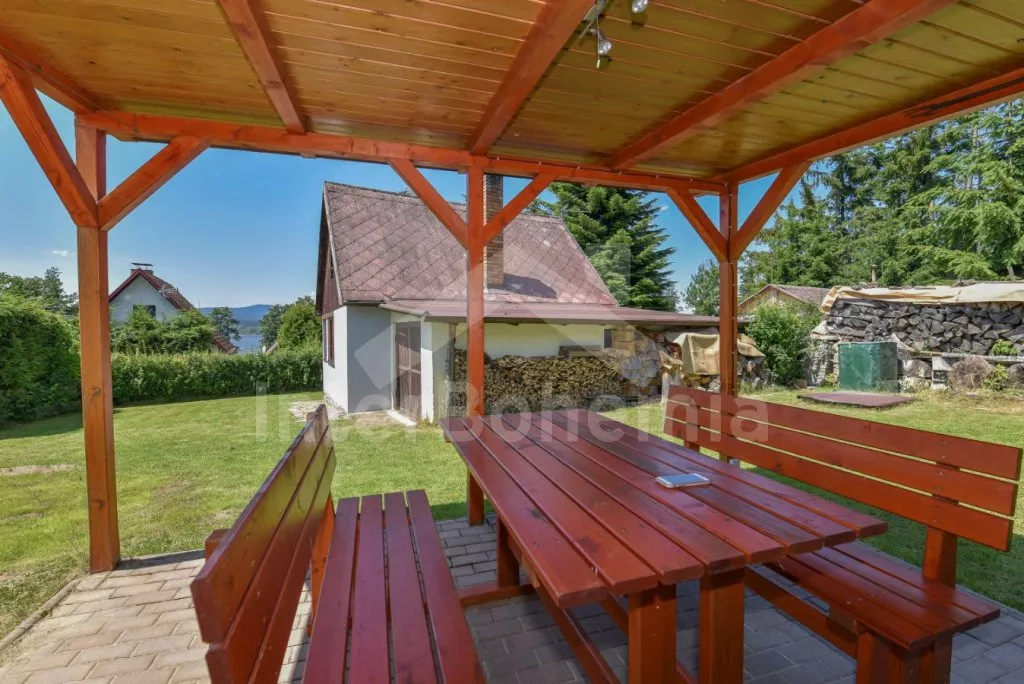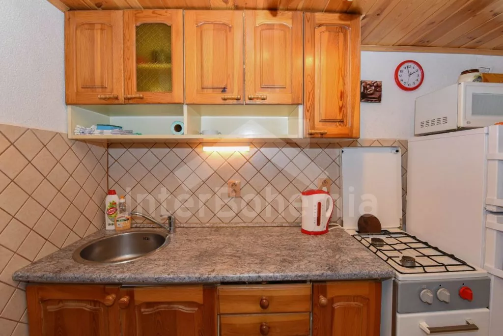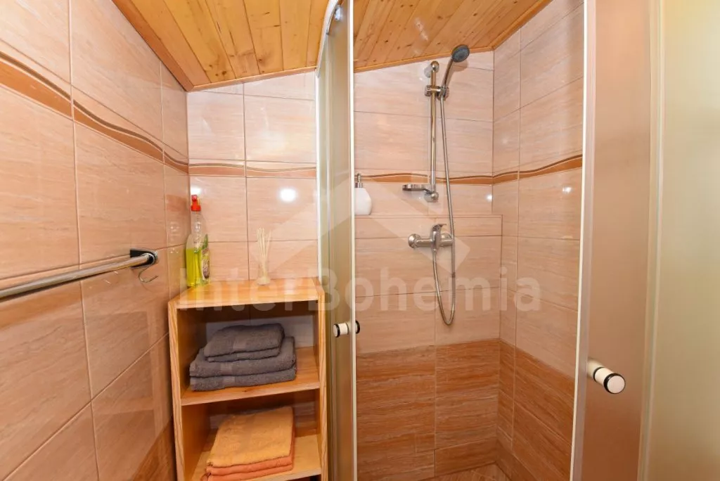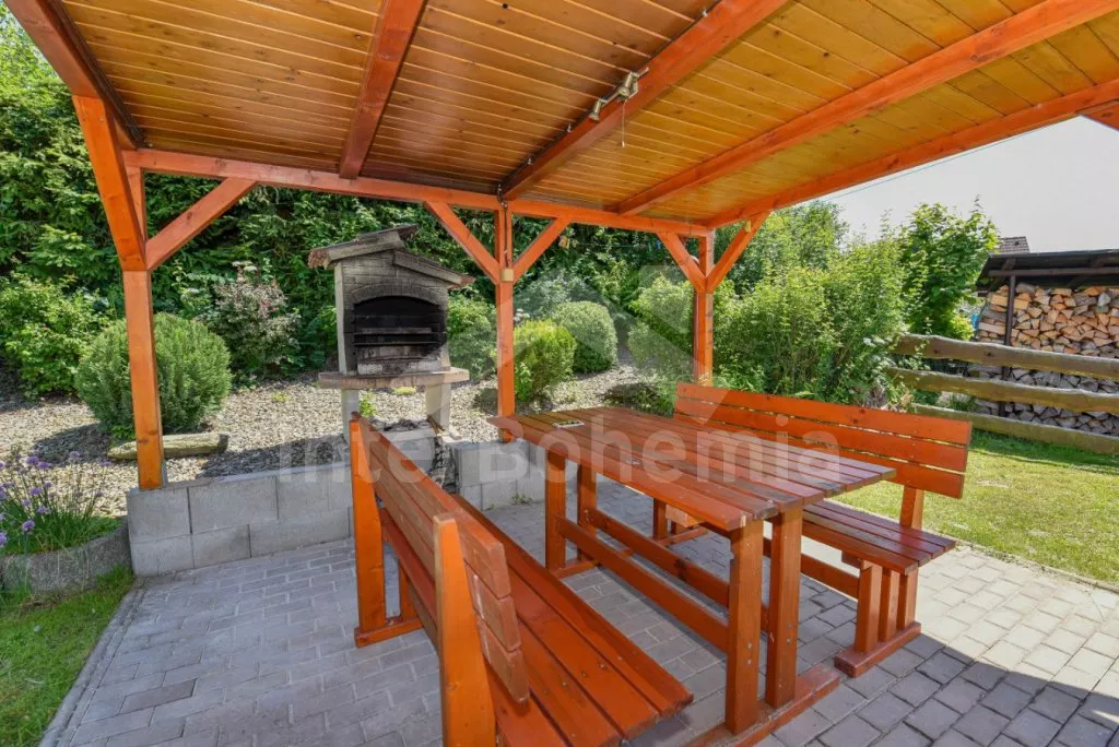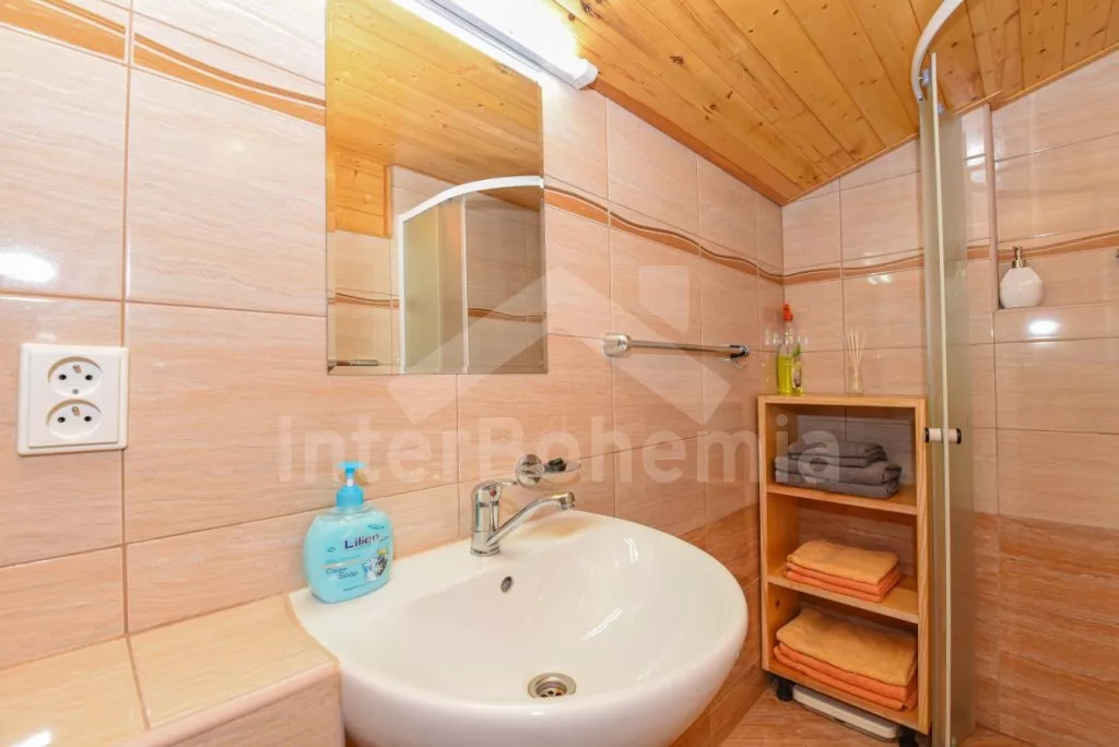 Detached cottage on its own unfenced plot, after reconstruction in 2018. Entrance, glazed porch with dining table for 7 people. Central living room connected to the kitchen. Kitchen with two-burner gas stove, gas oven, microwave, refrigerator with freezer, kettle and kitchenware. In the living room seating group (foldable into an extra bed for 2 people), radio, LCD TV and fireplace. Up the stairs in the attic is the gallery with a single bed, from which is the entrance to the bedroom with a double bed and two single beds. The ground floor bathroom with shower, sink and toilet. Heating of the cottage locally with a stove + electric heater in the bathroom. Guests have a partially fenced garden, a spacious covered pergola with seating and a fireplace, and a garden house for children. Parking by the cottage for 2-3 cars.