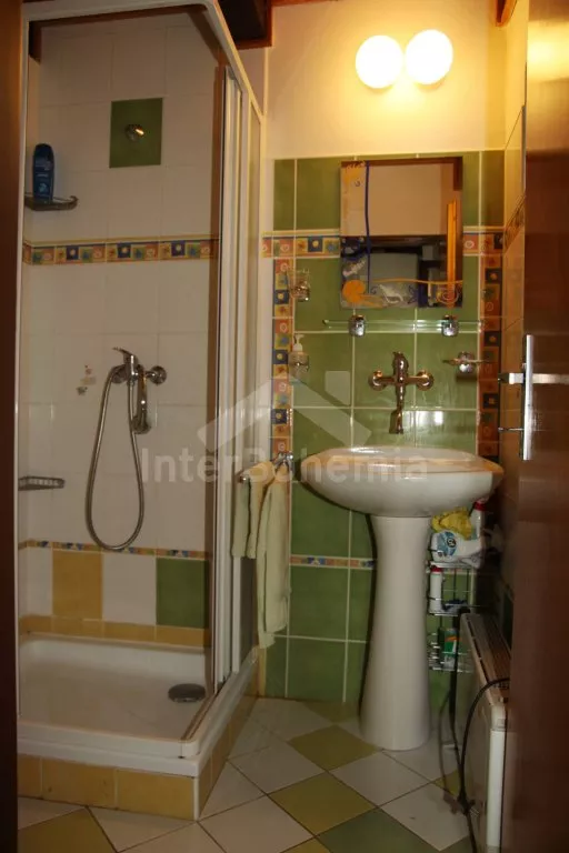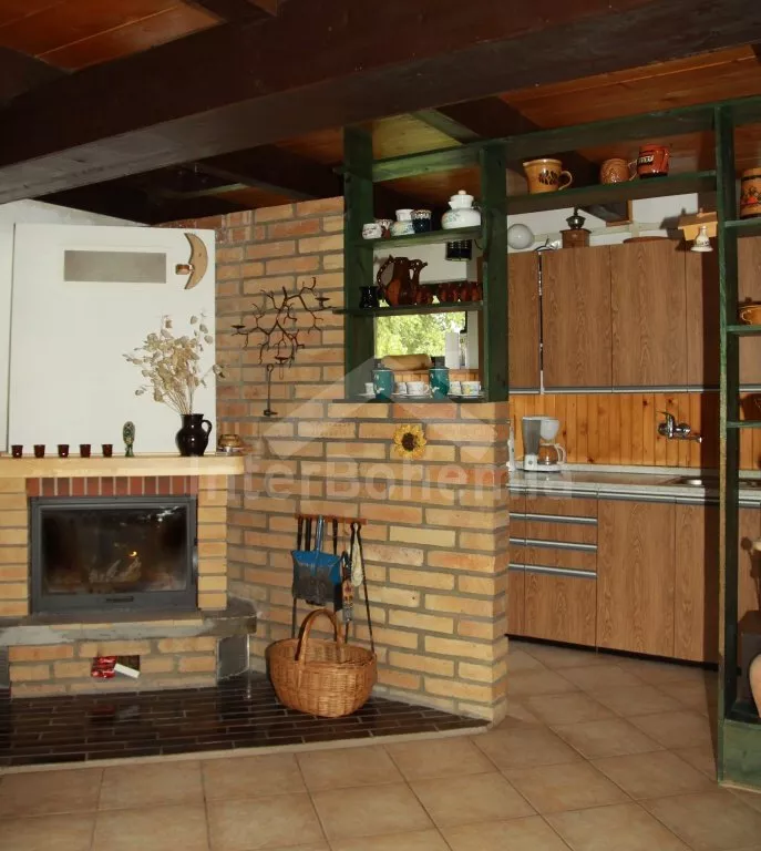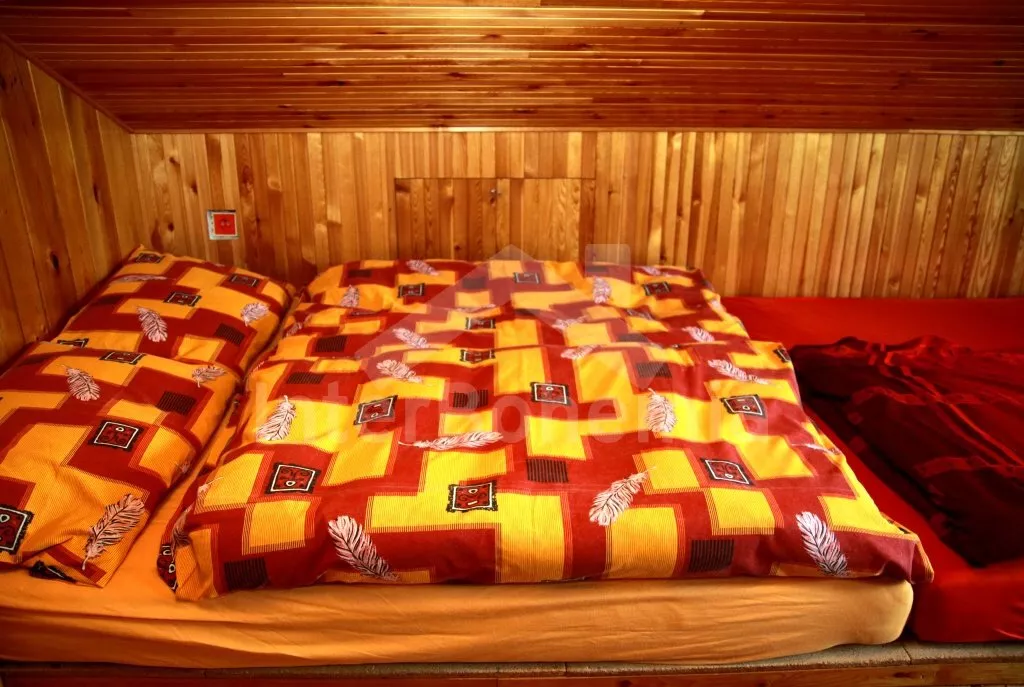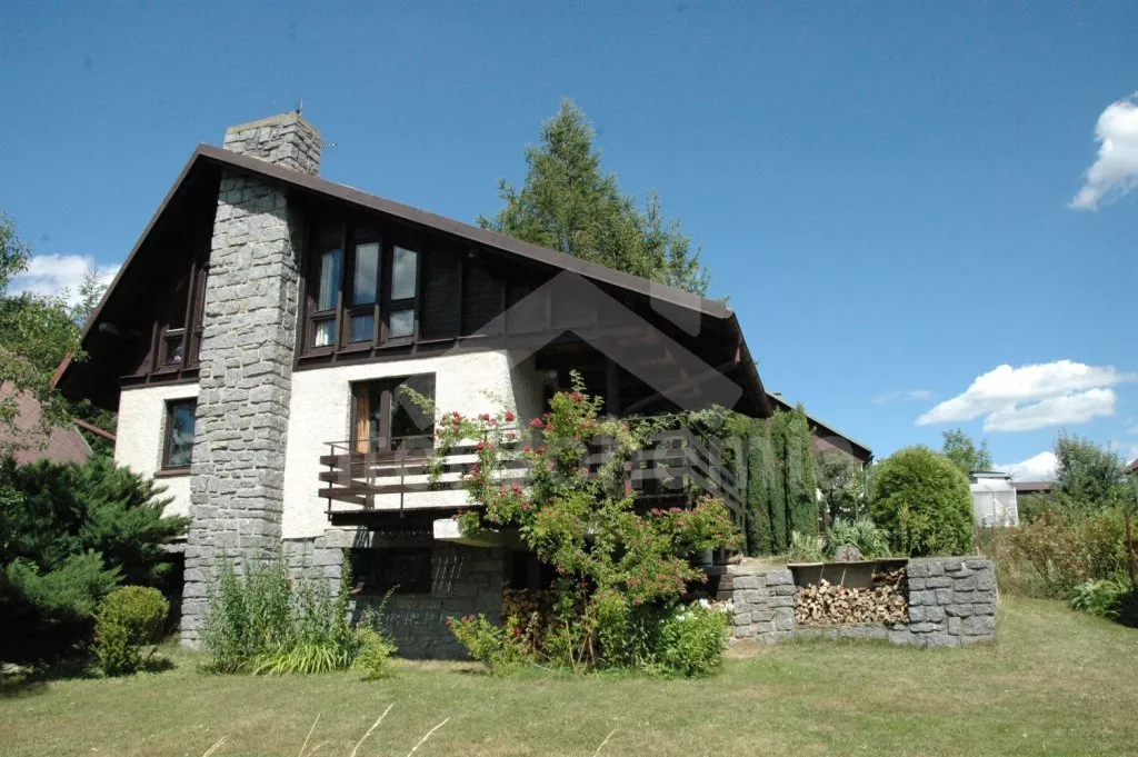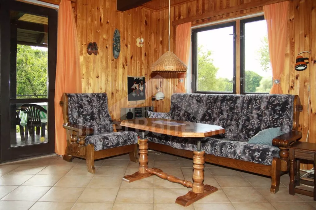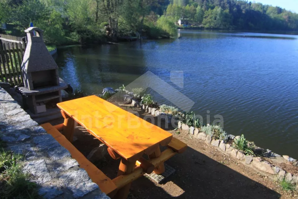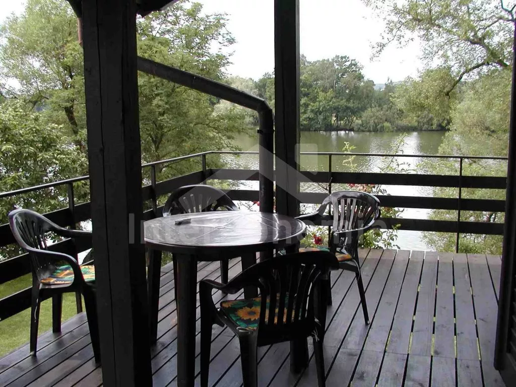 Free-standing holiday cottage, well furnished. Entry, living room with sofa, hot-flue fireplace with heater and satellite TV. Entry to covered terrace with dining area (which may also be situated inside). Partly-open kitchen with electric cooker, refrigerator, microwave oven, tea kettle, coffee maker and toaster. Bathroom with shower, separate toilet. Upstairs there are 3 bedrooms – the first with a double bed, the second with a double bed and entrance to the balcony, and the third with two double beds. There is a fenced garden with garden furniture, garden barbecue with sitting(at the lake bank) and fireplace at disposal. Garden ends by the pond.