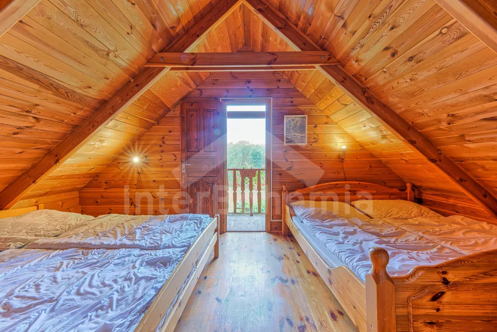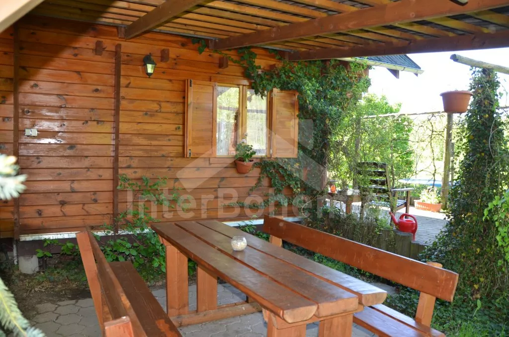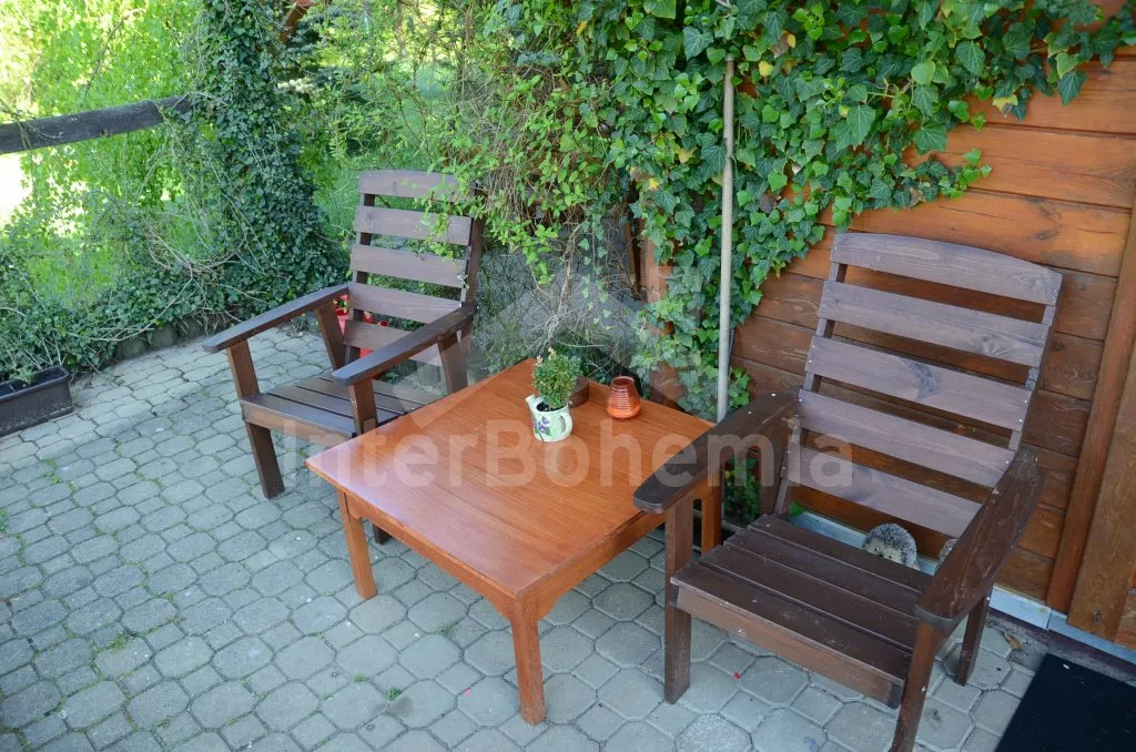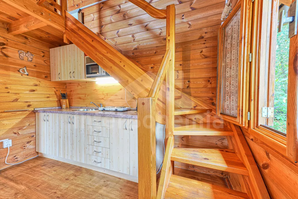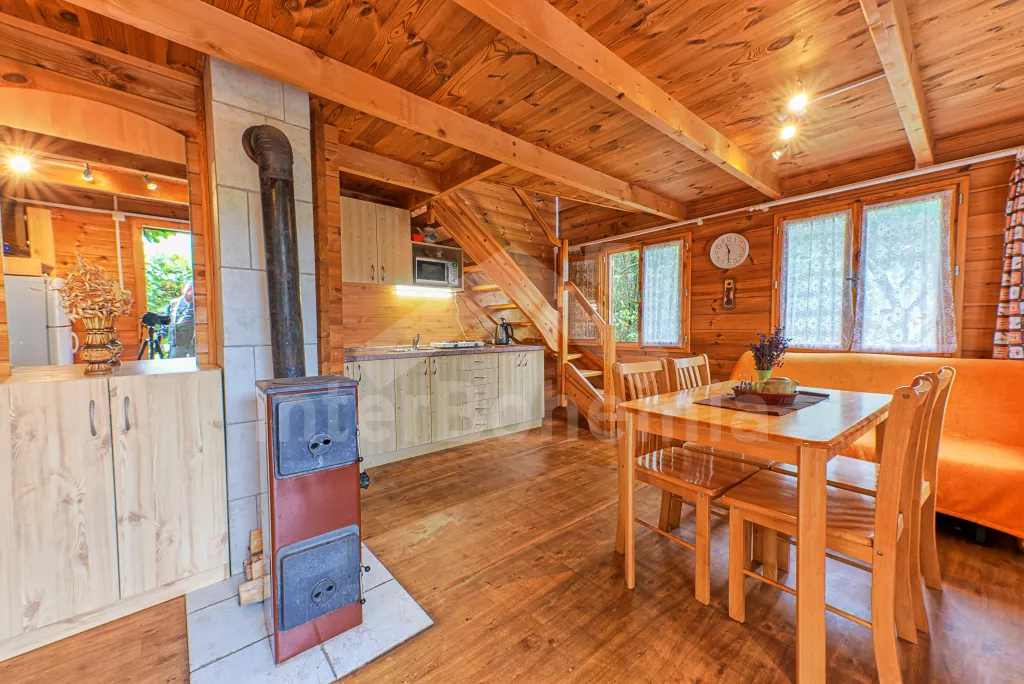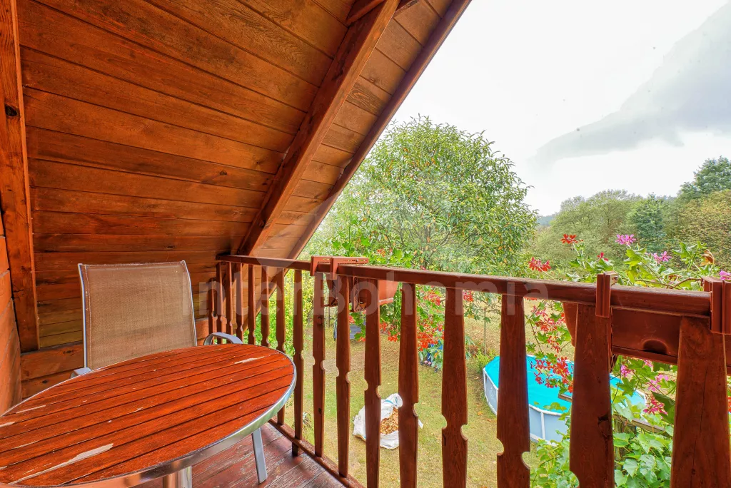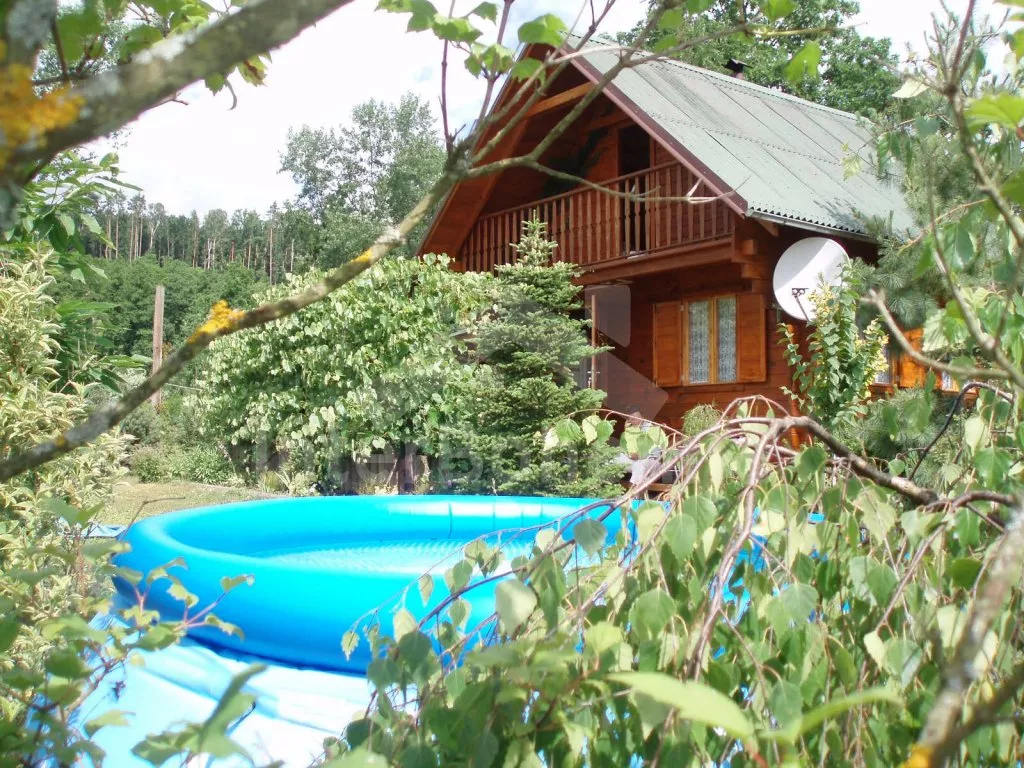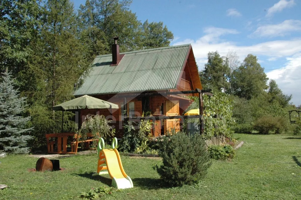 Detached chalet, newly built in 2007 and tastefully furnished. Entrance, living room with a fold-out couch (double bed), dining table, satellite TV and entrance to a terrace. Open plan kitchen with two plates, refrigerator, coffee-maker and microwave oven. Bathroom with a shower and a toilet. On the first floor there is a bedroom with two double beds and roofed balcony. Heating (wood + one electric heating). Spacious, fenced garden with a pergola, terrace, wooden garden furniture, sun-umbrella, mobile barbecue, fire place, sand-pit, swing, slide and round swimming pool (Ø 3 m). Private parking on the plot.