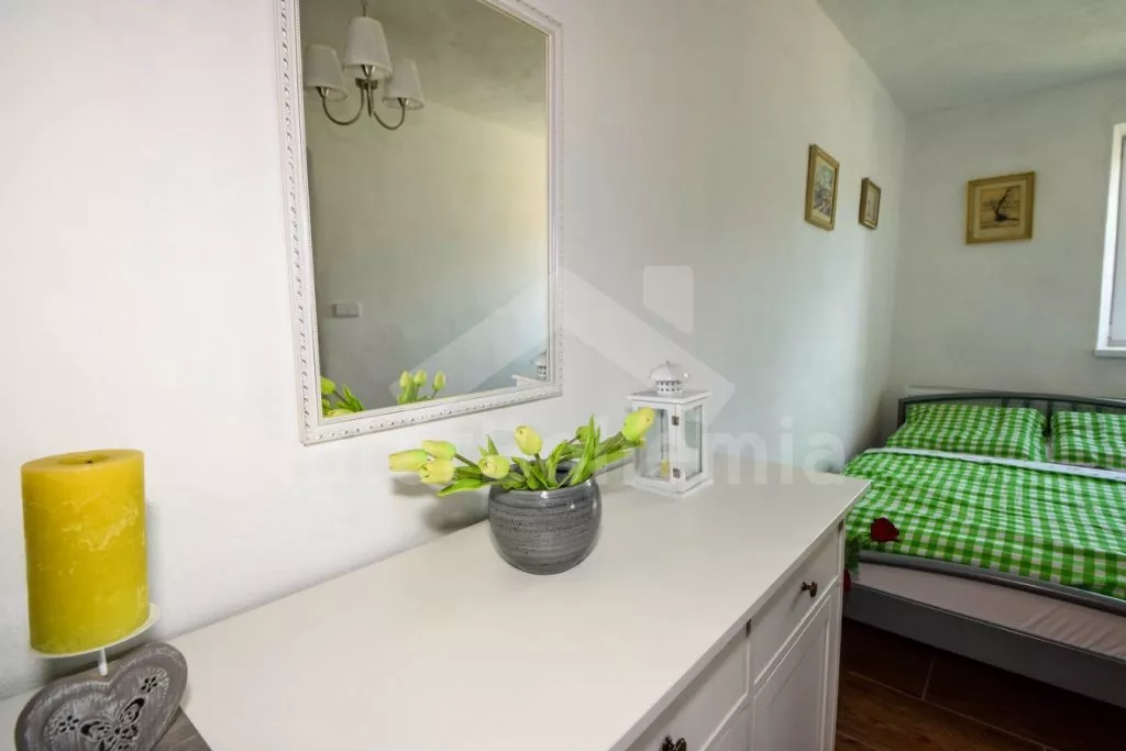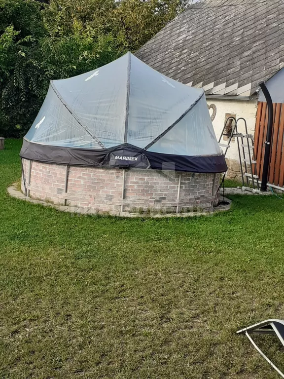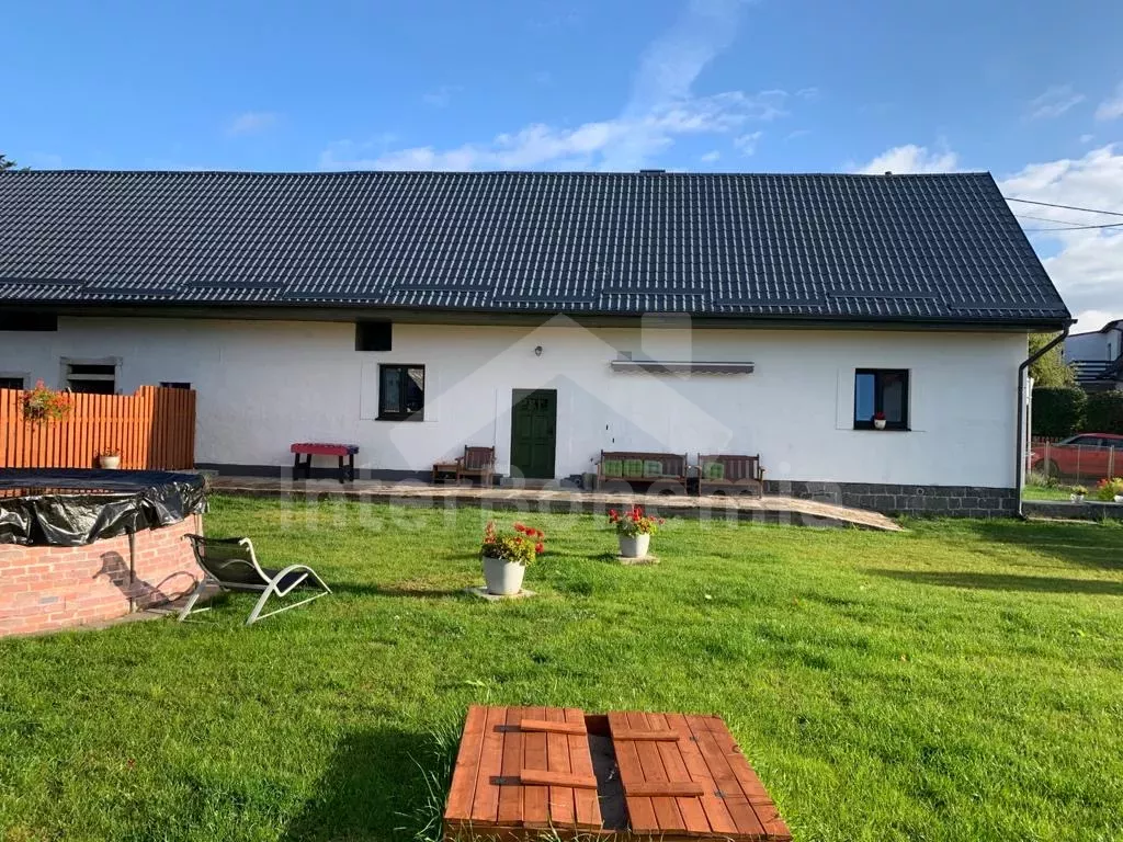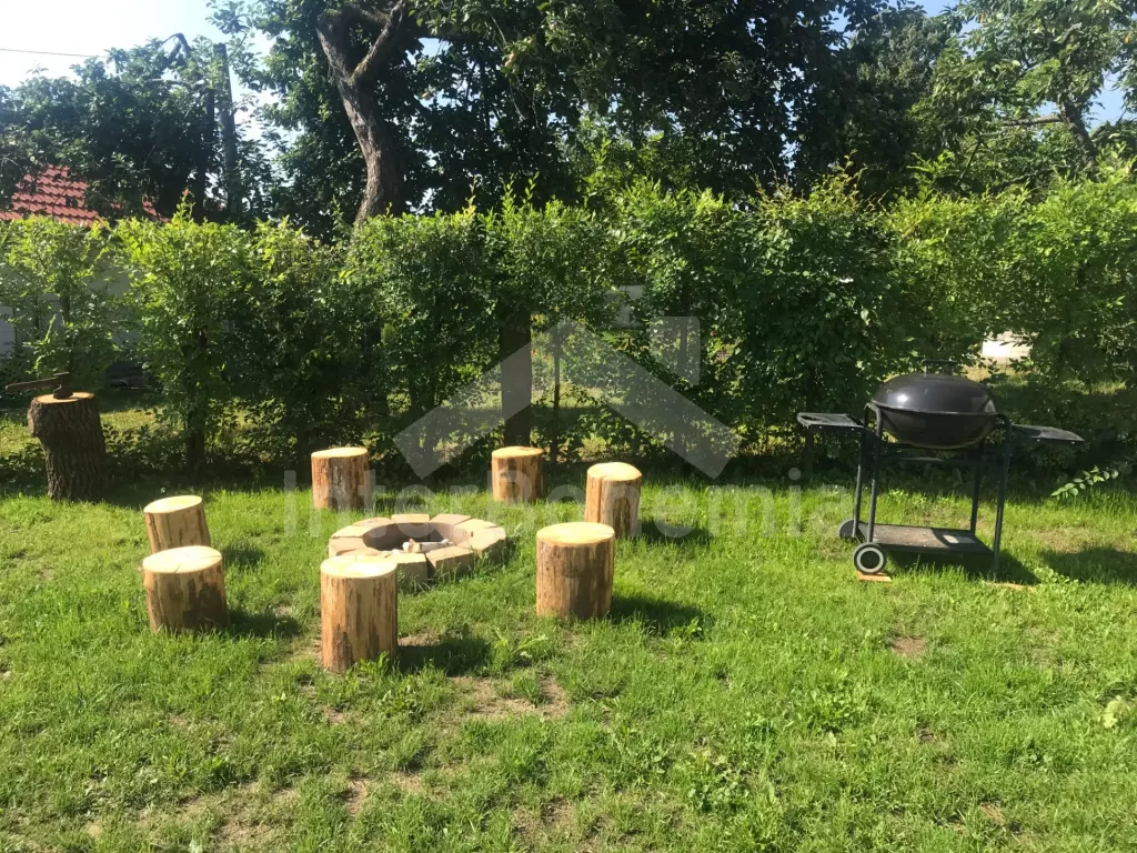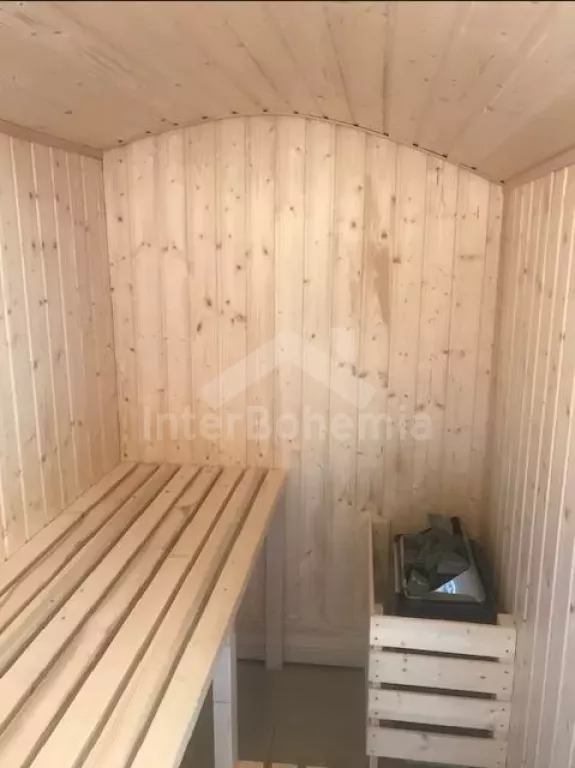 Stylish cottage with its own fenced garden, after a tasteful reconstruction in 2020. Entrance from the yard, hallway, living room with leather seating group, LCD TV, radio, dining table for 6 people, tiled stove and kitchenette with electric two-burner stove, microwave, refrigerator, coffee maker, kettle and kitchenware. Two separate bedrooms, each with a double bed and a single bed (each can be divided into two beds). Bathroom with two sinks, shower, mini washing machine and toilet. The building is heated by a fireplace with an exchanger. Sauna, table football, fully fenced garden with outdoor seating under the pergola, garden fireplace, grill, garden shower and above-ground pool available. For children, a sandpit, a trampoline, a swing, a children's pool, and a house with toys in the garden. Parking in an enclosed garden for 2 vehicles.