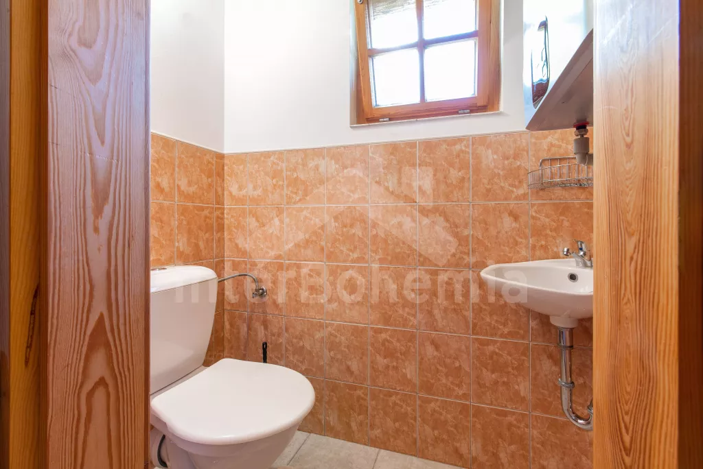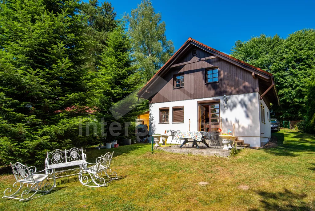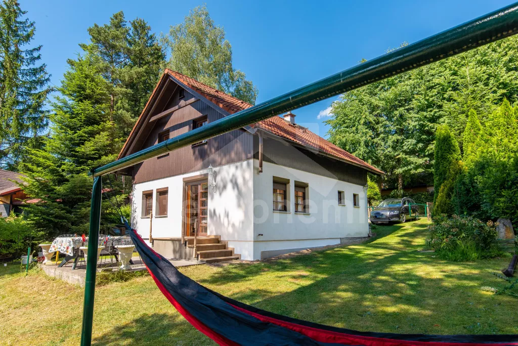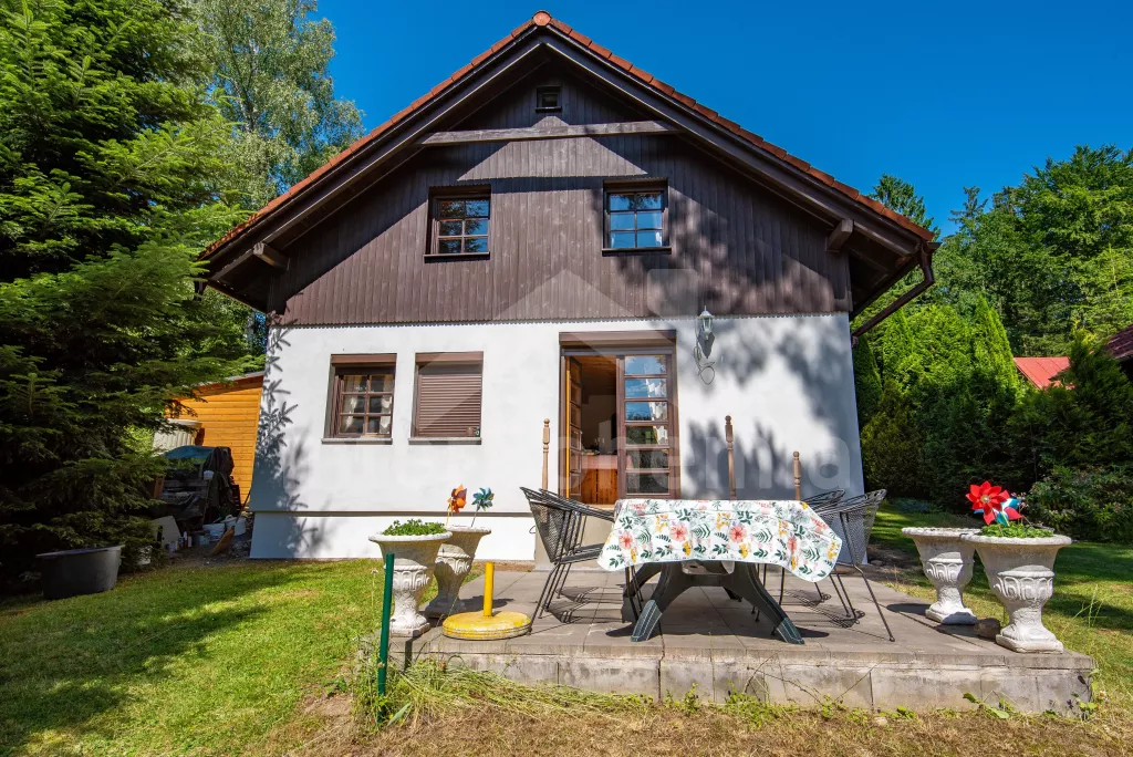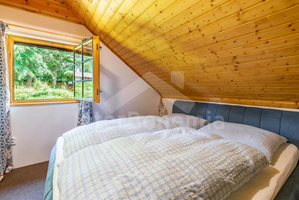 Pleasantly furnished holiday cottage with its own garden with mature trees and good walking distance to the banks of the Seč dam. On the ground floor, a spacious living room with sofa, TV, fireplace and dining table. It is directly connected to the kitchenette with electric stove, microwave oven, toaster, Remo, coffee machine (for capsules), kettle and dishwasher. Fridge with freezer in the hallway. Bathroom with sink and shower. Separate WC. A total of 3 bedrooms in the attic, all with double beds. Possibility of sleeping in an open attic alcove on 2 mattresses (ladder access). Heating the building with fireplace stoves. Guests have at their disposal a partially fenced garden with outdoor seating, a swing set, a garden grill and covered seating in the cottage annex. Parking at the property for 2 vehicles.