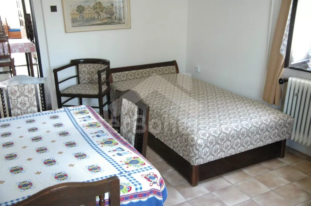 Detached holiday house, former farm. Simply, but comfortably furnished and equipped. All rooms on one floor. Entry to hall; open kitchen with dining table, two sofas, TV, cooker with four electric plates and electric oven, fridge, coffee maker, tea kettle and microwave oven. Bedroom with table, chairs and three separate beds. Second bedroom with double bed. Bathroom with bath and toilet. Third bedroom with a double bed, sitting area, entry to garden and own toilet and basin. Electric central heating. Fenced garden with pergola, garden furniture with beach umbrella, portable grill. For children from approx. 1 year water paddling pool (average 1 m). Own parking lot.