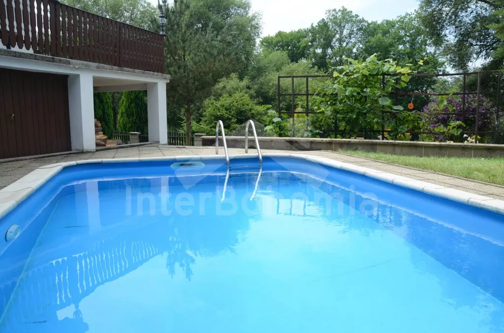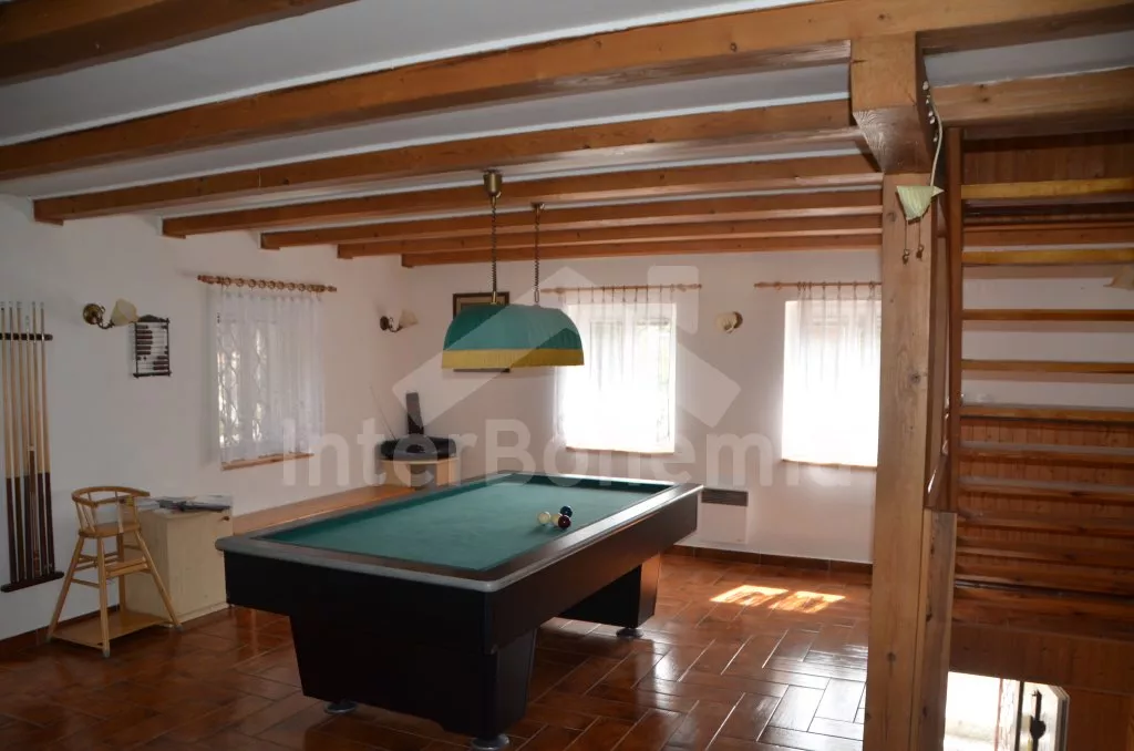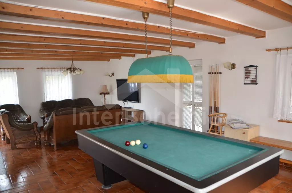 Detached villa, complete and comfortable furnished. Fully and comfortably furnished. Entry, hall, bathroom with shower, second large bathroom with shower, infrasauna, toilet and washing mashine. Lounge with bar (beer tap possible) and dining table for 10 persons. Stairs to first floor with large living room with leather sofa, tiled stove, billiard, sat-TV and entry to terrace and balcony. Kitchen with entry to balcony, with dining table, gas cooker with four plates, refrigerator, coffee maker, tea kettle and microwave oven. Attic: five bedrooms – one through single room and four double rooms. WC. Fenced garden, garden furniture with beach umbrella, garden grill, playground for the children, swing, sandpit and in-ground swimming pool 5,6 x 2,8 m. Own parking lot for 2 cars in garden, another 4 cars can be parked in front of the house. Electric heating.