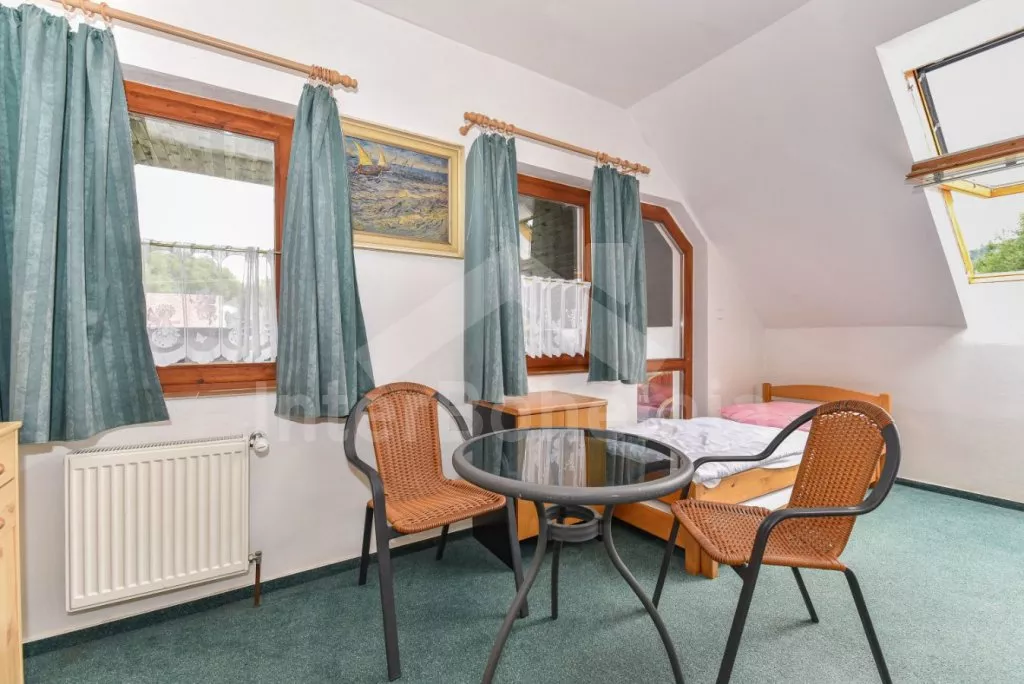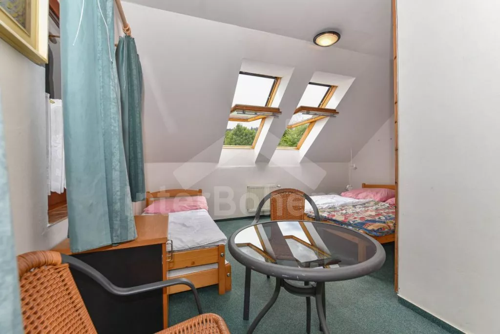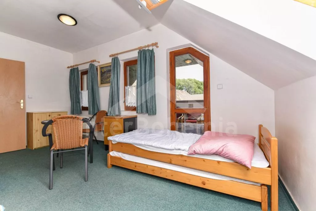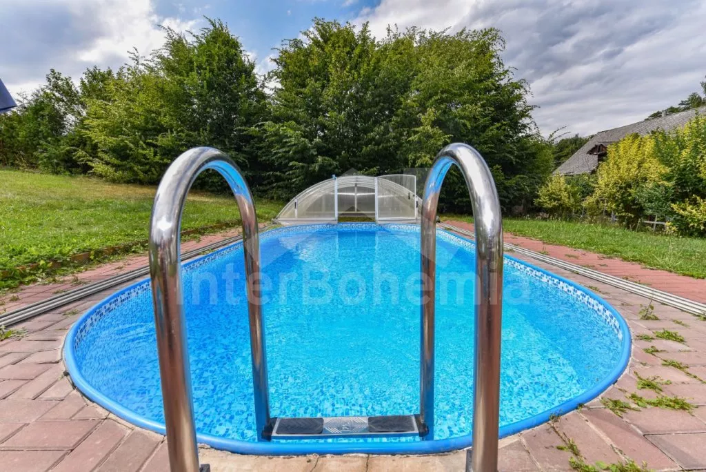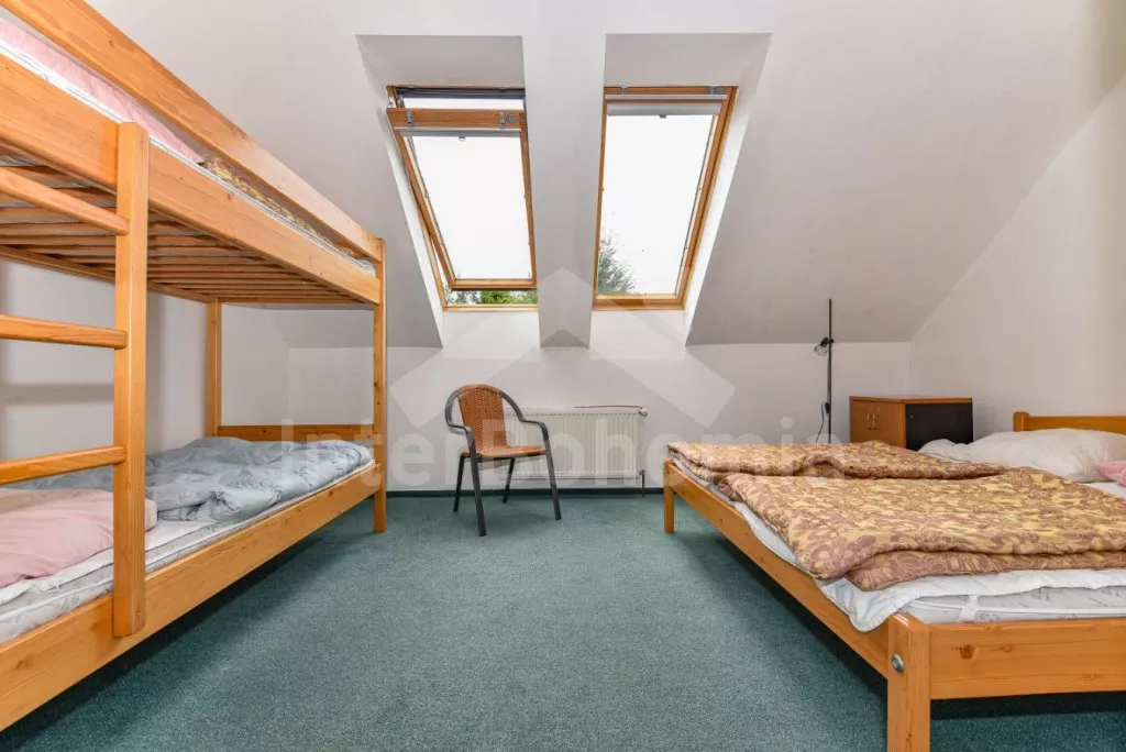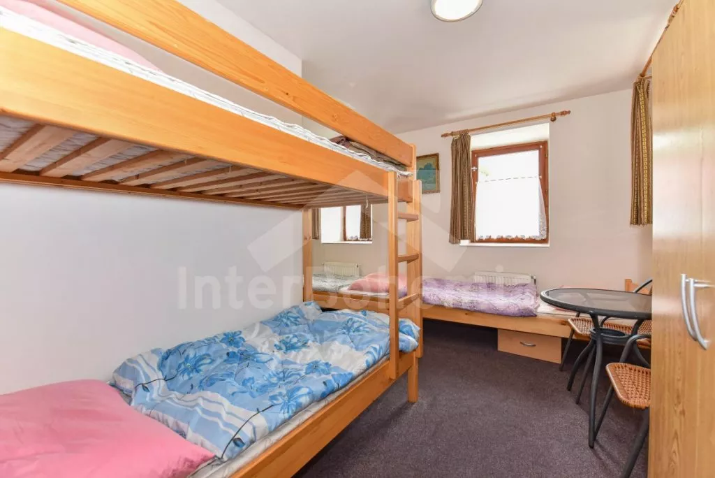 Freestanding house, practically furnished. Entry, spacious living room with a sofa, armchairs and coffee tables for 16 persons, stove and sat-TV. Open kitchen with electric cooker, refrigerator, tea kettle, coffee maker, microwave oven and dishwasher. Bedroom with two single beds, a bunk bed and own bathroom with a shower and toilet. The second bedroom with a fold-out bed for two persons and own bathroom with a shower and toilet. Upstairs there is a hall and other three bedrooms – the first, spacious bedroom with a double bed, a bunk bed and own bathroom with a bath-tube, shower and toilet, the second bedroom with two bunk beds and own bathroom with a shower and toilet and the third bedroom with a double bed, a fold-out bed for two persons, access to a covered balcony with sitting area and own bathroom with a shower and toilet. Central heating (coal or electric). The house stands on a non-fenced property, there are terrace, garden furniture with a parasol, portable grill, campfire and swimming pool 6 x 3 m with a roof at your disposal. Own parking lot.