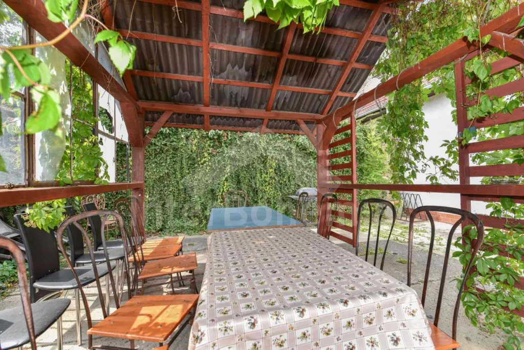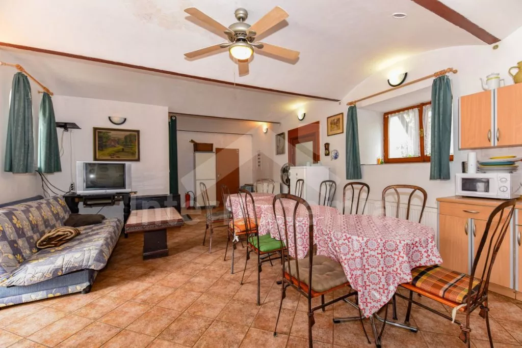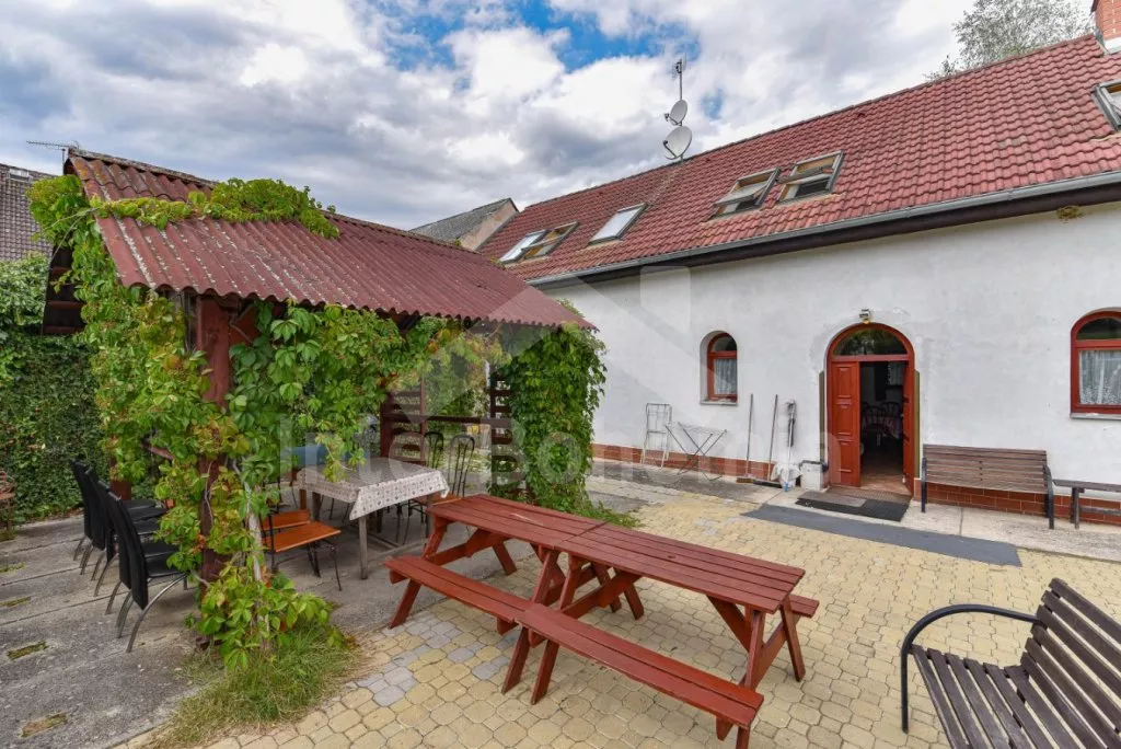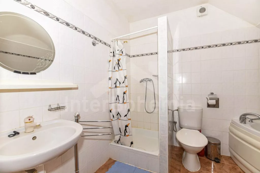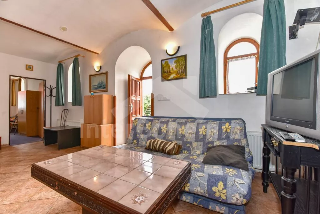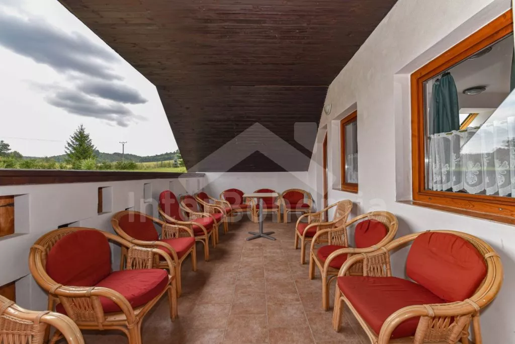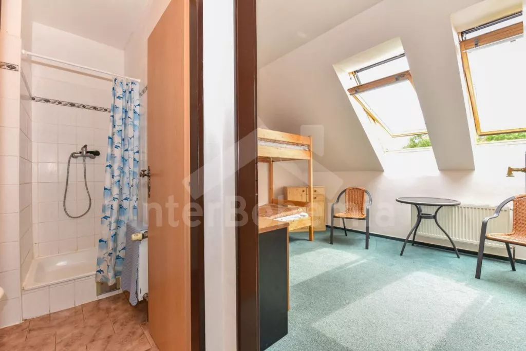 Freestanding house, practically furnished. Entry, spacious living room with a sofa, armchairs and coffee tables for 16 persons, stove and sat-TV. Open kitchen with electric cooker, refrigerator, tea kettle, coffee maker, microwave oven and dishwasher. Bedroom with two single beds, a bunk bed and own bathroom with a shower and toilet. The second bedroom with a fold-out bed for two persons and own bathroom with a shower and toilet. Upstairs there is a hall and other three bedrooms – the first, spacious bedroom with a double bed, a bunk bed and own bathroom with a bath-tube, shower and toilet, the second bedroom with two bunk beds and own bathroom with a shower and toilet and the third bedroom with a double bed, a fold-out bed for two persons, access to a covered balcony with sitting area and own bathroom with a shower and toilet. Central heating (coal or electric). The house stands on a non-fenced property, there are terrace, garden furniture with a parasol, portable grill, campfire and swimming pool 6 x 3 m with a roof at your disposal. Own parking lot.