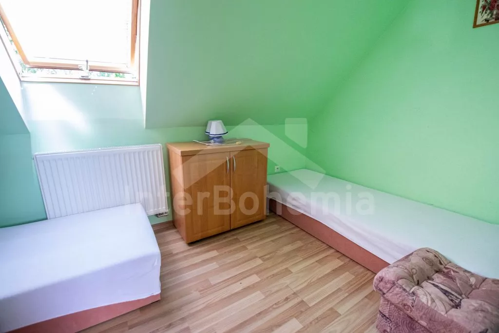 In South Bohemia, at the edge of village Divcice, 20 km northwest of Ceske Budejovice. This small village is situated among a couple of ponds; view of the greenery. Shop with basic necessities 1 km, supermarket 10 km, restaurants 4, 5, 6 and 7 km. Swimming pool 3 km and 10 km, tennis courts, tennis hall and golf course in Hluboka nad Vltavou 11 km. Horse riding 1 km. Pond Bezdrev with swimming and water sports possibilities and boats for rent 13 km. Forest 1 km. Fishing possibilities (with a fishing permit) 8 km. Bikes for rent by agreement with the landlord.