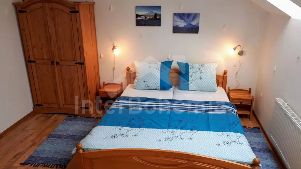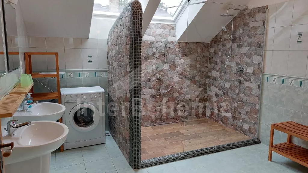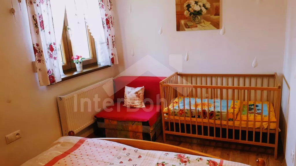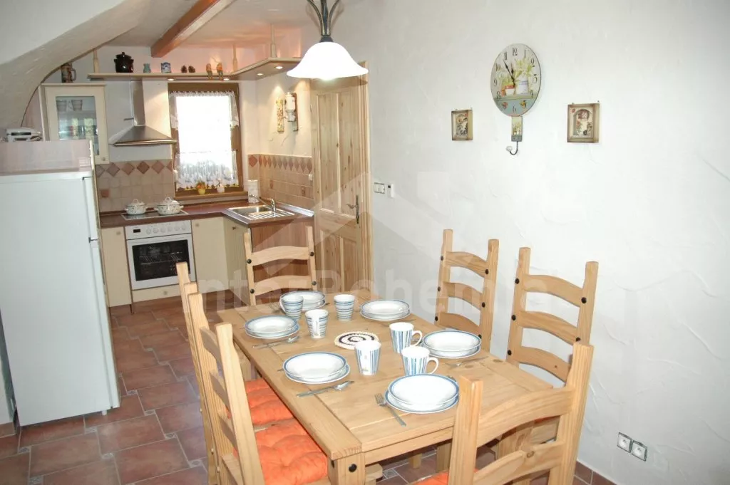 Appartment B in the attic: Entrance and stairs to the first floor. Living room with sofa, satellite TV and DVD, fireplace and access to the balcony. Luxurious open kitchen with gas stove, electric oven, fridge, coffee maker, kettle and microwave. Separate dining room. Beautiful imitation of the tiled stove. Luxury bathroom with two sinks and shower. Separate toilet. Bedroom with a double bed and two single beds. Second bedroom with two single beds and a bunk bed for two younger children (load capacity up to 2x 50 kg). The suite is suitable for up to 4 adults, 2 teenagers and 2 younger children.
