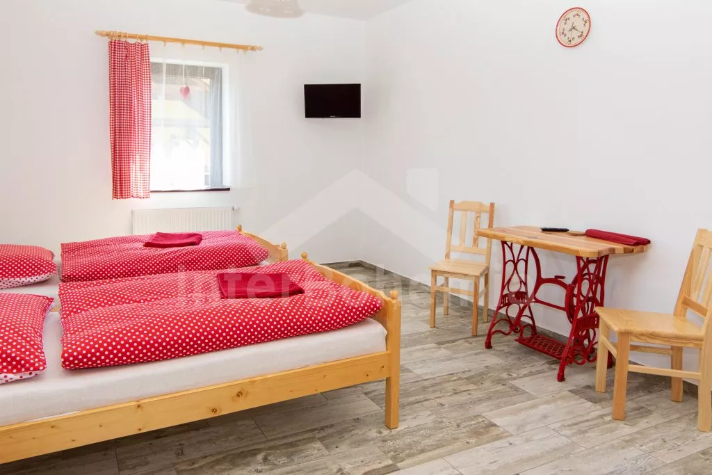 Moderně a jednoduše zařízený apartmán s vlastním vchodem ze společné zahrady. Dvě samostatná lůžka, televize, jídelní stůl pro dvě osoby a kuchyňský kout s malou lednicí, dvouplotýnkovým vařičem, mikrovlnnou troubou, rychlovarnou konvicí a základním kuchyňským vybavením. Koupelna se sprchou, umyvadlem a toaletou. Společná oplocená zahrada nabízí zastřešenou terasu s plynovým grilem, pro děti trampolínu a dřevěný domeček. Dále bazén o průměru 3,6 m, venkovní posezení u ohniště s grilovací kamennou deskou. Zahrada sdílena s dalšími hosty. Parkování na zahradě.