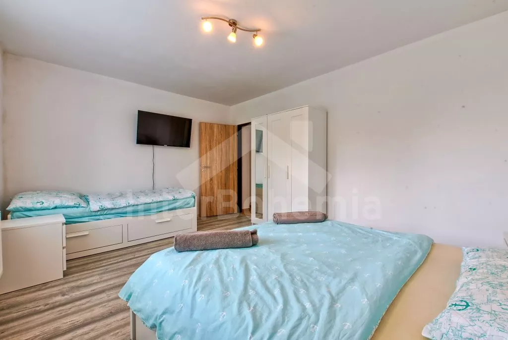 Obýváte nově zrekonstruovaný apartmán (2020) v přízemí rodinného domu. Vstup ze společné chodby. Kuchyně s keramickou varnou deskou, troubou, varnou konvicí, mikrovlnnou troubou, lednicí, mrazákem a jídelním stolem. Ložnice s dvoulůžkem, jednolůžkem (rozložitelné na dvoulůžko) a nástěnnou televizí. Koupelna se sprchovým koutem, umyvadlem a WC. Centrální topení. K dispozici společná zahrada s venkovním posezením a zahradním grilem. Parkování u domu.