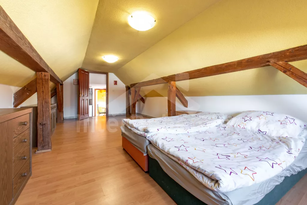 Obýváte podkrovní apartmán prostorného, průběžně rekonstruovaného statku. Obývací pokoj s jídelním stolem, pohovkou, televizí a kuchyňským koutem s elektrickým sporákem a lednicí s mrazákem. První ložnice s dvoulůžkem a dětskou postýlkou. Druhá ložnice se 4 lůžky. Koupelna s vanou, umyvadlem a WC. Kapacita 6 osob.