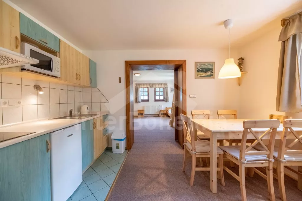 Druhý apartmán situovaný rovněž v přízemí, vstup z haly vpravo. Prostorná obývací místnost spojená s kuchyní. Kuchyňská linka s dvouplotýnkovou sklokeramickou varnou deskou, mikrovlnnou troubou, lednicí, kávovarem, rychlovarnou konvicí a nádobím. V obývacím pokoji jídelní stůl pro 5 osob, sedací souprava pro 5 osob, konferenční stolek a LCD televize se satelitem. Ložnice s dvoulůžkem, dvěma jednolůžky a palandou. Koupelna se sprchovým koutem, umyvadlem a WC.