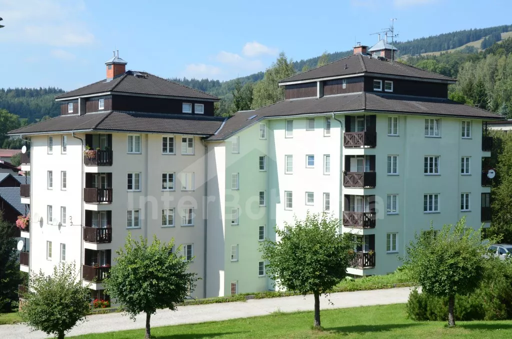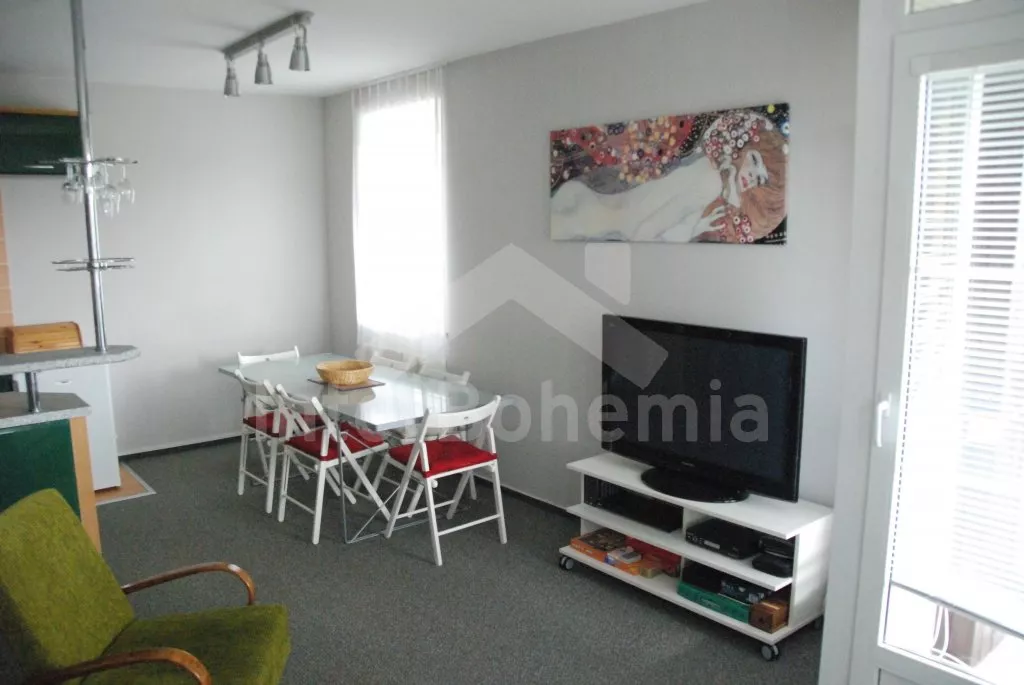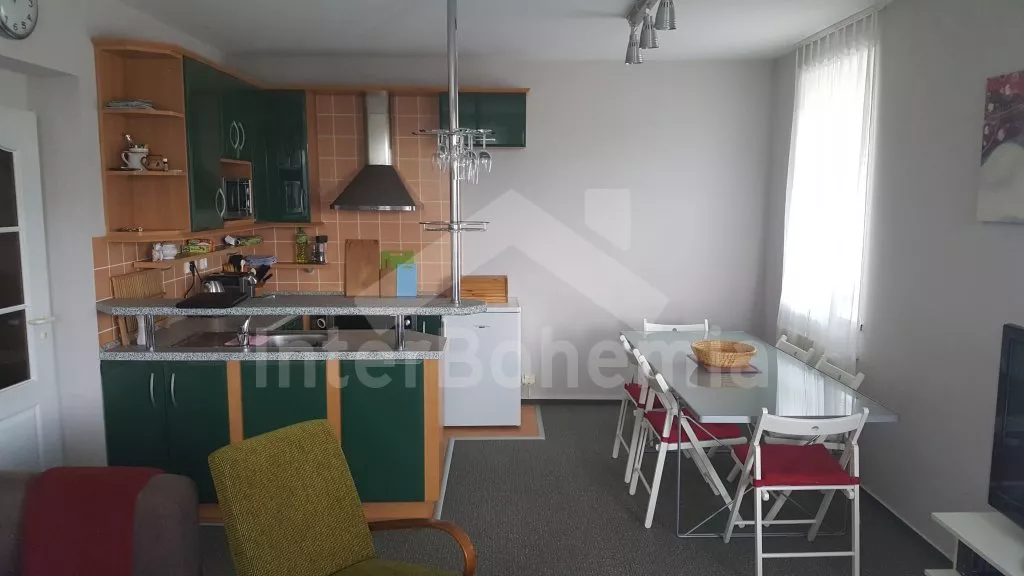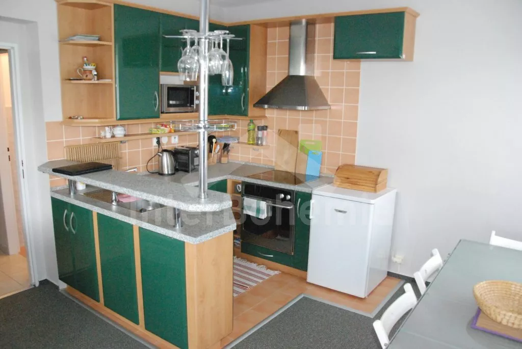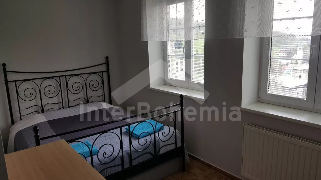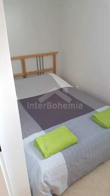 Moderní mezonetové apartmá v apartmánovém domě v 5. patře s výtahem, hezké a pohodlné zařízení. Vstup, chodba, obývací pokoj se sedací soupravou, jídelním stolem pro 6 osob, televizí se set-top-boxem a DVD, vstup na balkon. Otevřená kuchyně s elektrickým sporákem, sklokeramickou varnou deskou, lednicí, mikrovlnnou troubou, kávovarem Dolce gusto a varnou konvicí. Ložnice s dvoulůžkem a posezením. Koupelna s vanou a umyvadlem. WC zvlášť. V horním patře jsou dvě ložnice, jedna malá s dvoulůžkem (140 cm) a druhá s dvoulůžkem a dvěma samostatnými lůžky pro děti. Druhá koupelna se sprchou, umyvadlem a WC. Ústřední topení. Parkování v garáži pro dvě auta.