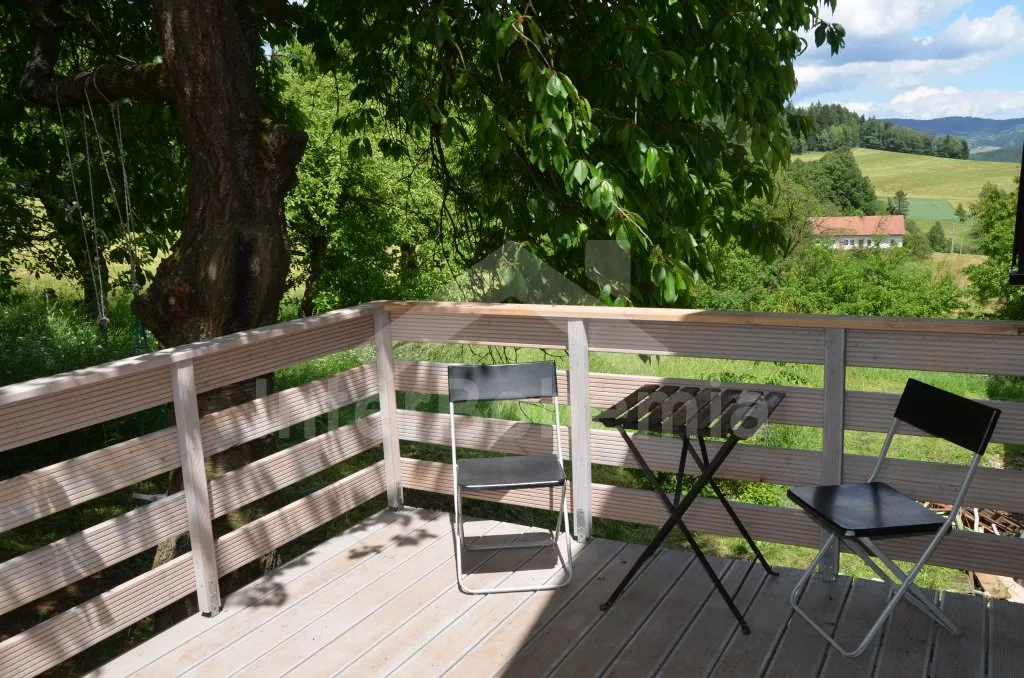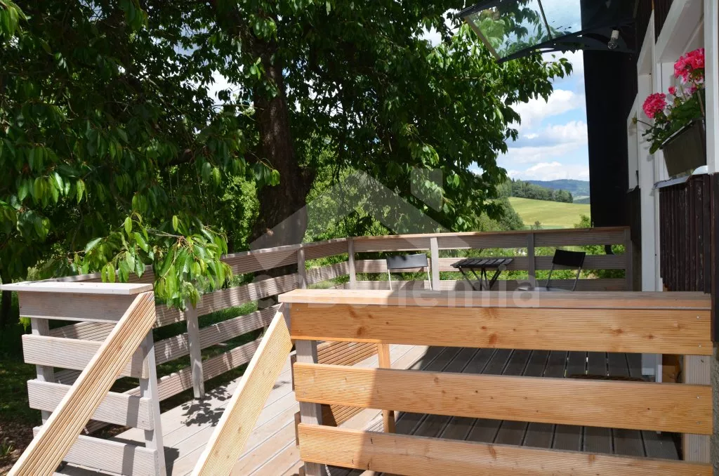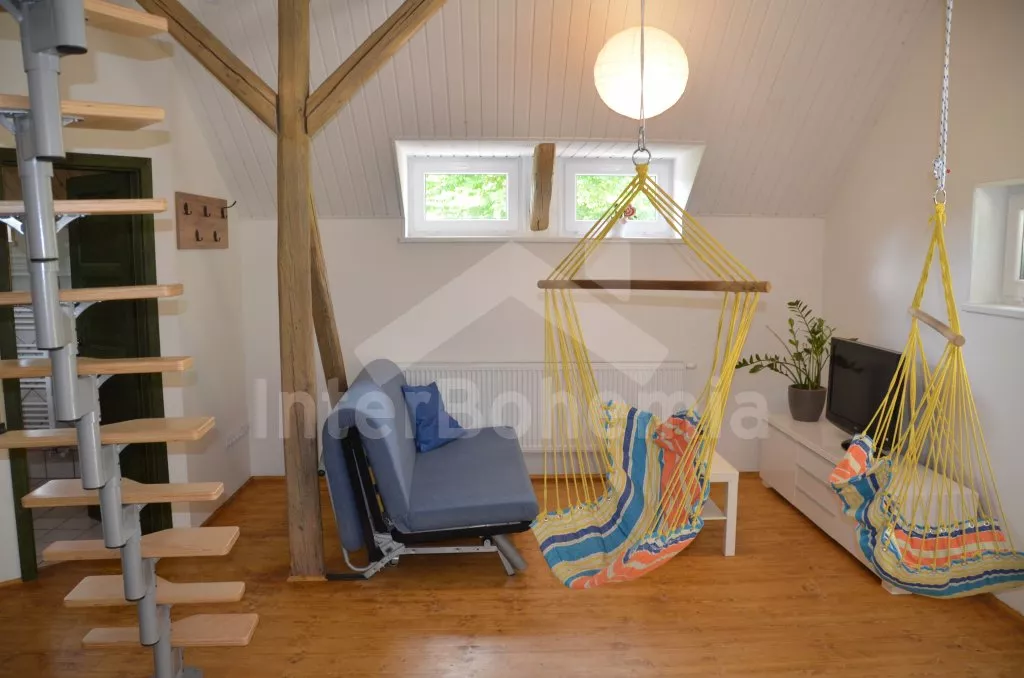 Obýváte polovinu domku, apartmán s vlastním vchodem a terasou. Velmi pěkný a útulný apartmán je v roce 2017 nově postavený, moderně a velmi komfortně zařízený. Vstup přes terasu, obývací pokoj se sedací soupravou, která se skládá ze sedačky pro 3 osoby a dvou závěsných houpaček. Televize se set-top-boxem, jídelní stůl pro 6 osob a moderní, otevřená kuchyně s kombinovanou lednicí s mrazákem, elektrický sporák s horkovzdušnou troubou a sklokeramickou deskou, varnou konvicí. Ložnice s dvoulůžkem, koupelna se sprchou, umyvadlem a WC a patro s otevřenou galerií a dvěma matracemi na zemi jako dvoulůžko. Ústřední topení. Zahrada, terasa, zahradní nábytek, přenosný gril, ohniště, závěsná houpačka. Vlastní parkoviště.