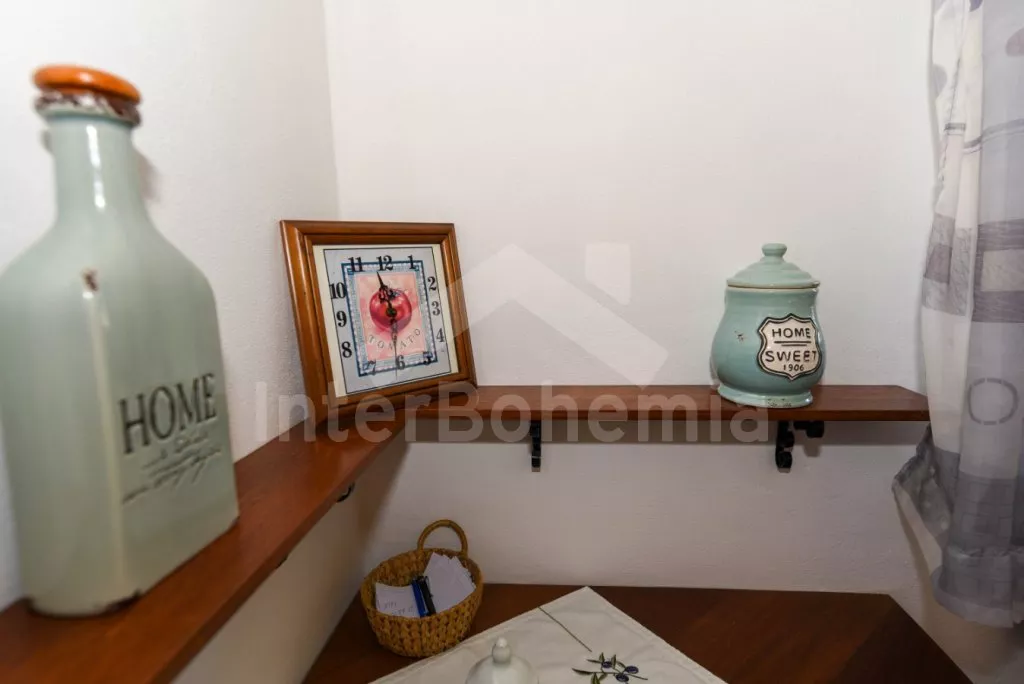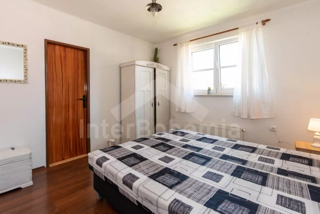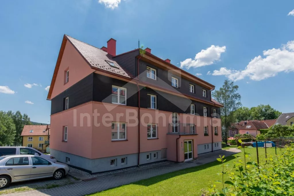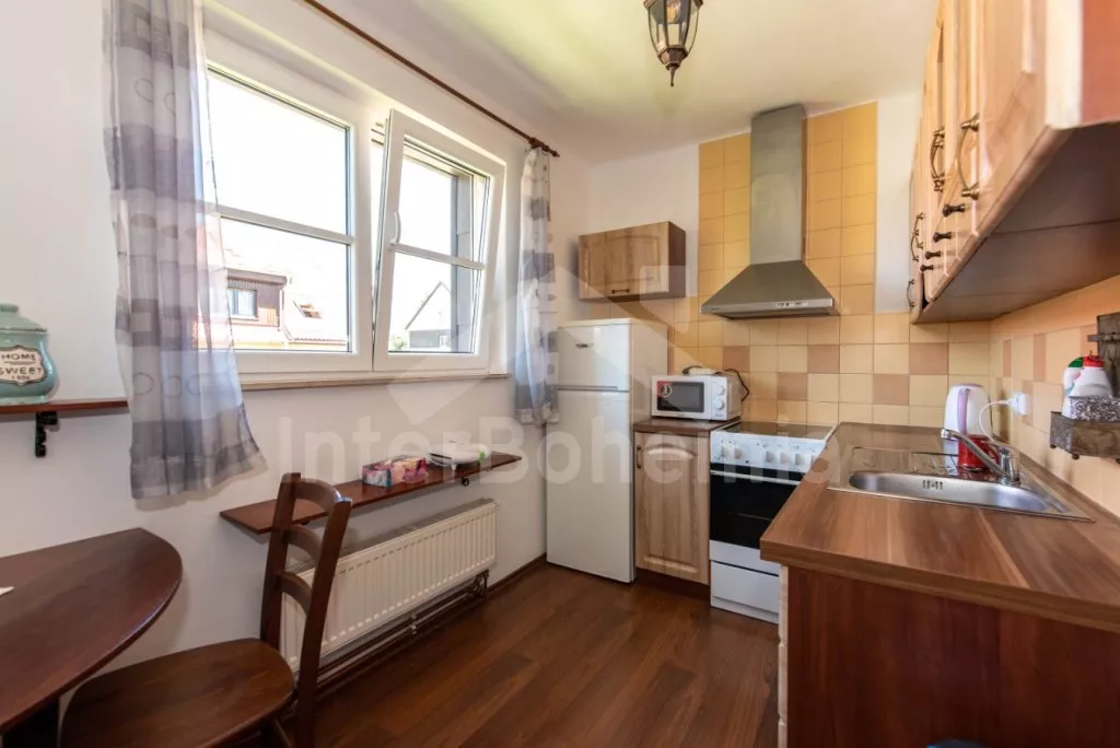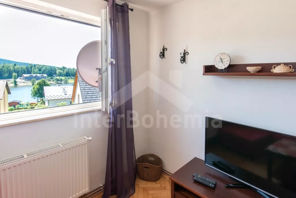 Moderně zařízený apartmán ve druhém patře bytového domu s výhledem na Lipno. Kompletně vybavená kuchyně s elektrickým sporákem, troubou, mikrovlnnou troubou, lednicí, mrazákem, rychlovarnou konvicí a nádobím. Obývací pokoj s pohovkou (extra dvoulůžko) a LCD televizí. Jídelna se stolem po 4 osoby. Dvě samostatné ložnice. První ložnice s dvoulůžkem. Druhá s jednolůžkem rozložitelným na dvě lůžka. Koupelna se sprchou ve vaně a umyvadlem. Samostatné WC. Vytápění objektu centrálně. Hosté mají k dispozici uzamykatelnou kolárnu. Parkování před objektem.