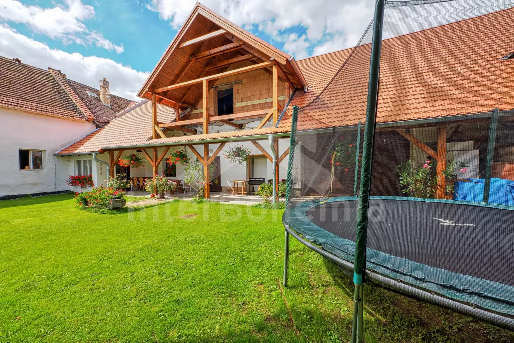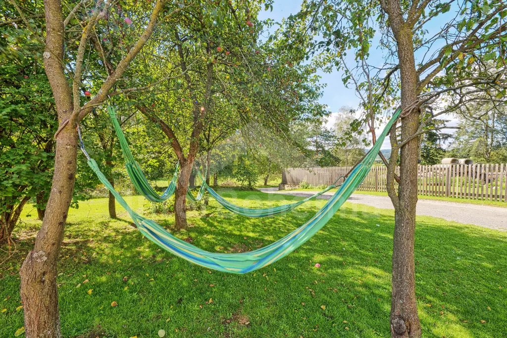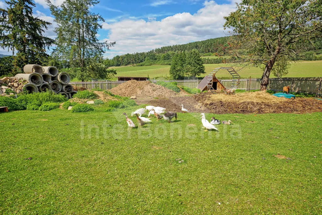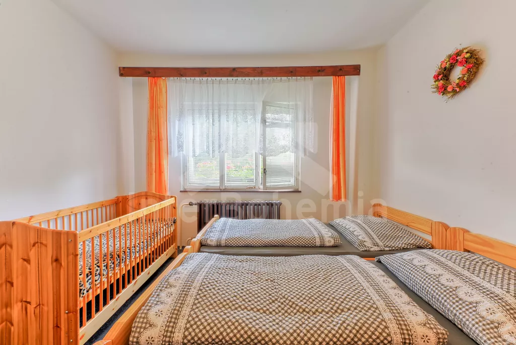 Obýváte apartmá s vlastním vchodem v prvním patře starší usedlosti (bývalý statek) s hospodářskými budovami obklopujícími uzavřený vnitřní dvůr. V přízemní části statku bydlí babička pronajímatele. Vy i Vaše děti možnost vyzkoušet si skutečný život na venkově – můžete krmit a starat se o kozy, ovce a další zvířata, třeba koně. Apartmá je velmi hezky, vkusně a pohodlně zařízeno. Vstup přes verandu, chodba a schody do patra. Zde se nachází prostorný obývací pokoj se sedací soupravou, jídelním stolem pro 4 osoby, televizí a rádiem. Kuchyně s jídelním koutem pro 3 osoby, elektrickým sporákem, lednicí, varnou konvicí a mikrovlnnou troubou. Koupelna s vanou, samostatná toaleta. Tři ložnice – v první a druhé ložnici 1x dvoulůžko a 1x jednolůžko, ve třetí ložnici 3x jednolůžko. Po dohodě a za příplatek možnost přistýlek. Elektrické topení. Uzavřený vnitřní dvůr s posezením, přenosným grilem nebo grilem. Kolem statku je zahrada. Vlastní parkoviště.