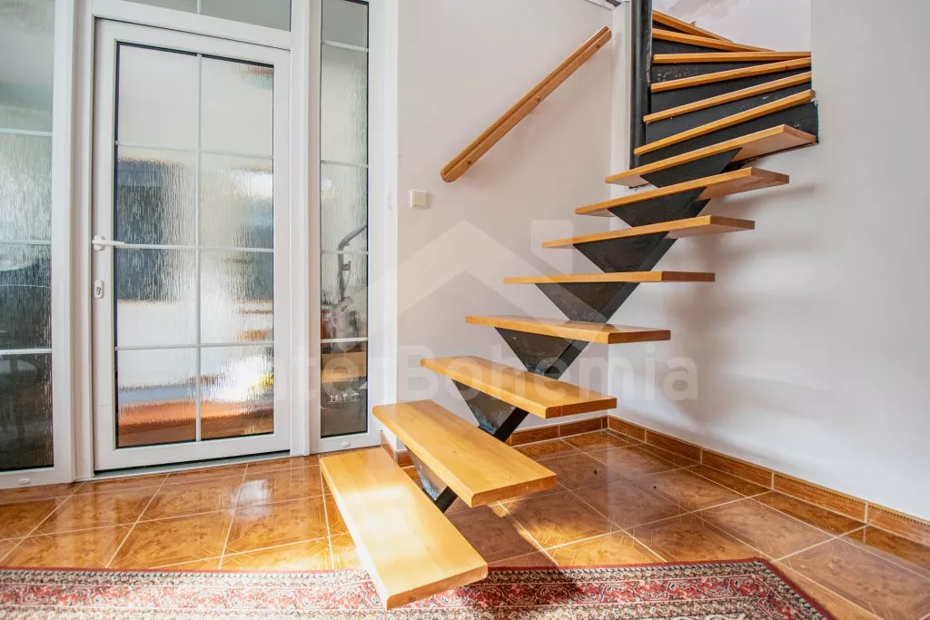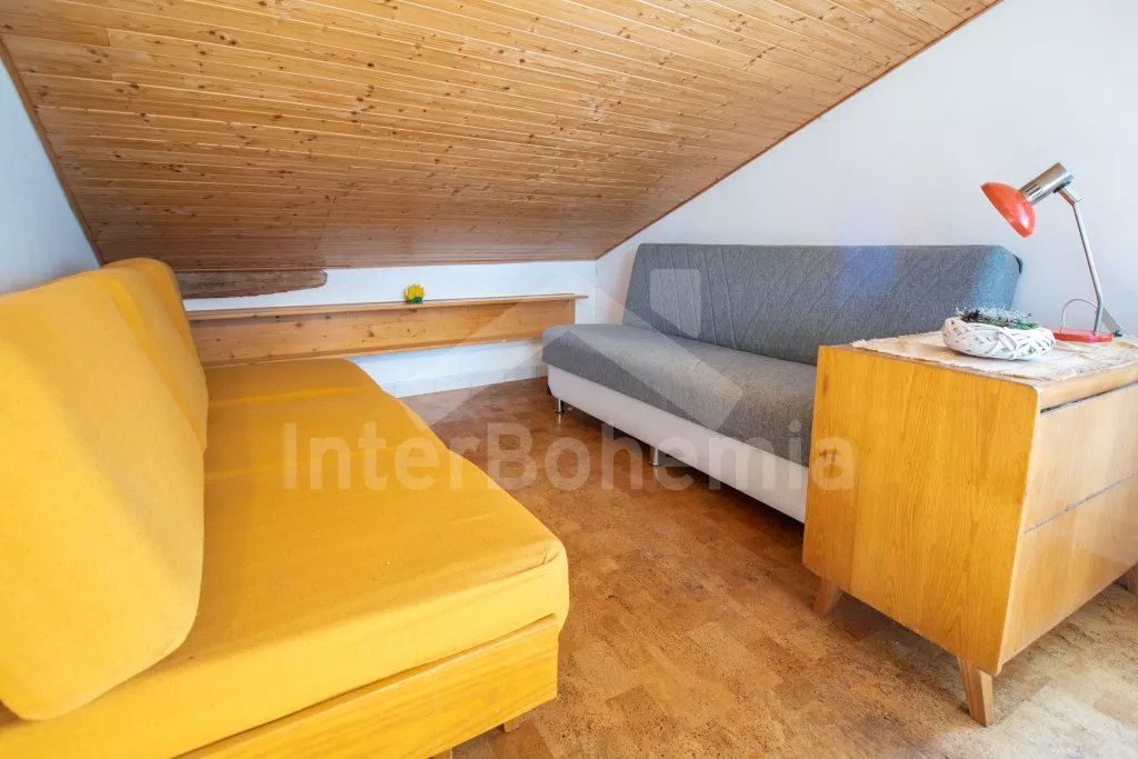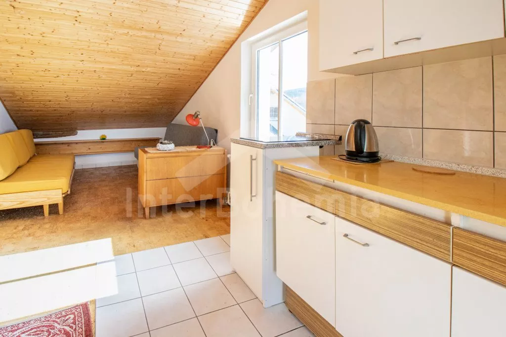 Skromně řešený apartmán studiového typu s vlastním vchodem a zastřešenou terasou. Vstup ze společného dvora. V patře jedna místnost s 2 x rozkládací pohovkou a kuchyňským koutem se sklokeramickou deskou, rychlovarnou konvicí a základním kuchyňským vybavením. K dispozici malá lednička a dětské houpátko. V přízemí koupelna se sprchou, umyvadlem a WC. Objekt je vytápěn ústředním topením. Zastřešená pergola s posezením a přenosným grilem. Parkování před objektem.