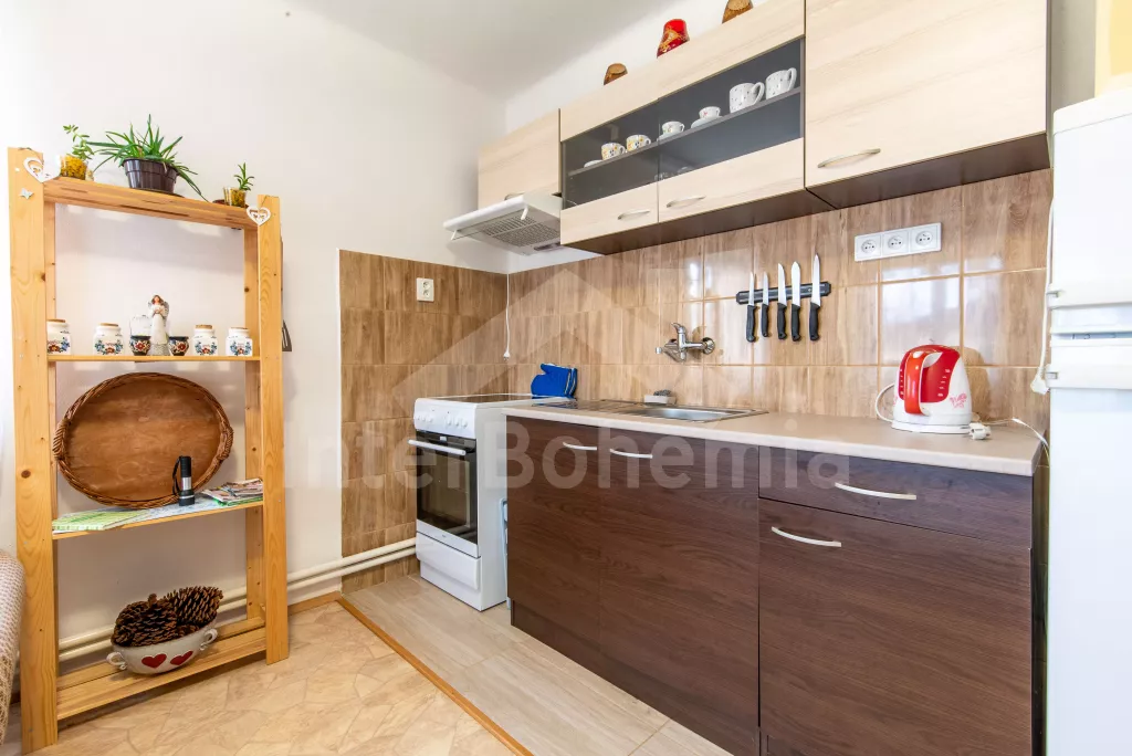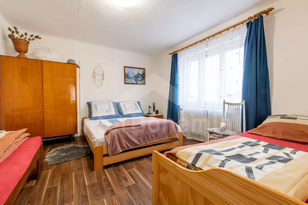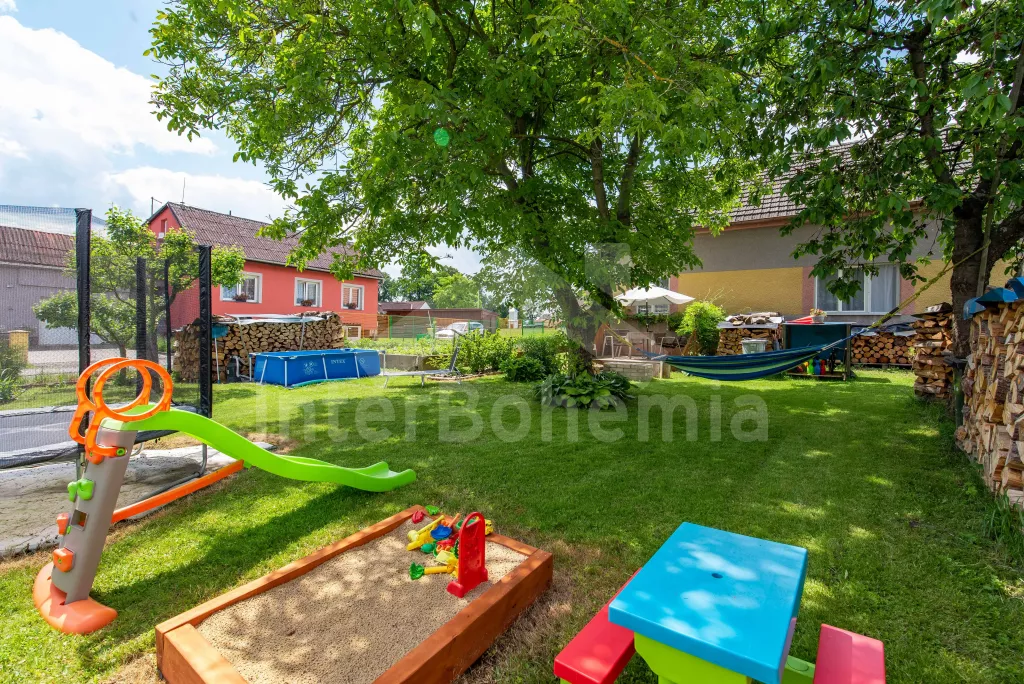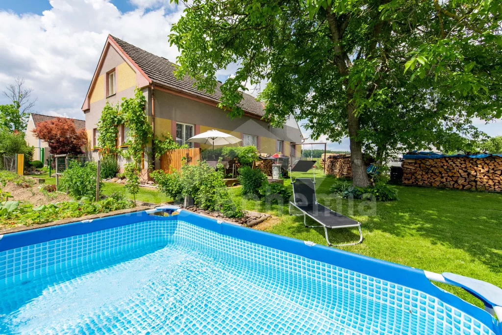 Obýváte přízemní apartmán s vlastním vchodem a oplocenou zahradou s bazénem a pestrým vybavením k rekreaci a relaxaci. Vstup přes verandu a chodbu do obývací místnosti. Zde sedací souprava, jídelní stůl, nástěnná televize a kuchyňský kout s elektrickým sporákem, mikrovlnnou troubou, lednicí, mrazákem, varnou konvicí a nádobím. Ložnice s dvoulůžkem, dvěma jednolůžky a úložným prostorem. Koupelna se sprchovým koutem, umyvadlem a pračkou. Samostatné WC. Možnost úschovy kol ve verandě. Vytápění objektu ústřední. Hosté mohou plně využívat zahradu, kde najdou nadzemní bazén, venkovní posezení se slunečníkem, houpačku, trampolínu a skluzavku pro děti a ohniště. Možnost natrhání si ovoce a zeleniny ze zahrádky (třešně, jahody, hrášek, okurky apod.). Parkování pro 2 vozidla přímo u objektu.