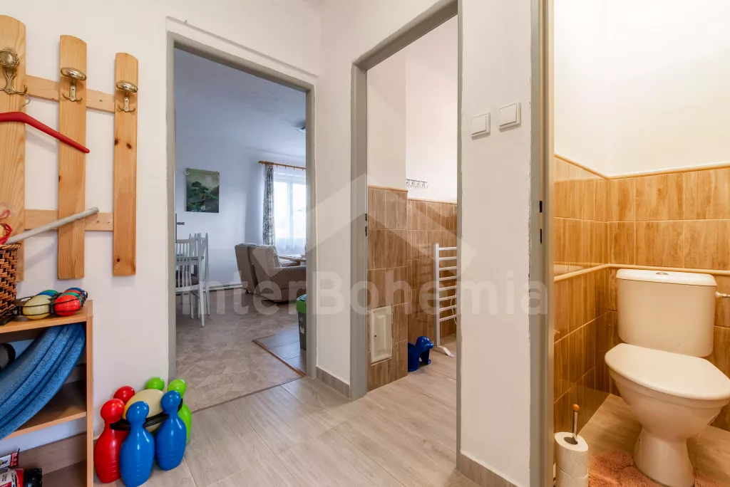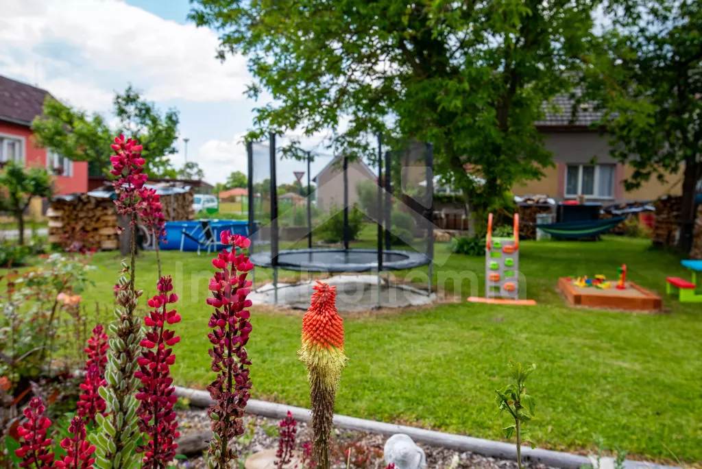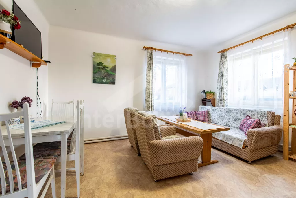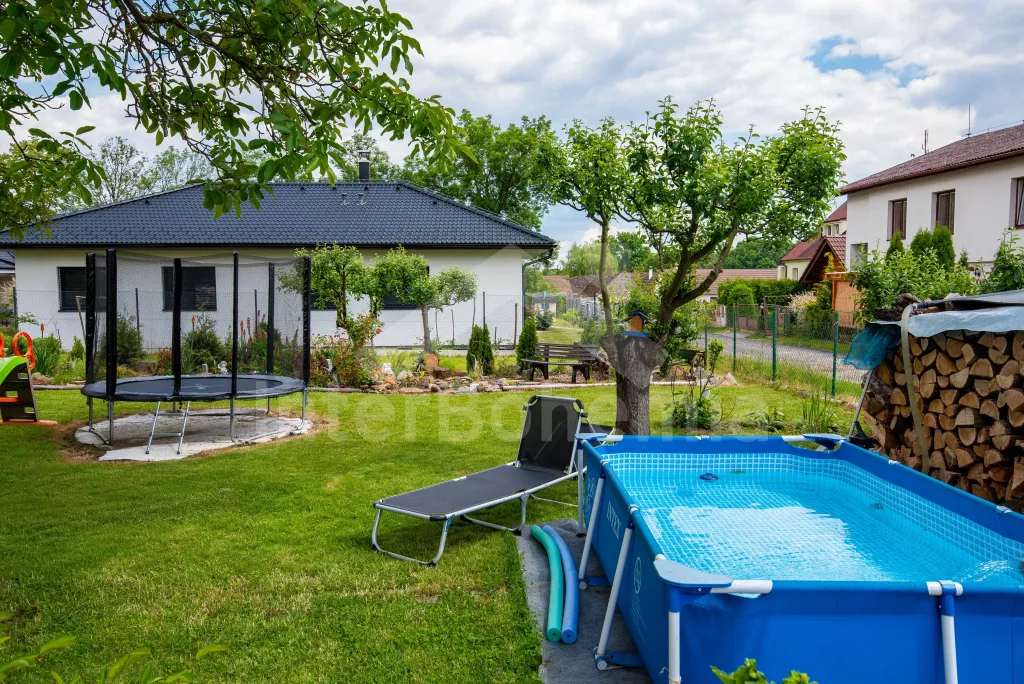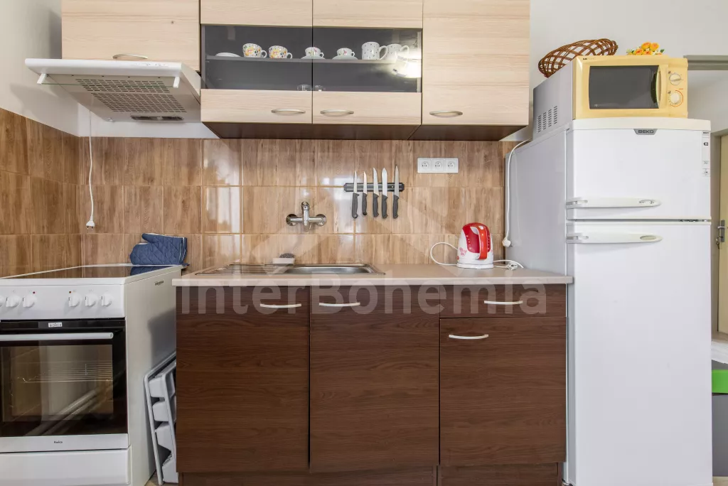 Obýváte přízemní apartmán s vlastním vchodem a oplocenou zahradou s bazénem a pestrým vybavením k rekreaci a relaxaci. Vstup přes verandu a chodbu do obývací místnosti. Zde sedací souprava, jídelní stůl, nástěnná televize a kuchyňský kout s elektrickým sporákem, mikrovlnnou troubou, lednicí, mrazákem, varnou konvicí a nádobím. Ložnice s dvoulůžkem, dvěma jednolůžky a úložným prostorem. Koupelna se sprchovým koutem, umyvadlem a pračkou. Samostatné WC. Možnost úschovy kol ve verandě. Vytápění objektu ústřední. Hosté mohou plně využívat zahradu, kde najdou nadzemní bazén, venkovní posezení se slunečníkem, houpačku, trampolínu a skluzavku pro děti a ohniště. Možnost natrhání si ovoce a zeleniny ze zahrádky (třešně, jahody, hrášek, okurky apod.). Parkování pro 2 vozidla přímo u objektu.