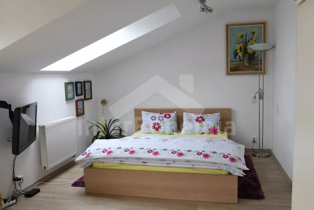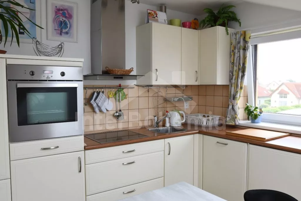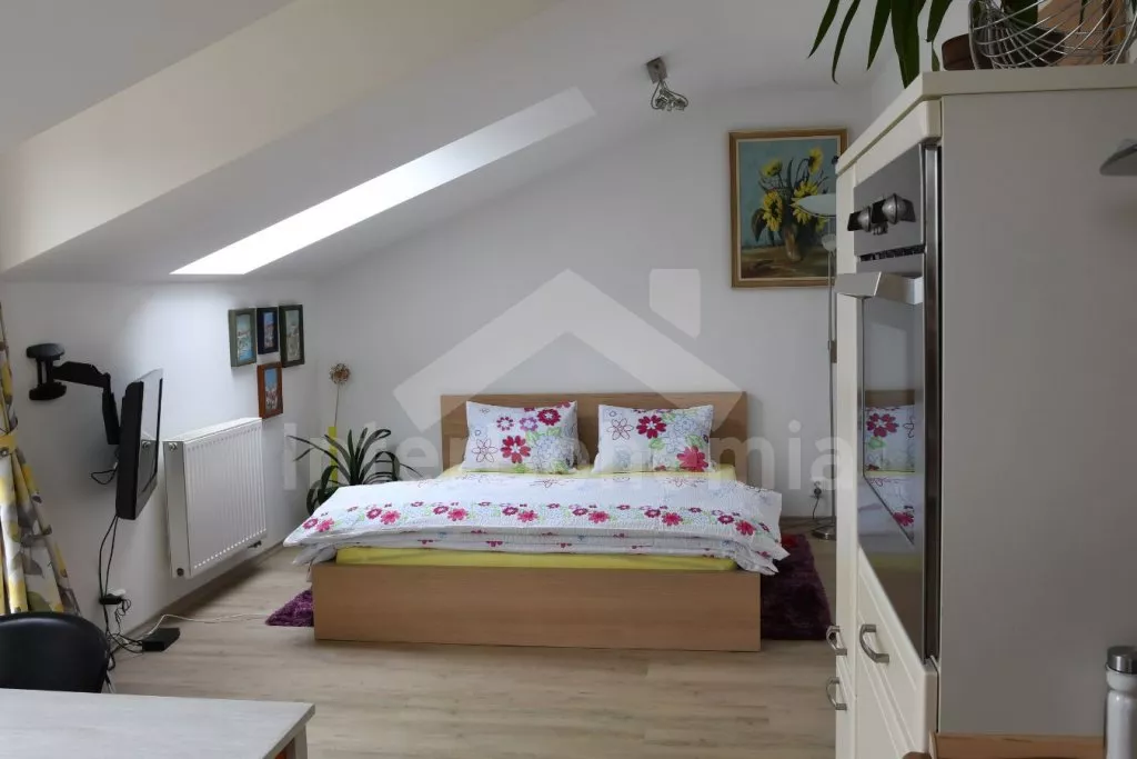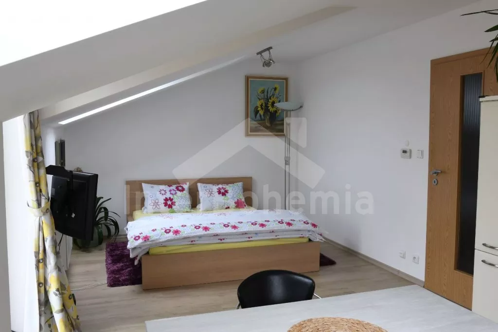 Obýváte podkrovní studio apartmánového domu. Kuchyňský kout se sklokeramickou varnou deskou, troubou, mikrovlnnou troubou, lednicí, rychlovarnou konvicí, nádobím a myčkou na nádobí. V pokoji dále jídelní stůl, LCD televize, dvoulůžko a vstup na balkon. Koupelna se sprchovým koutem, umyvadlem a WC. Objekt je vytápěn plynovým kotlem. K dispozici úložný prostor pro kola. Parkování v prostoru areálu. K dispozici 1 parkovací místo.