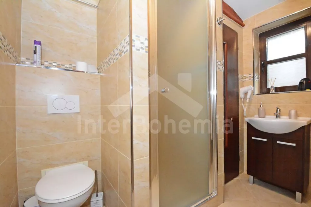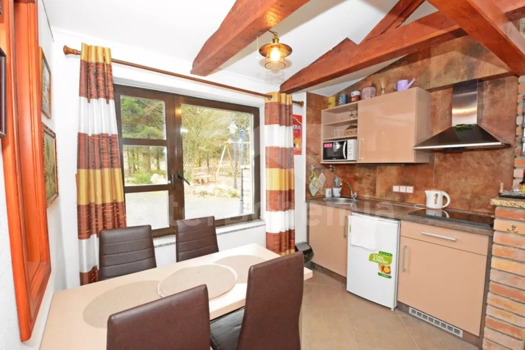 Obýváte pravou část se samostatným vchodem. Vstup, obývací místnost spojená s kuchyní. Kuchyňská linka s indukční dvouplotýnkovou varnou deskou, mikrovlnnou troubou, lednicí s integrovaným mrazákem, rychlovarnou konvicí a nádobím. V obývací místnosti jídelní stůl pro 4 osoby, sedací souprava, palanda, LCD televize se satelitem a krbová kamna. Ložnice s dvoulůžkem a možností lůžka pro osobu do 18 let na podkrovním lůžku. Koupelna se sprchovým koutem, umyvadlem a wc. Vytápění objektu lokální kamny.