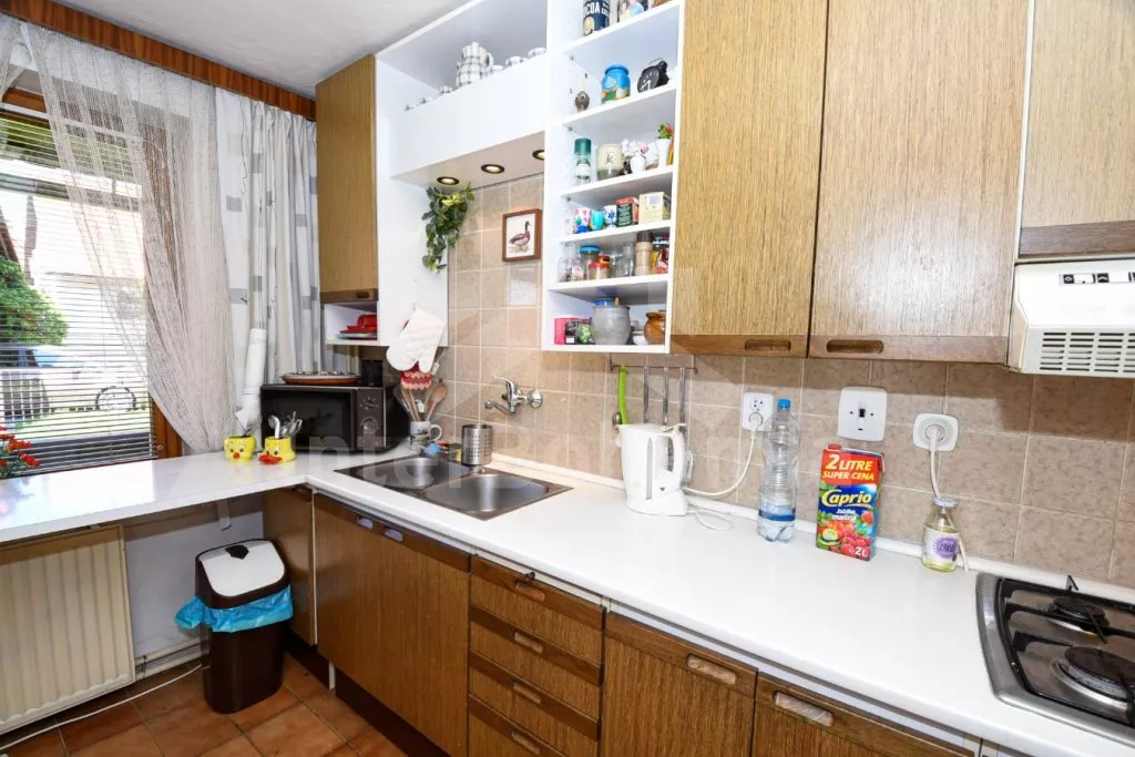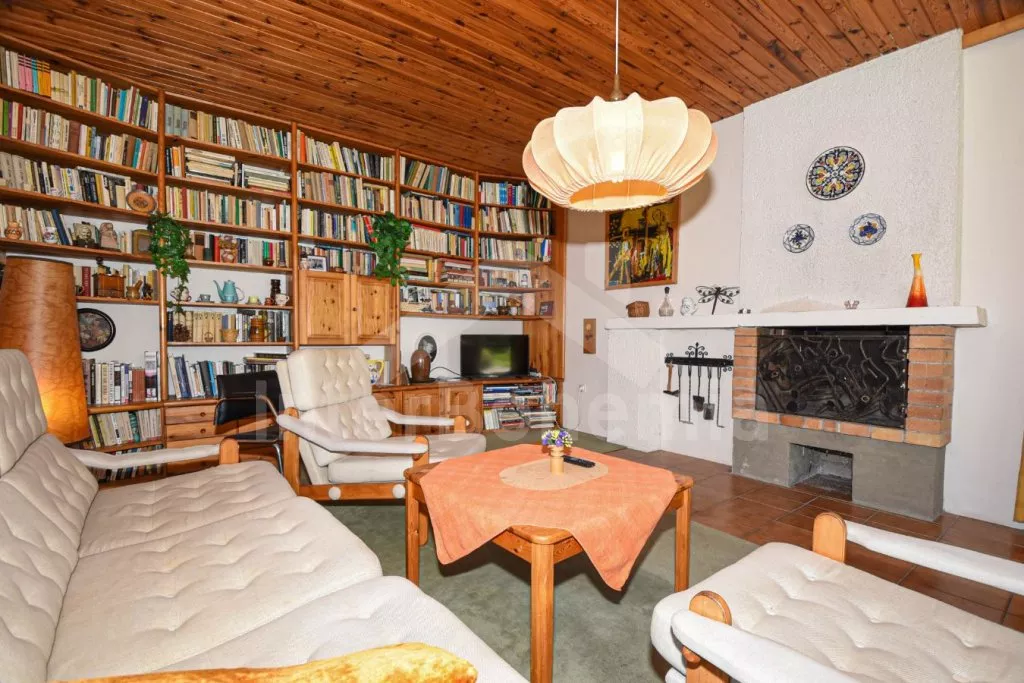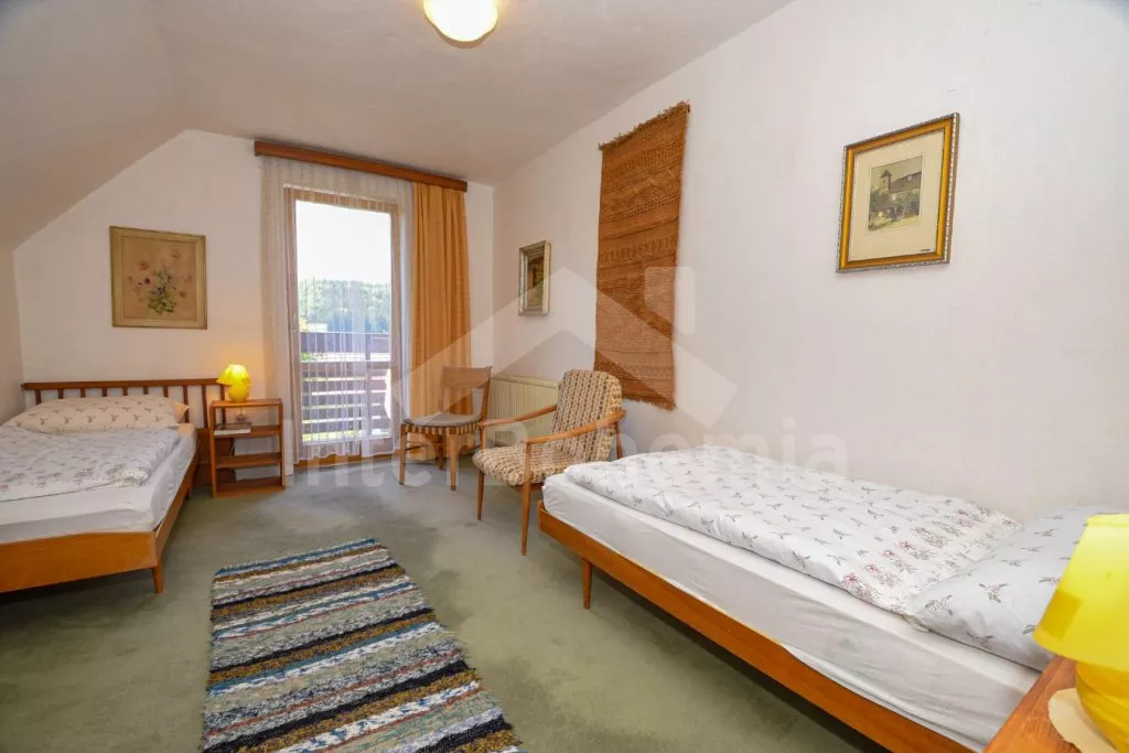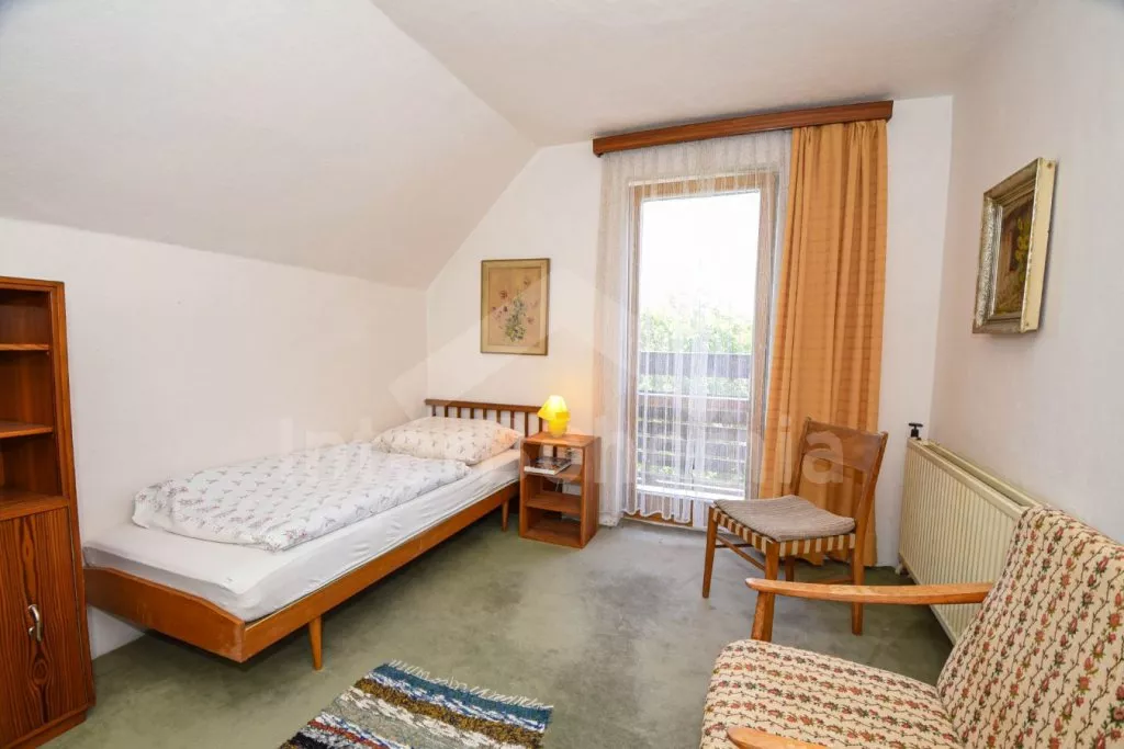 Freistehender Bungalow bequem eingeritet. Eingang, Wohnzimmer mit Sitzgarnitur, Kamin, Sat - TV und Zutritt zur Terrasse. Essraum mit Essecke und Kachelofen. Offene Küche mit Gaskochplatte, elektrischen Ofen, Kühlschrank, Geschirrspüllermaschine, Mikrowelle, Kaffeemaschine und Schnellkochkanne. Toilette. In Oberstock befinden sich 3 Schlafzimmer – erstes mit Doppelbett, zweites und drittes mit 2 Einzelbetten. Balkon. Badezimmer mit Badewanne und 2 Toiletten. Im Untergeschoss gibt es eine Dusche. Das Haus steht auf einem großen umzäunten Grundstück mit Garten, auf dem sich ein weiteres Haus des Besitzers befindet. Sie verfügen über eine Terrasse mit Gartenmöbeln un Liegestühlen, Feuerstelle, Sandkasten und einem tragbaren Grill. Zentralheizung und Heizung durch den Kamin. Privater Parkplatz.