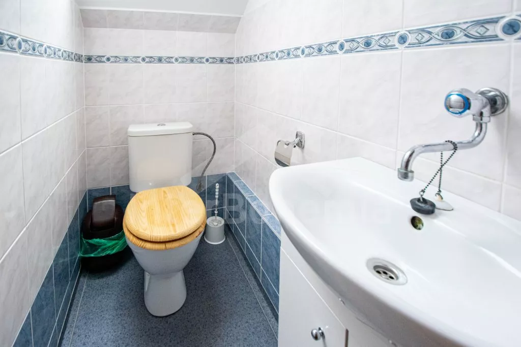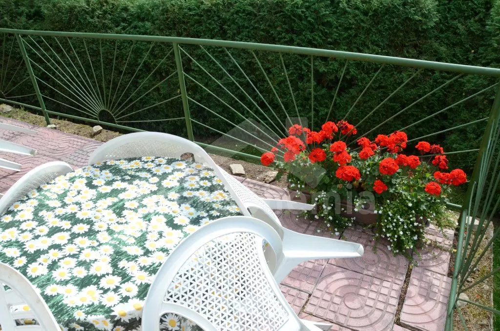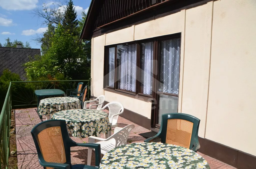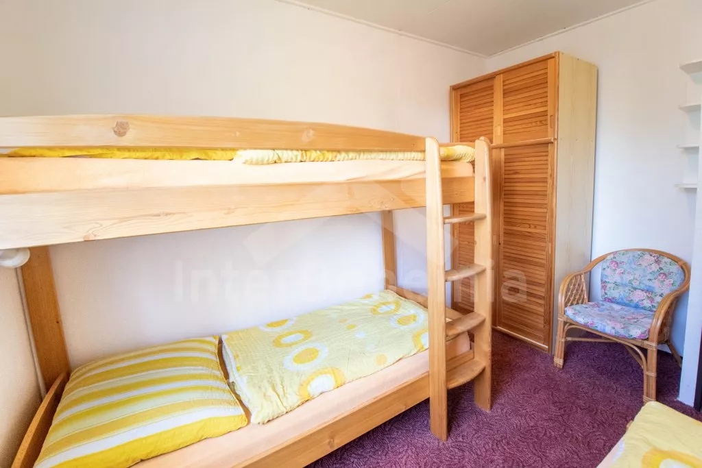 Freistehender, im Jahre 2010 zum Teil renovierter Bungalow. Eingang, Wohnzimmer mit zwei Couchen (zugleich zwei Betten), TV und Radio. Küche mit Esstisch für 12 Personen, Elektroherd, Kühlschrank, Schnellkochkanne, Mikrowelle und Geschirrspülmaschine. Schlafzimmer mit einem Etagenbett und einem Einzelbett. Separate Toilette. In Oberstock befinden sich andere zwei Schlafzimmer – das erste mit einem Doppelbett, einem Einzelbett und einem Klappsessel (zugleich ein Extrabett) und das zweite Schlafzimmer mit einem Doppelbett, zwei Einzelbetten, einem Klappsessel (zugleich ein Extrabett) und Zutritt zum Balkon. Badezimmer mit Dusche, zweite separate Toilette. Lokale elektrische Heizung. Der Bungalow steht auf eigenem Grundstück von ca. 3000 m2 (zusammen mit anderen 4 Bungalows, die voneinander mit einer Hecke getrennt sind). Zur Verfügung steht Terrasse mit Gartenmöbel, Sonnenschirm, übertragbarer Grill und Feuerstelle. Parken auf dem Grundstück.
