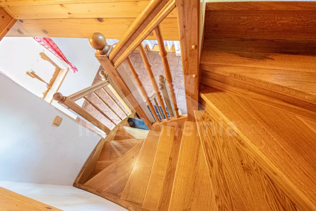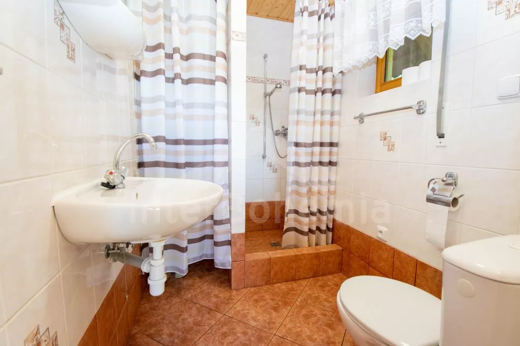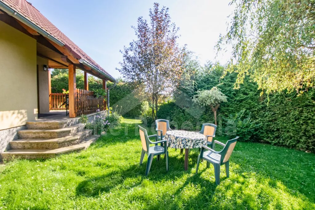 Freistehender Bungalow, im Jahre 2004 neu gebaut und gut gepflegt. Eingang, Flur, Wohnzimmer mit Sitzgarnitur für 4 Personen, Esstisch, Kaminofen, Sat-TV und Zutritt zu überdachter Terrasse. Offene Küche mit Elektroherd, Kühlschrank, Schnellkochkanne und Mikrowelle. Badezimmer mit Dusche und Toilette. In Oberstock befindet sich kleine Halle und zwei Schlafzimmer – ein mit einem Doppelbett und einem Einzelbett und zweites mit drei Einzelbetten. Heizung mit Kaminofen. Schöner, aber nicht umzäunter Garten ist gut gepflegt. Zur Verfügung steht Gartenmöbel, übertragbarer Grill und Schaukel. Eigener Parkplatz für 2 Autos (hintereinander).