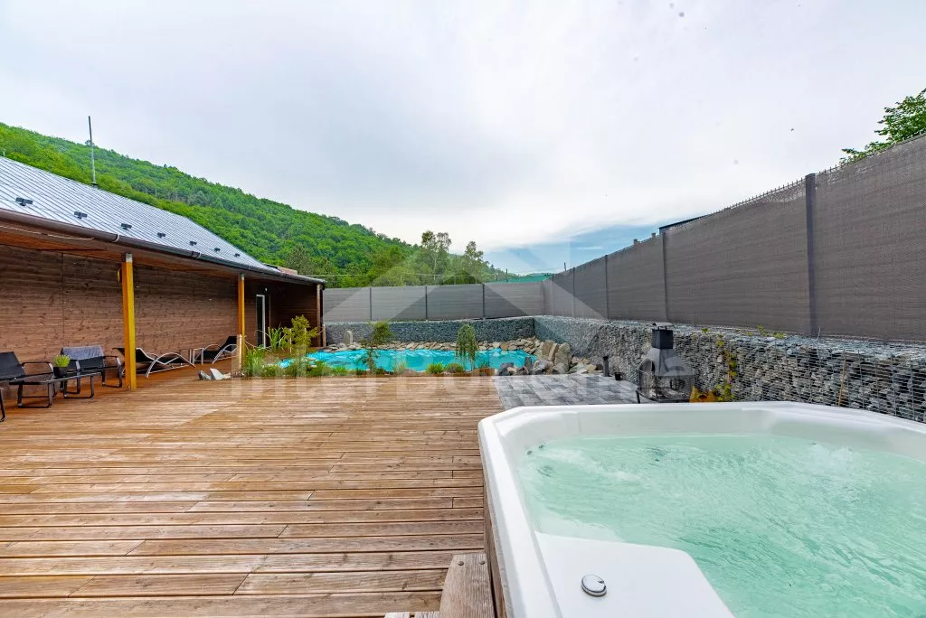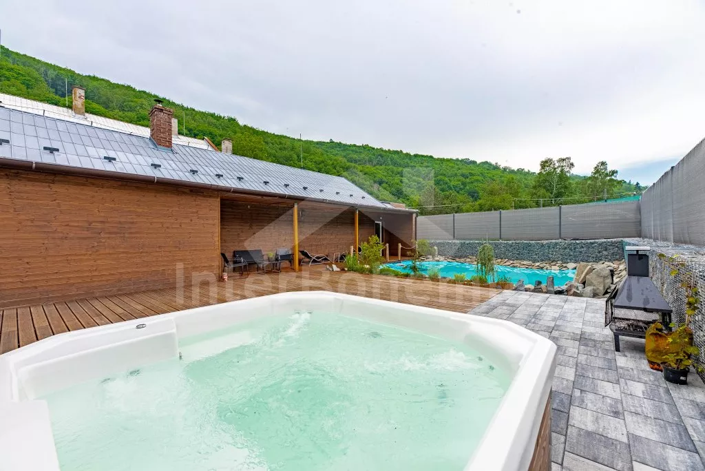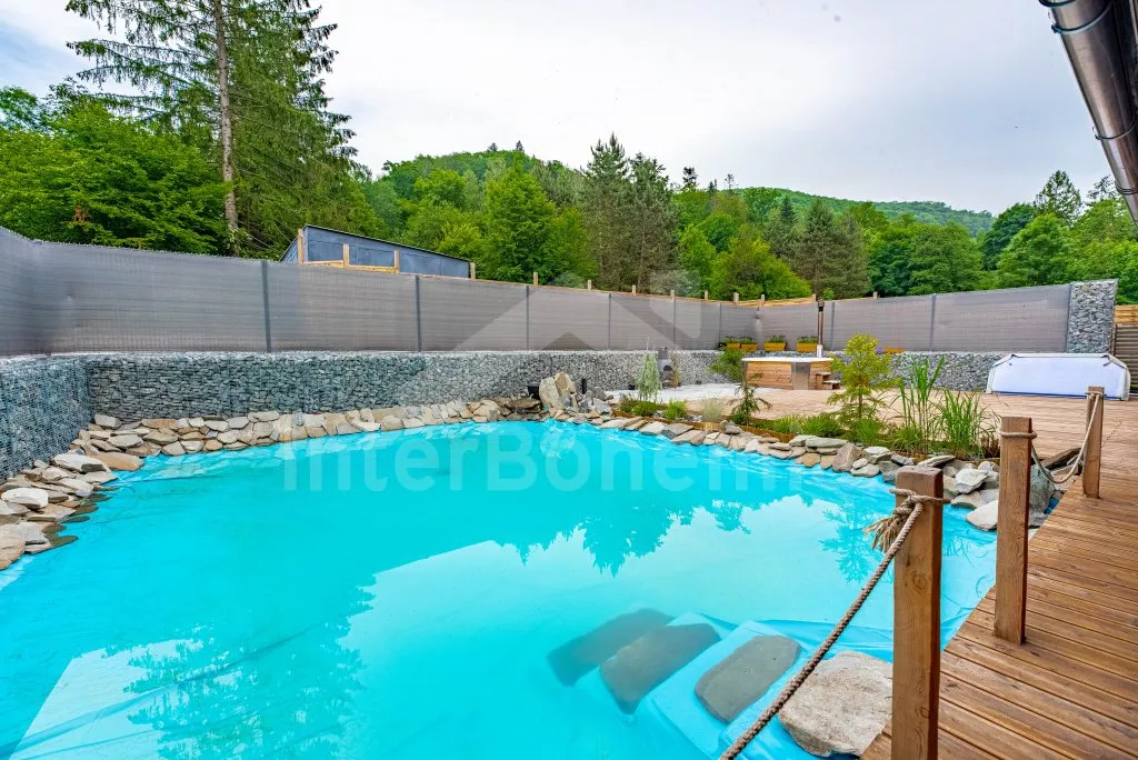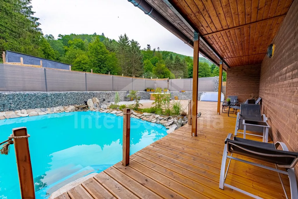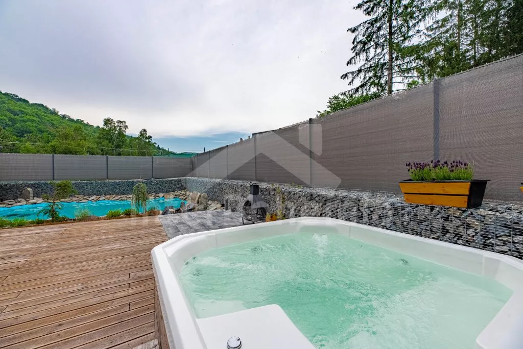 U bewoont een luxe wellness chalet apart gelegen op een 12.000 m2 groot terrein, het chalet zelf wordt begrensd door een muur, privacy op het perceel of in de whirlpool is daarmee gegarandeerd. L-vormig huis, de keuken staat in verbinding met de eetkamer (tafel voor 4 personen). Keuken met keramische kookplaat, oven, magnetron, koelkast met vriezer, koffiezetapparaat, waterkoker en keukengerei. De keuken sluit aan op een ruime woonkamer met een grote bank (extra bed voor 2 personen), salontafel en lcd tv. Achterin de aangrenzende slaapkamer met een tweepersoonsbed. Badkamer met douche, wastafel, toilet en vloerverwarming. Verwarming is elektrice en middels de open haard. Gasten hebben de beschikking over een sauna, omheinde privétuin, tuinmeubelen, gasbarbecue, bubbelbad (4-5 personen), zwembad (10m x 7m) met ligstoelen en een draagbare open haard. Parkeren op een afgesloten terrein voor 2 auto's.