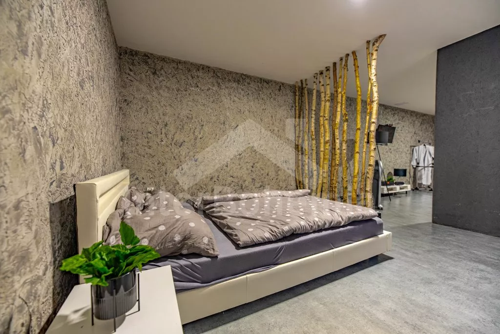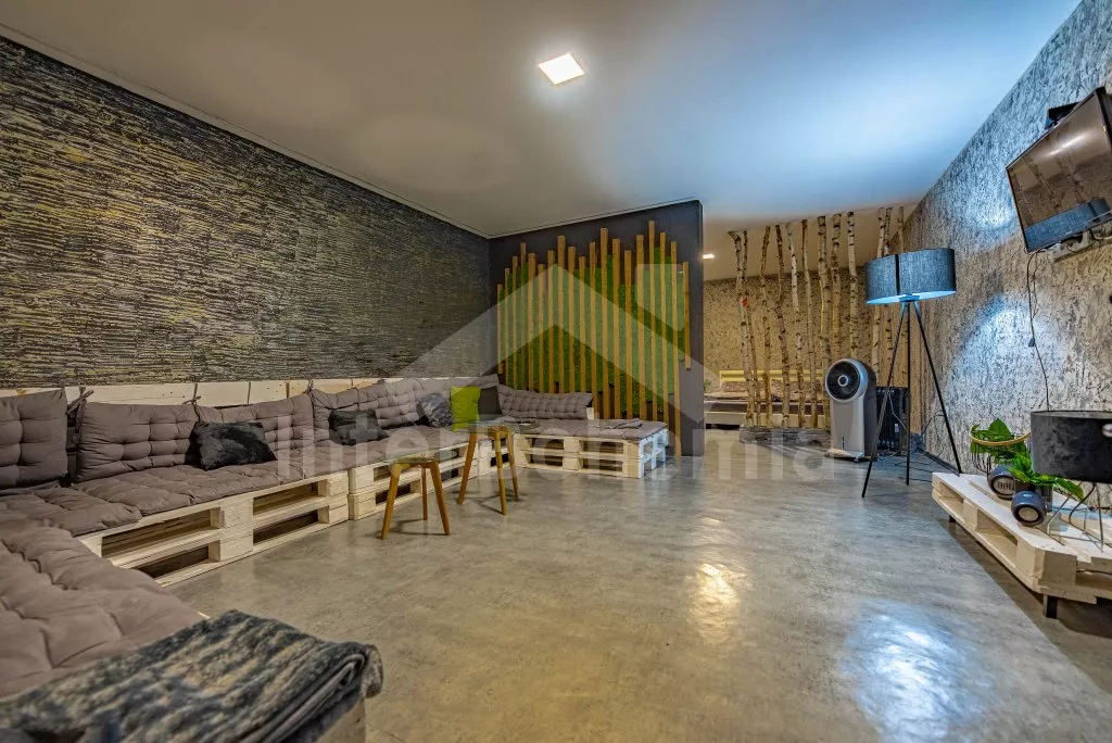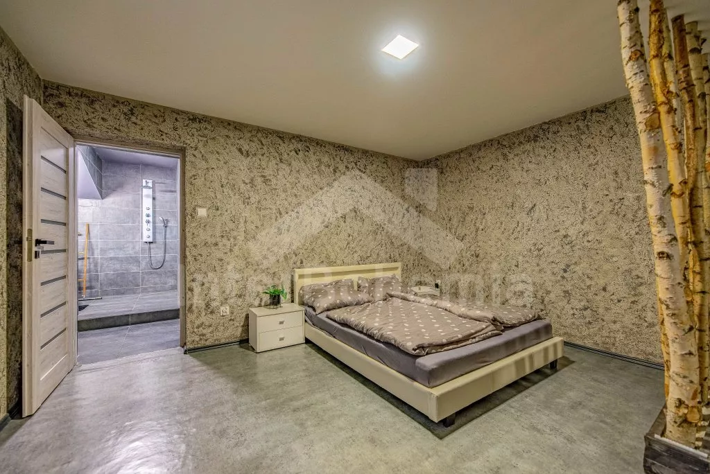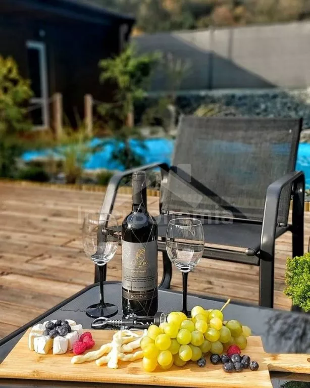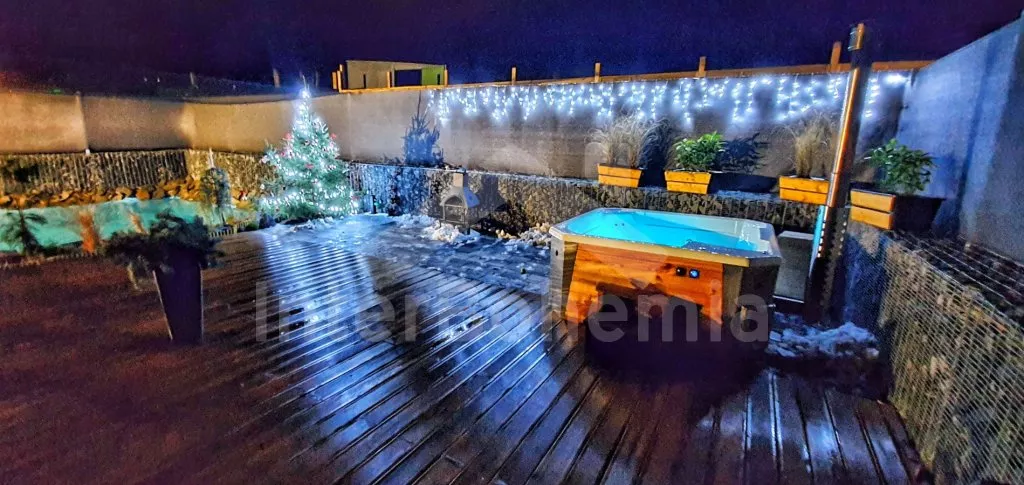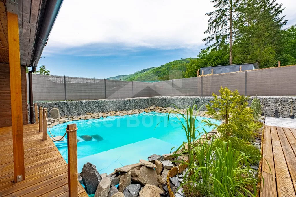 U bewoont een luxe wellness chalet apart gelegen op een 12.000 m2 groot terrein, het chalet zelf wordt begrensd door een muur, privacy op het perceel of in de whirlpool is daarmee gegarandeerd. L-vormig huis, de keuken staat in verbinding met de eetkamer (tafel voor 4 personen). Keuken met keramische kookplaat, oven, magnetron, koelkast met vriezer, koffiezetapparaat, waterkoker en keukengerei. De keuken sluit aan op een ruime woonkamer met een grote bank (extra bed voor 2 personen), salontafel en lcd tv. Achterin de aangrenzende slaapkamer met een tweepersoonsbed. Badkamer met douche, wastafel, toilet en vloerverwarming. Verwarming is elektrice en middels de open haard. Gasten hebben de beschikking over een sauna, omheinde privétuin, tuinmeubelen, gasbarbecue, bubbelbad (4-5 personen), zwembad (10m x 7m) met ligstoelen en een draagbare open haard. Parkeren op een afgesloten terrein voor 2 auto's.