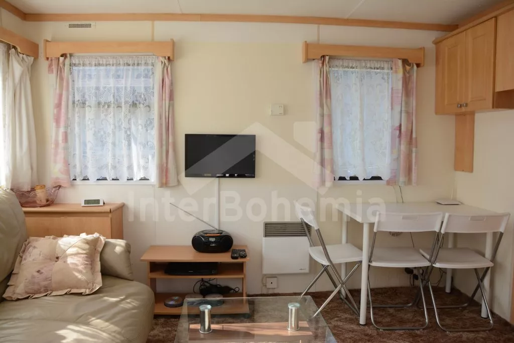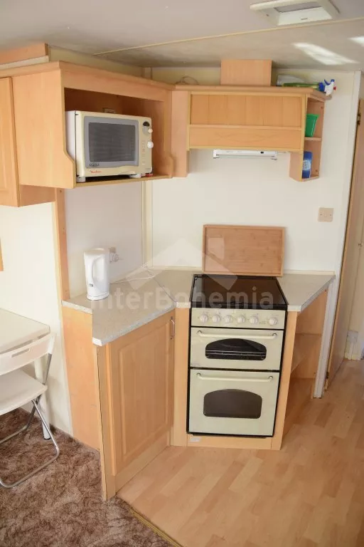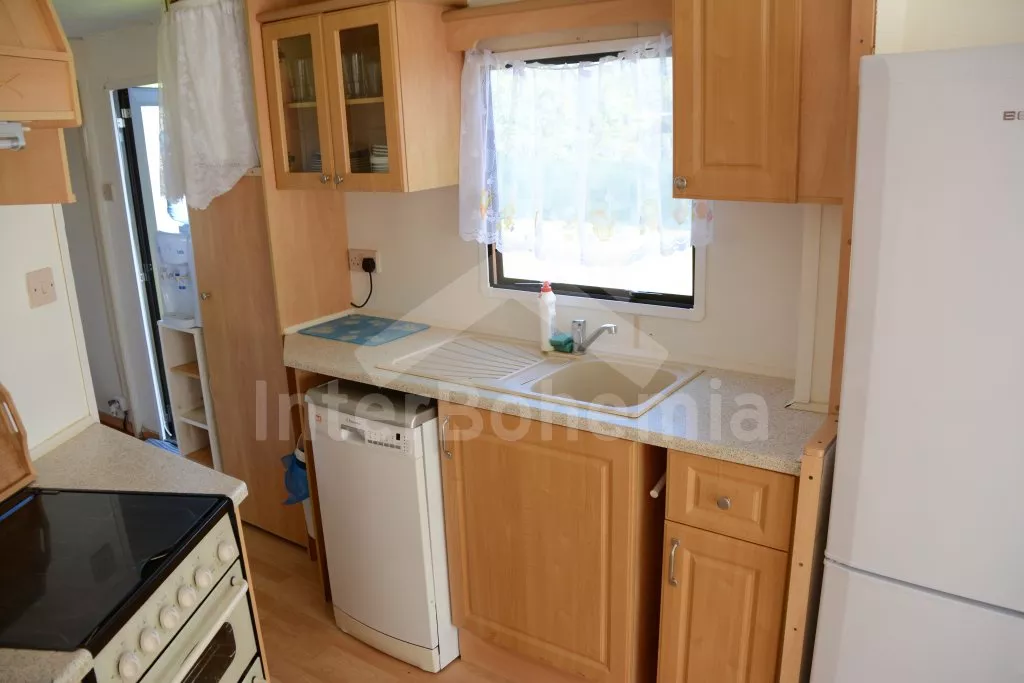 Stacaravan op eigen omheind grondstuk, gezellig en stijlvol ingericht. Entree, hal, keuken met oven met keramische kookplaat, waterkoker, koelkast met vriesvak, magnetron en vaatwasser. Woonkamer met een slaapbank voor 3 personen, TV, DVD, radio, salontafel en een eettafel voor 3 personen. Vanuit de hal toegang tot de badkamer met wastafel, douche en toilet. Aan de linkerkant van de gang is een kleine slaapkamer met een éénpersoonsbed. Aan het einde van de gang tweede slaapkamer met een tweepersoons bed. Stoken middels verwarmingswarmtepomp en elektrische kachels. Airconditioning . Eigen tuin met overdekt terras, tuinstoelen, tuinhaard met barbecue, schommel en kegels. Parkeren voor de tuin.