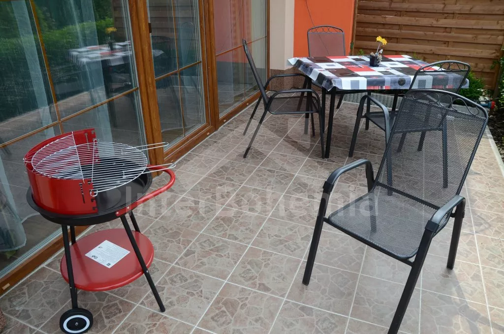 Bungalow (Doppelhaus), in 2012 gebaut, modern und gemütlich eingerichtet, komplett im Erdgeschoss. Sie bewohnen Ihren Bungalow mit eigenem Eingang, überdachter Parkplatz und Terrasse. Eingang, Flur, Wohnzimmer mit Luxus-Bestuhlung, Sat-TV, Esstisch für 4 Personen und Zugang zur Terrasse. Offene Küche mit Elektroherd mit 4 Kochplatten, Backofen und Dunstabzugshaube, Kühlschrank, Mikrowelle und Wasserkocher. Zwei Schlafzimmer, eines mit Doppelbett und Zustellbett und eines mit zwei Einzelbetten. Badezimmer mit Dusche, Waschbecken und Toilette. Elektrische Fußbodenheizung. Der Bungalow steht zusammen mit einem anderen Bungalow auf einem eingezäunten Grundstück, mit Mitbenutzung des Pools 7 x 3,5 x 1,5 m mit Filteranlage, Sandkasten und Klettergerüst. Parkplatz beim Haus.