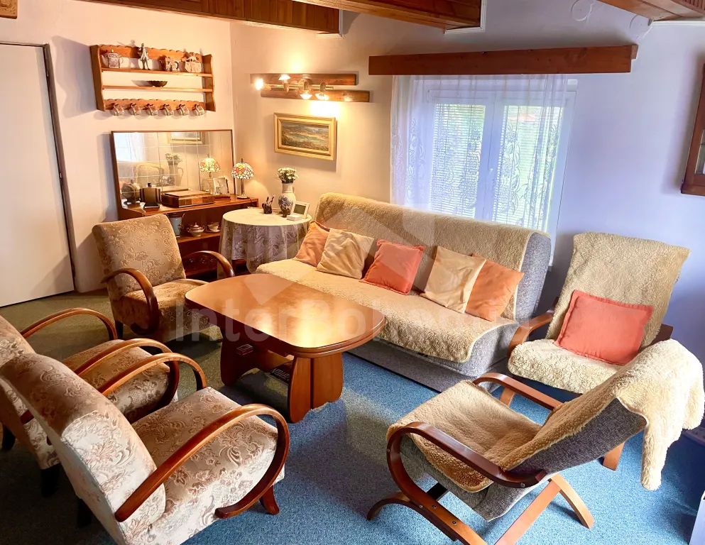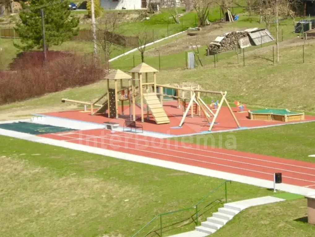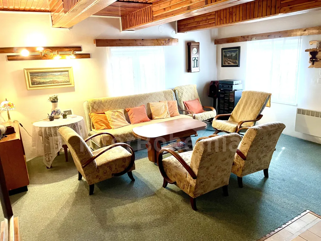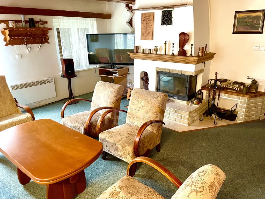 Volně stojící chalupa se zastřešenou pergolou a prostornou zahradou. Kuchyně s jídelním koutem je vybavena el. sporákem s troubou, mikrovlnnou troubou, rychlovarnou konvicí, lednicí s mrazákem a základním kuchyňským vybavením. Obývací místnost s krbem (dekorační), TV, sedací soupravou a konferenčním stolkem. Ložnice s dvoulůžkem a kvalitními matracemi. Koupelna se sprchou, umyvadlem, automatickou pračkou a WC. V patře druhá ložnice s 2x dvoulůžkem a třetí ložnice s 2x jednolůžkem. Elektrické vytápění objektu + přímotop. K dispozici garáž na úschovu jízdních kol. Oplocená prostorná zahrada se zastřešenou pergolou s posezením. K dispozici venkovní ohniště, venkovní gril a šipky. Parkování před pozemkem a v blízkosti objektu.