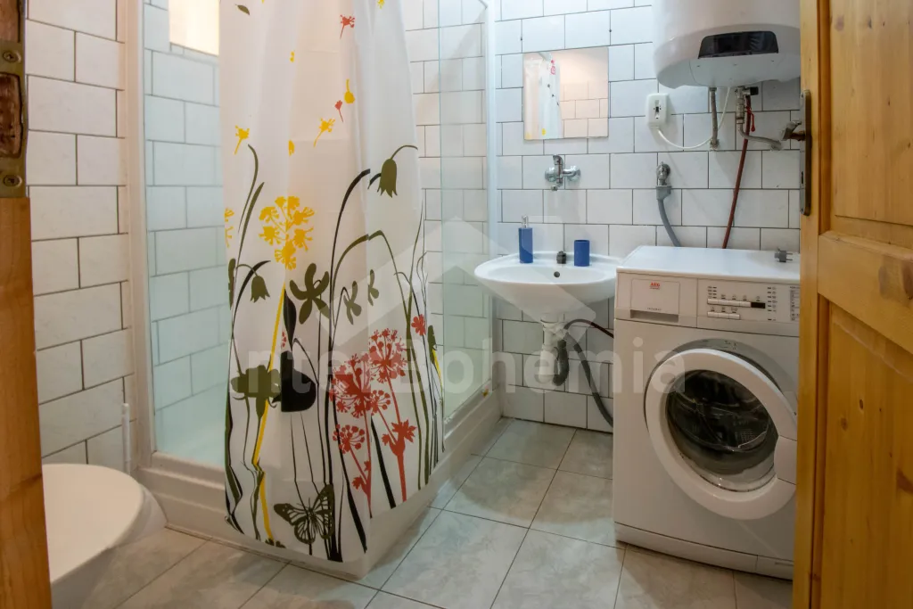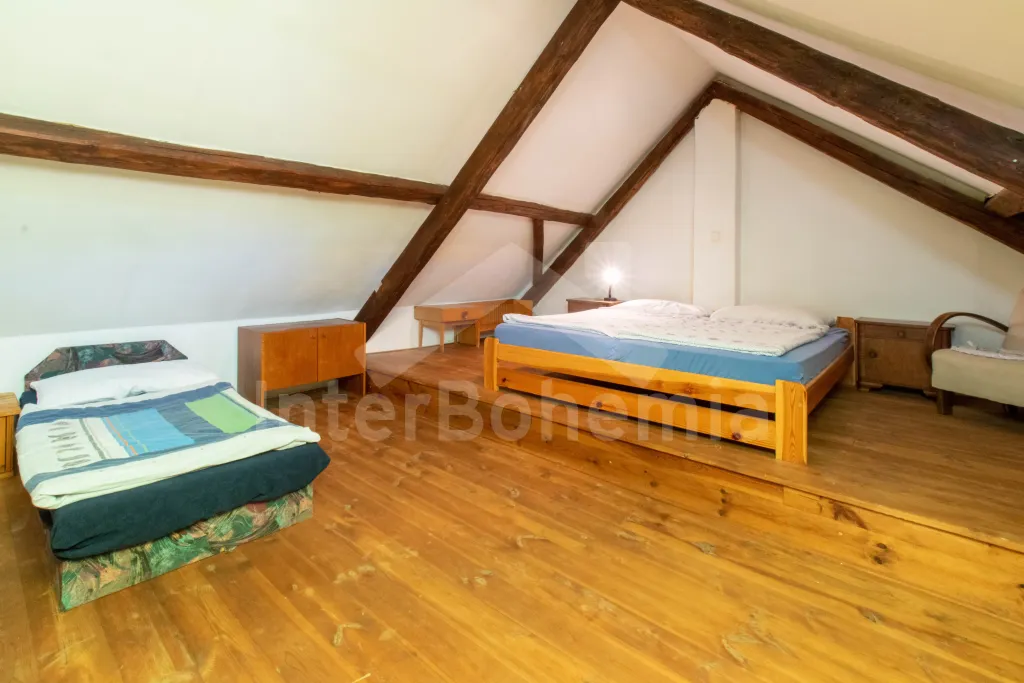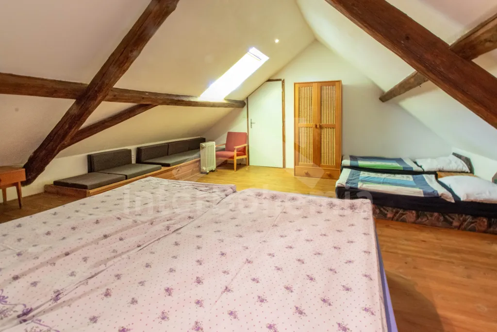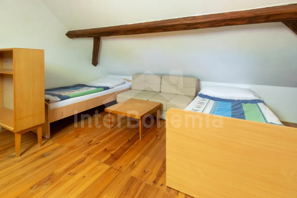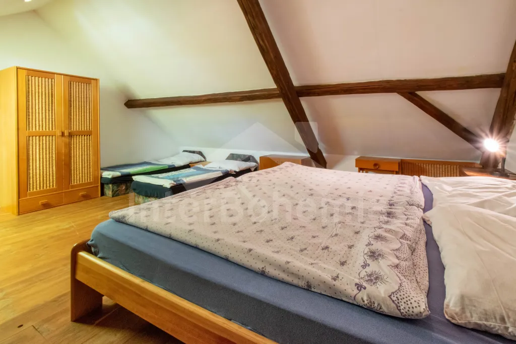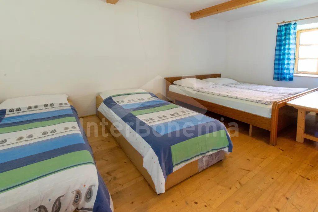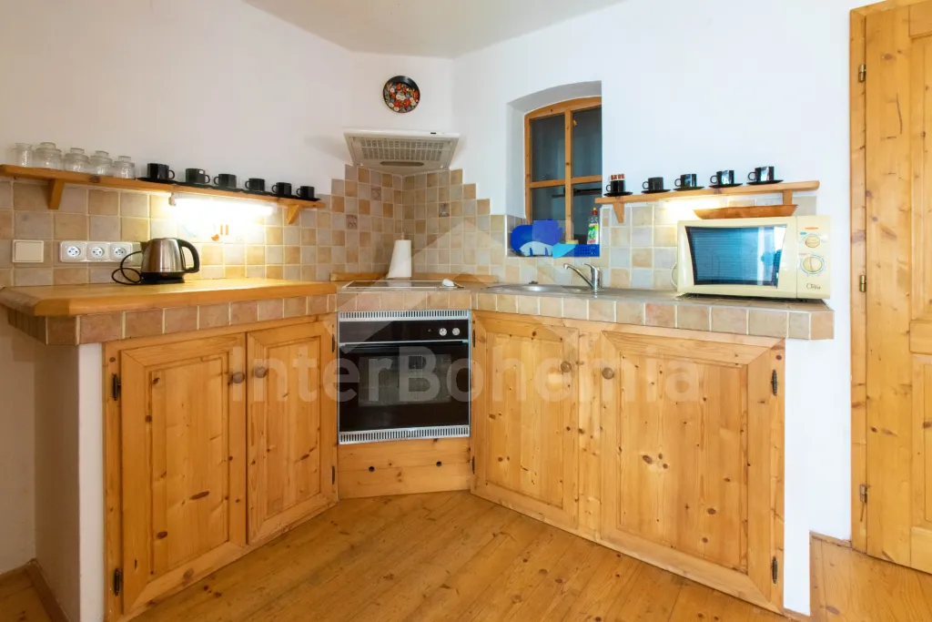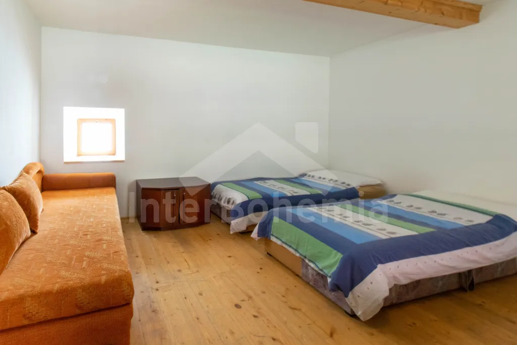 Apartmán č.2: Vchod, obývací pokoj s krbovými kamny, sedací soupravou a křesly až pro 10 lidí. Kuchyňský kout je vybavený sklokeramickou varnou deskou, el. troubou, lednicí s mrazákem, mikrovlnnou troubou, varnou konvicí, toustovačem a myčkou na nádobí. Dětská židlička k dispozici. Po příkrých schodech se dostaneme do podkroví, kde mají hosté k dispozici tři ložnice. První ložnice s dvoulůžkem, 2x jednolůžkem, šatní skříní, posezením a el. přímotopem. Druhá průchozí ložnice s 2x jednolůžkem a úložným prostorem. Třetí ložnice s 2x dvoulůžkem a dětskou postýlkou. Koupelna se vstupem z kuchyně je vybavena sprchou, umyvadlem, pračkou a WC. Ohřev vody el. bojlerem.