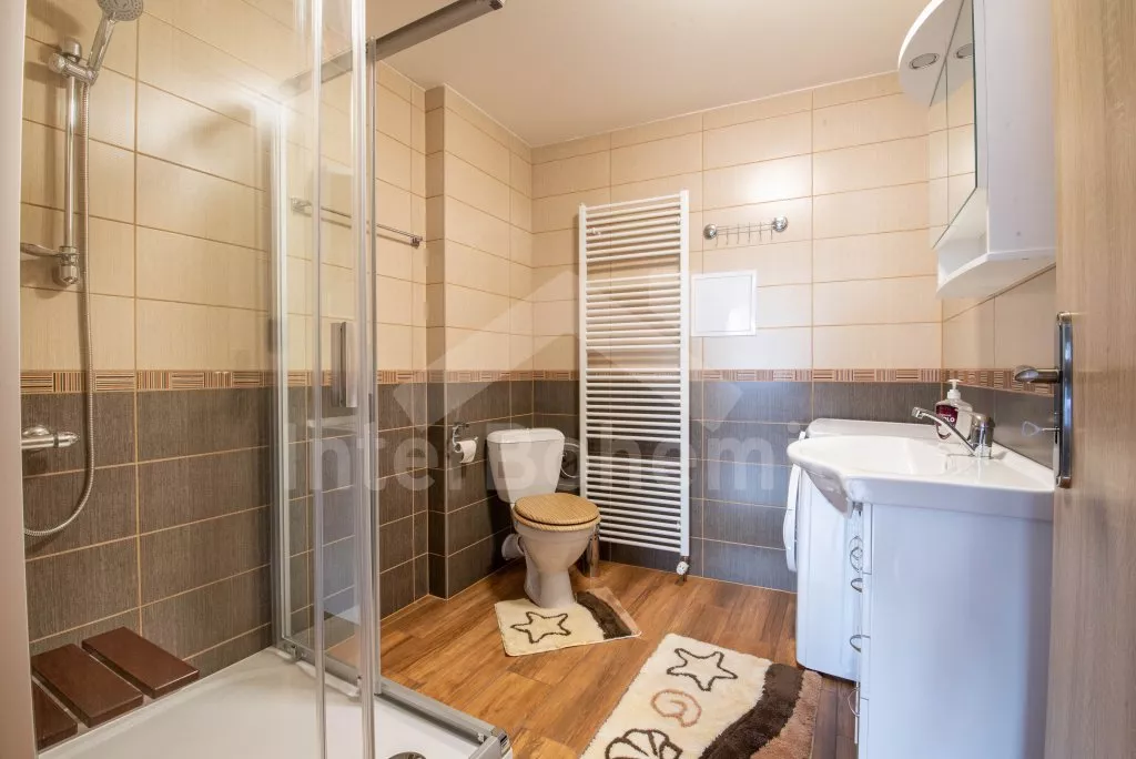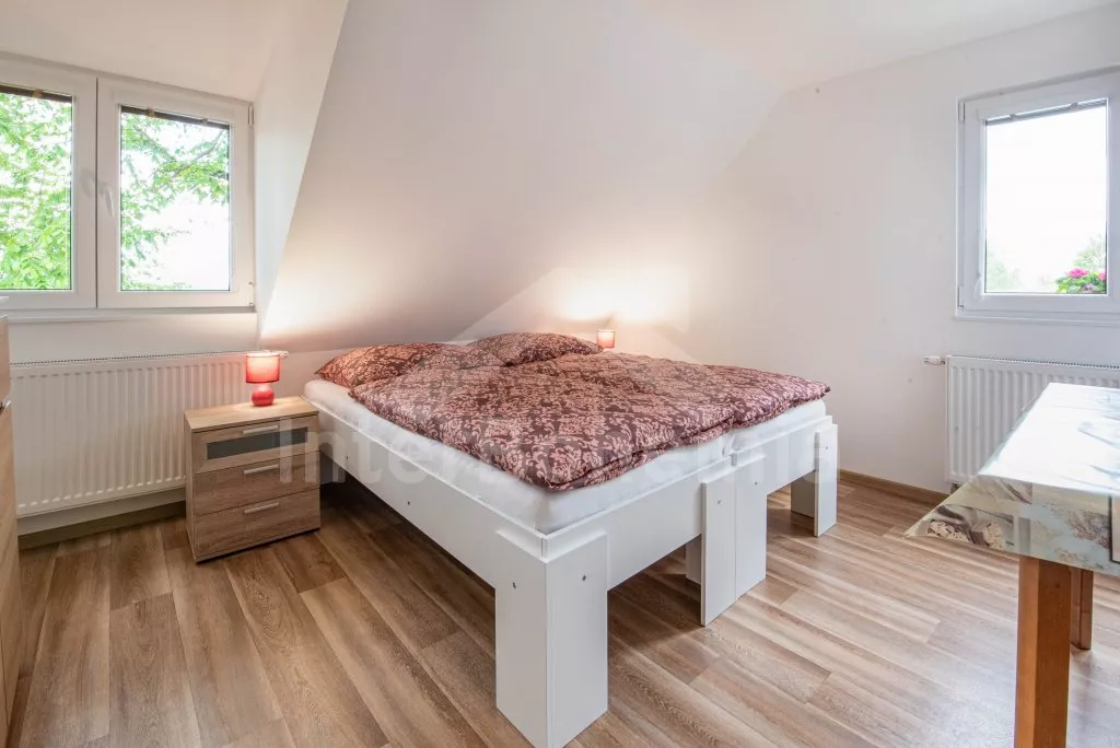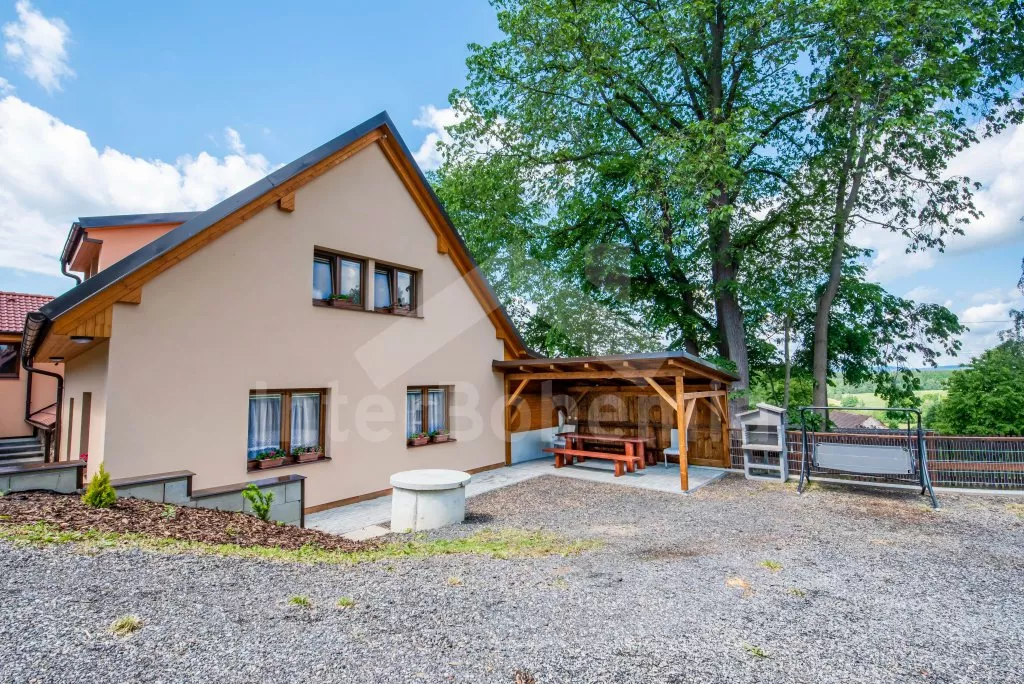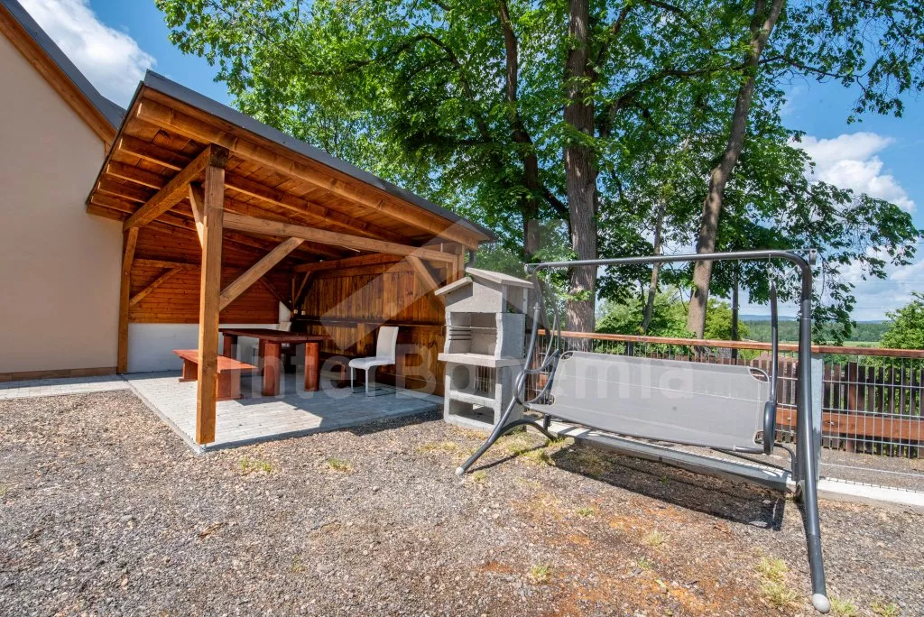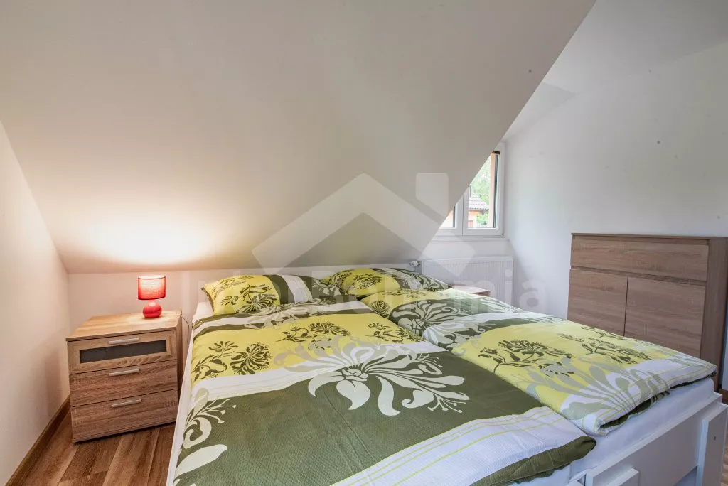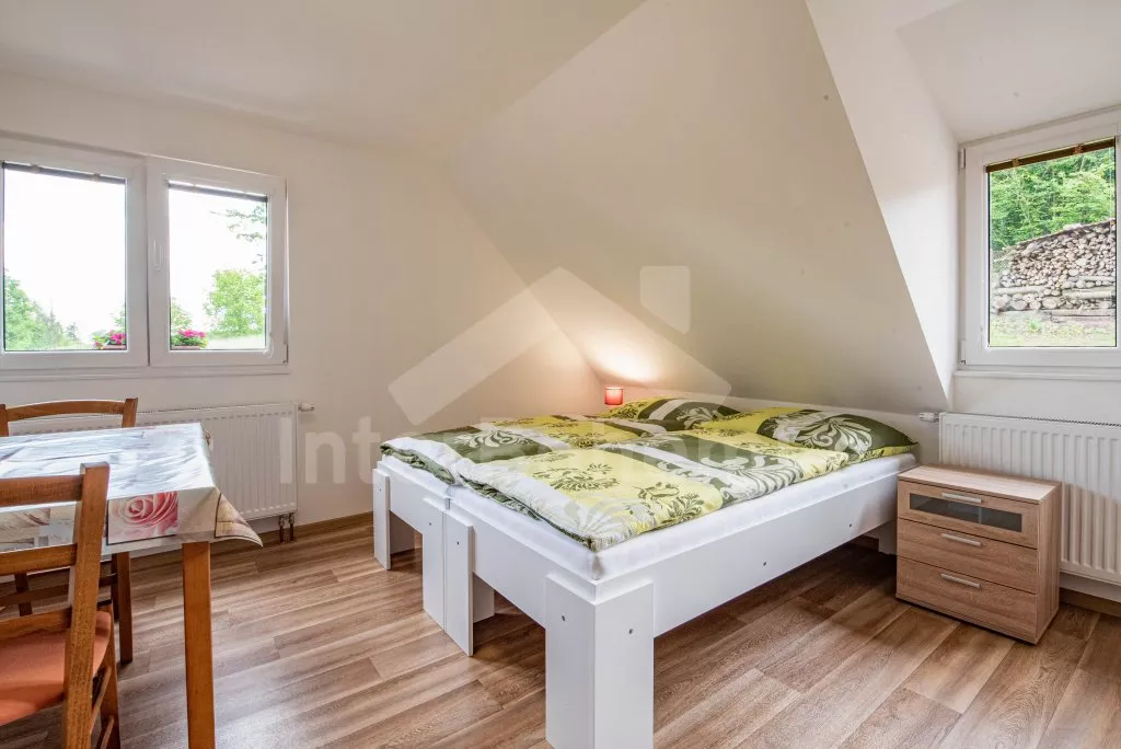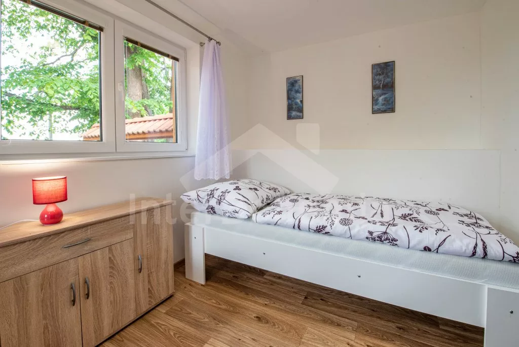 Obývací místnost s prostornou sedací soupravou, konferenčním stolkem a TV. Moderní kuchyně s el.troubou, sklokeramickou deskou, mikrovlnnou troubou, rychlovarnou konvicí, lednicí s mrazákem, základním kuchyňským vybavením a jídelním stolem pro 8 osob. Z obývací místnosti vstup do první ložnice s 2x jednolůžkem. Koupelna se sprchou, umyvadlem, pračkou a WC. V podkroví celkem tři ložnice. V první 2x jednolůžko, ve druhé 1x dvoulůžko, stůl s židlemi a TV a ve třetí ložnici 1x dvoulůžko a stůl s židlemi. Samostatná toaleta. Objekt je vytápěn ústředním topením a solárními panely. Zastřešená pergola s posezením, krbem, grilem a bazénem o průměru 3m. Dále k dispozici vířivka (k dispozici od června) pod zastřešením (pouze v letní sezóně). Parkování před objektem či na pozemku. Každá část má vlastní vchod a parkování.