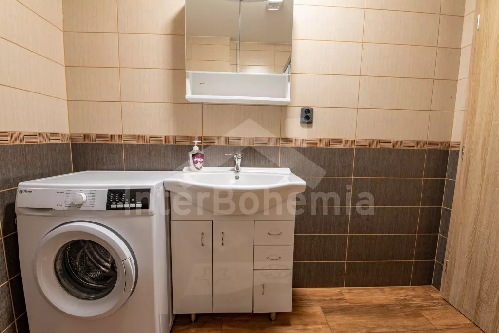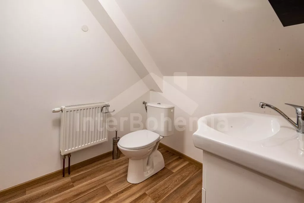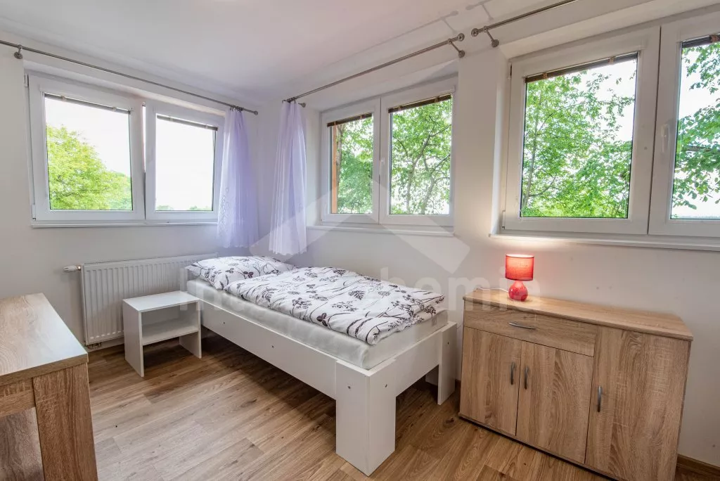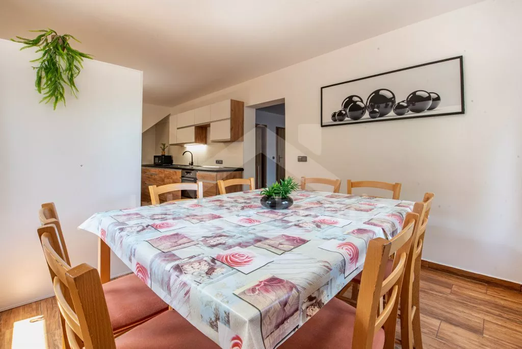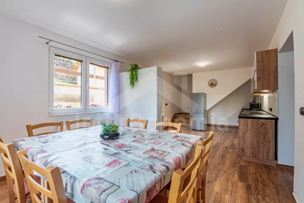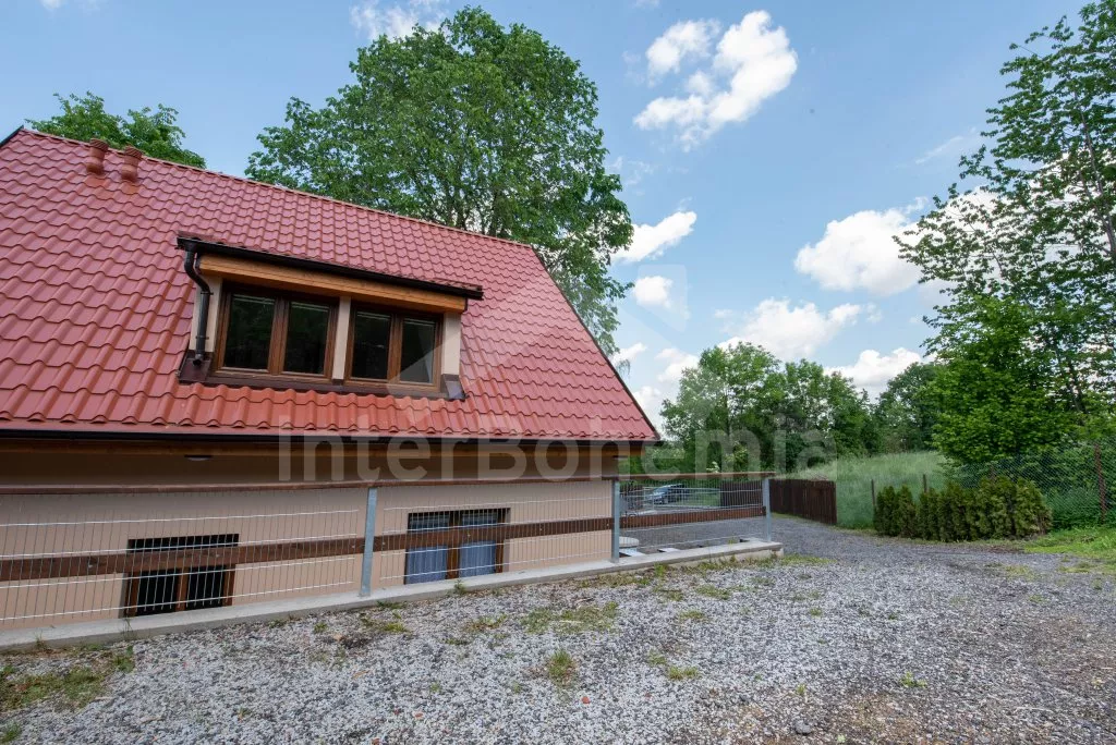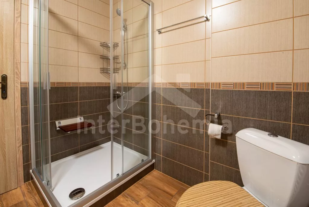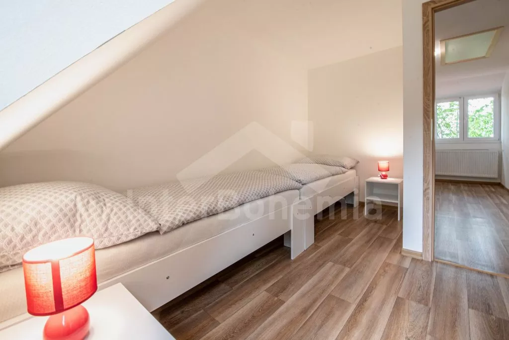 Obývací místnost s prostornou sedací soupravou, konferenčním stolkem a TV. Moderní kuchyně s el.troubou, sklokeramickou deskou, mikrovlnnou troubou, rychlovarnou konvicí, lednicí s mrazákem, základním kuchyňským vybavením a jídelním stolem pro 8 osob. Z obývací místnosti vstup do první ložnice s 2x jednolůžkem. Koupelna se sprchou, umyvadlem, pračkou a WC. V podkroví celkem tři ložnice. V první 2x jednolůžko, ve druhé 1x dvoulůžko, stůl s židlemi a TV a ve třetí ložnici 1x dvoulůžko a stůl s židlemi. Samostatná toaleta. Objekt je vytápěn ústředním topením a solárními panely. Zastřešená pergola s posezením, krbem, grilem a bazénem o průměru 3m. Dále k dispozici vířivka (k dispozici od června) pod zastřešením (pouze v letní sezóně). Parkování před objektem či na pozemku. Každá část má vlastní vchod a parkování.