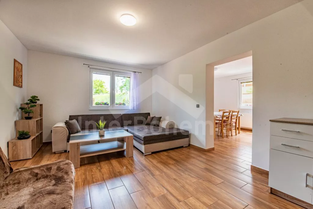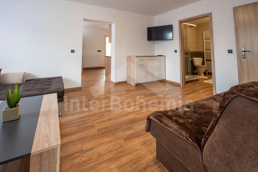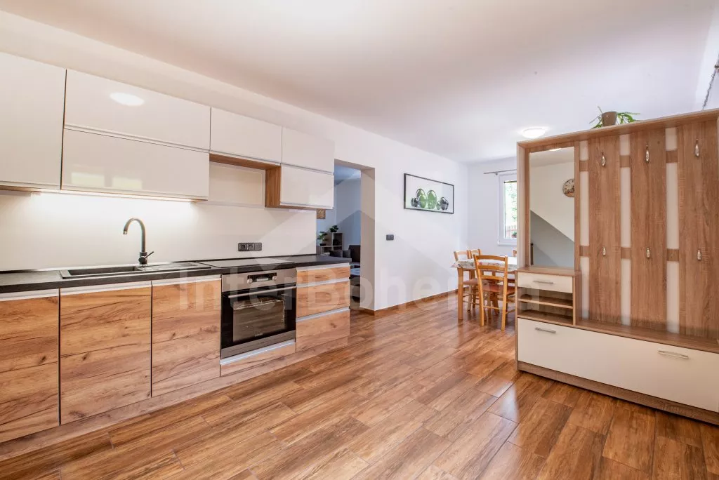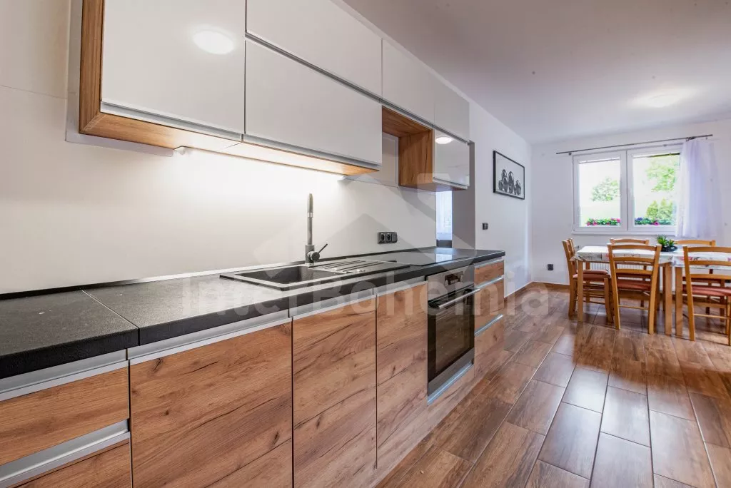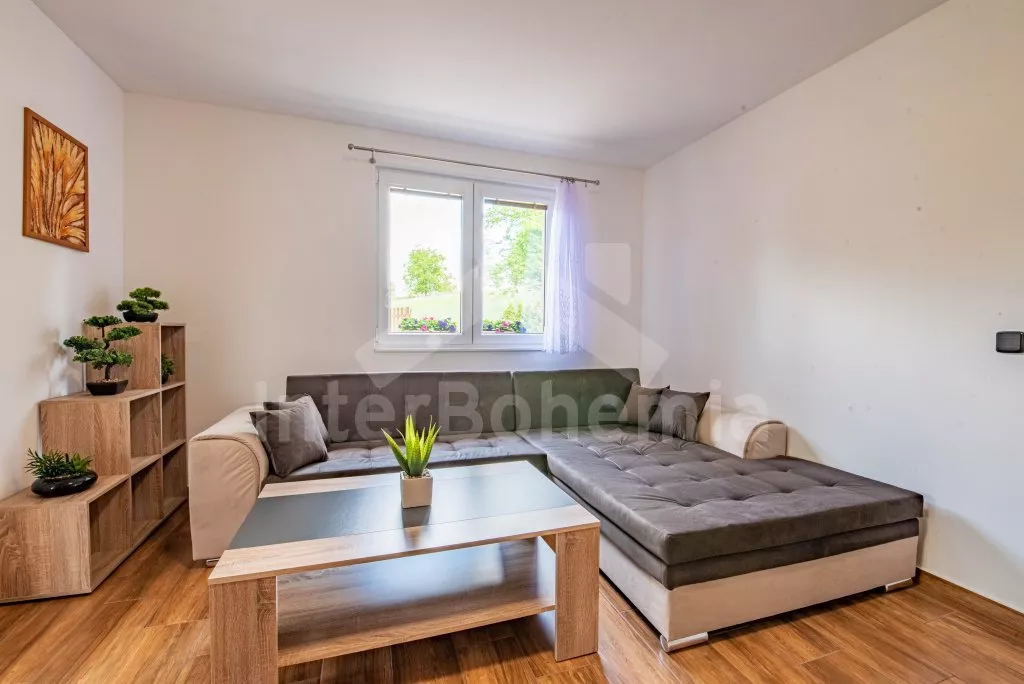 Obývací místnost s prostornou sedací soupravou, konferenčním stolkem a TV. Moderní kuchyně s el.troubou… Více informací