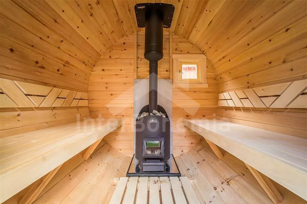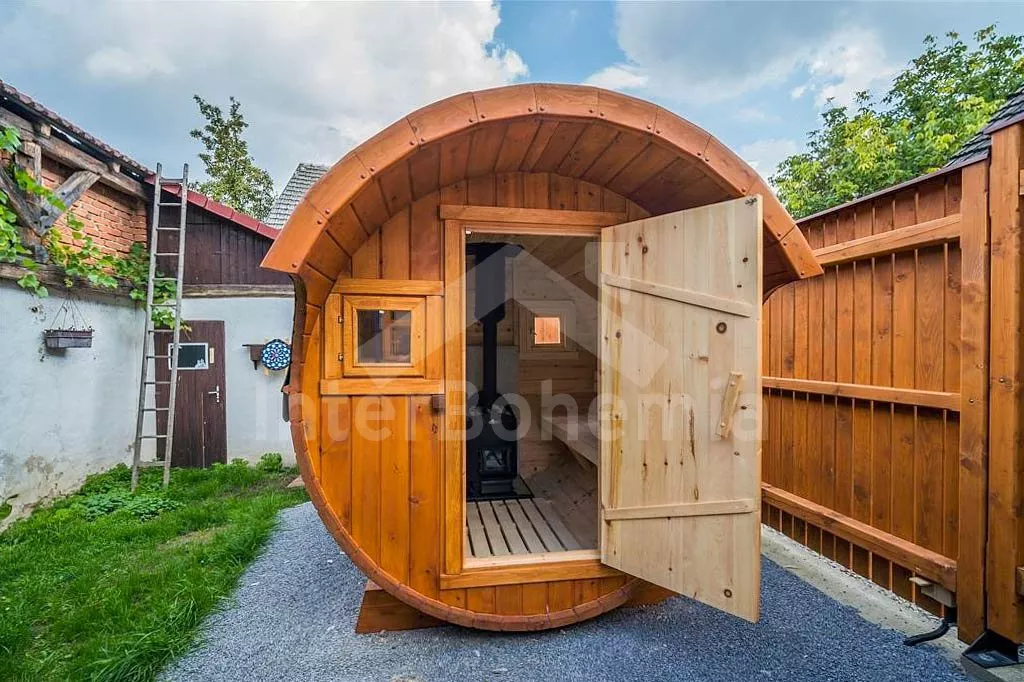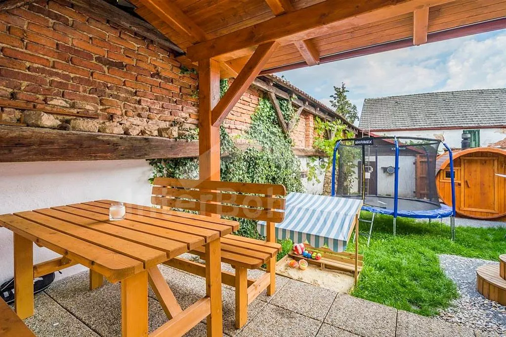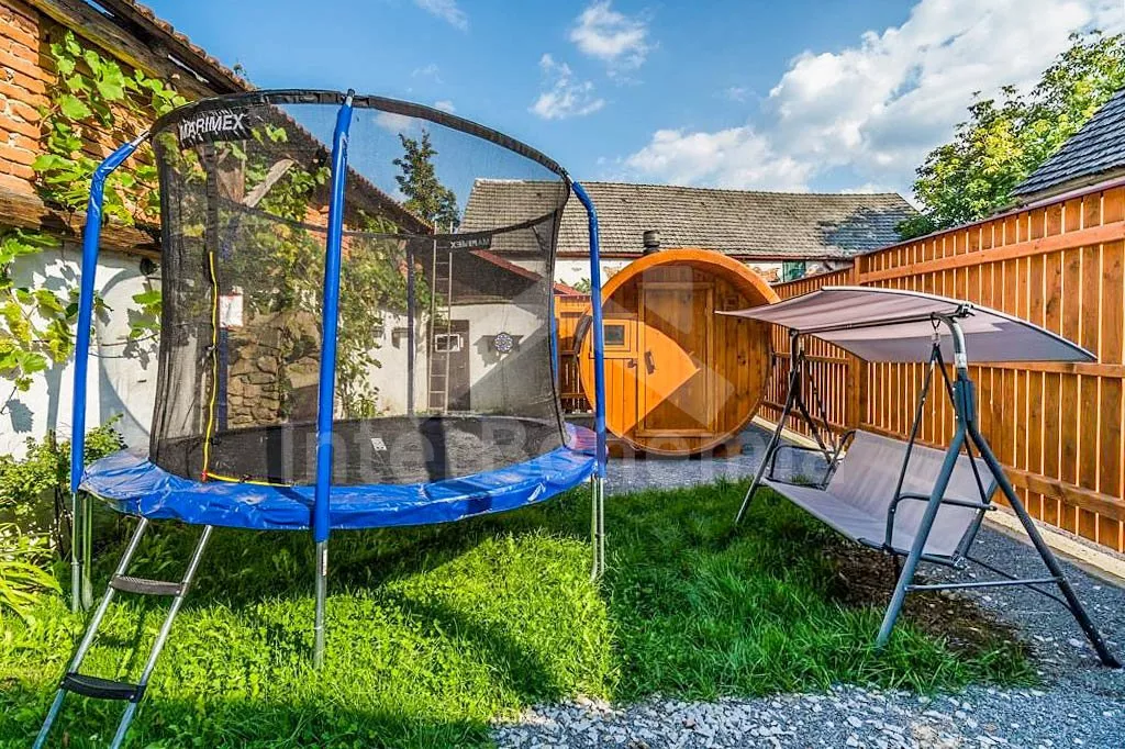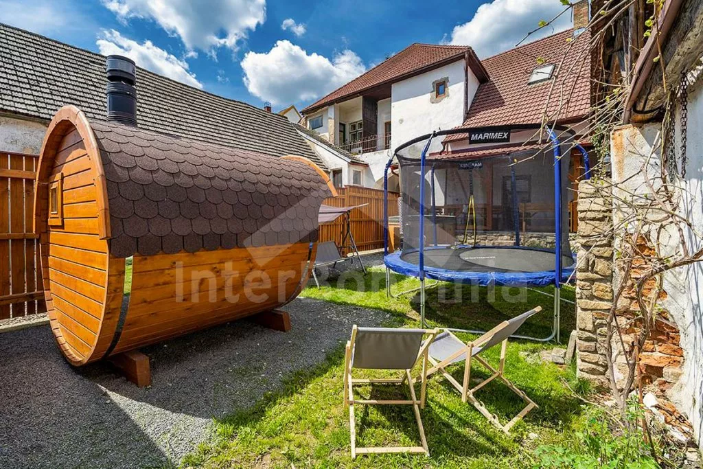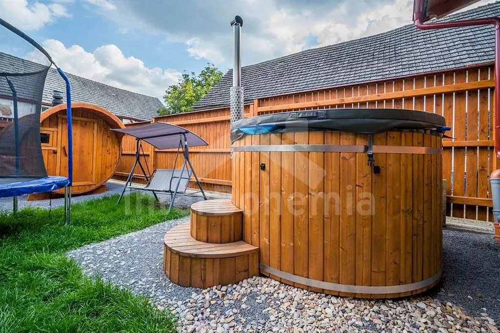Chalupa se srubovou saunou, koupací kádí a trampolínou pro děti.