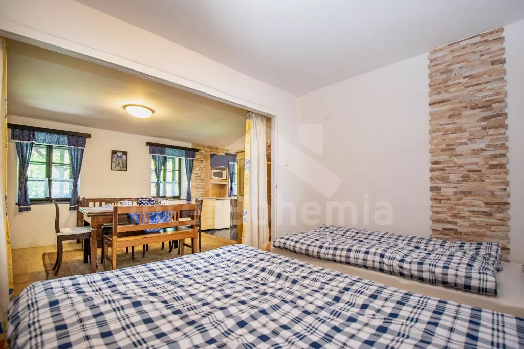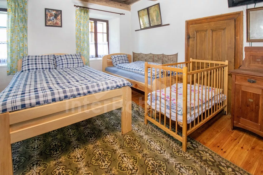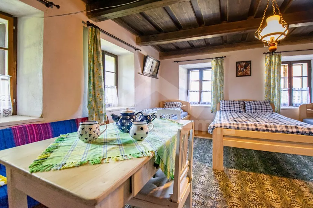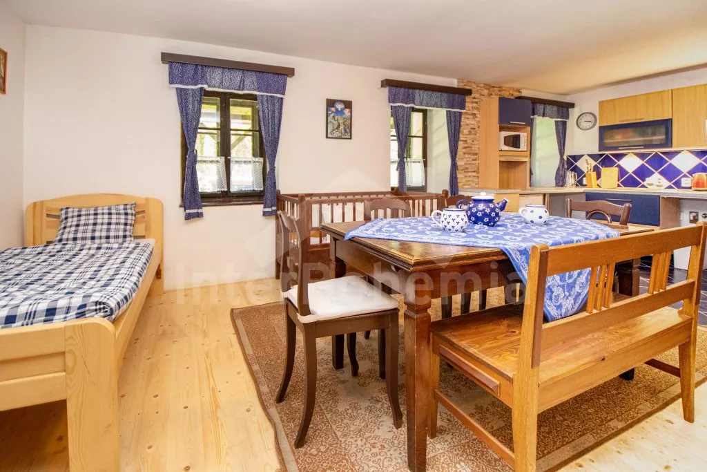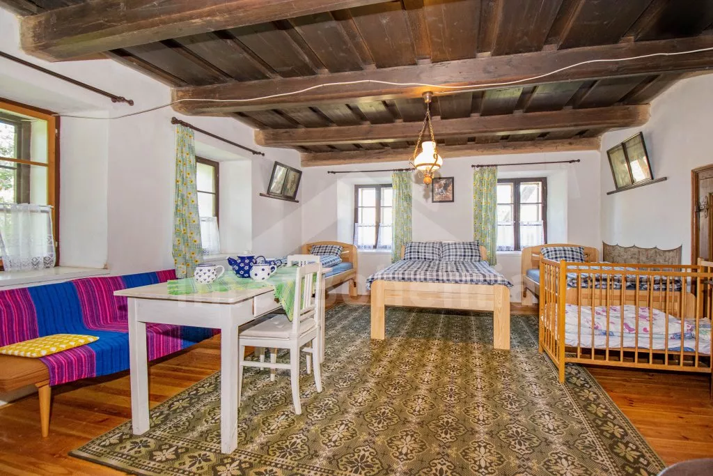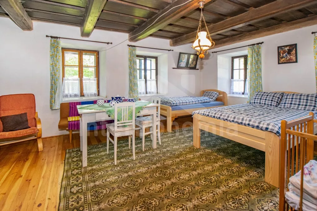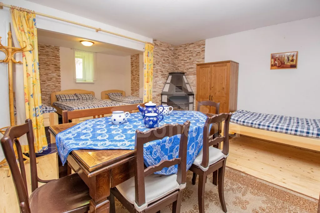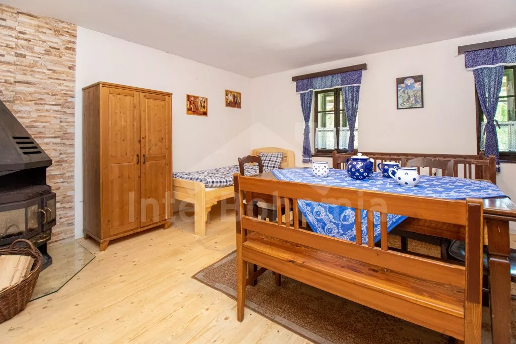 Chalupa s uzavřeným dvorem a vlastním bazénem se nachází ve výšce 620 m. n. m v malebné vesničce obklopené přírodou. Světnice s kachlovými kamny, jídelním stolem, TV, dvoulůžkem, 2x jednolůžkem a dětskou postýlkou. Vstup do prostorné kuchyně se sklokeramickou deskou, troubou, lednicí s mrazákem, rychlovarnou konvicí, sporákem na tuhá paliva, mikrovlnnou troubou a myčkou na nádobí. Ve druhé světnici kuchyňský kout se základním kuchyňským vybavením, rychlovarnou konvicí, lednicí, mikrovlnnou troubou a jídelním stolem. Dále krbová kamna, prostorná postýlka, 3x jednolůžko a dvoulůžko. Koupelna se sprchou, umyvadlem a pračkou. Samostatná toaleta. Objekt je vytápěn kamny. Velká, zastřešená pergola s posezením a grilem. Houpací lavice, bazén o průměru 2,5 m a pro děti malé pískoviště, bazének a skluzavka. Parkování na pozemku pro 2 automobily a 2 parkovací místa před objektem.
