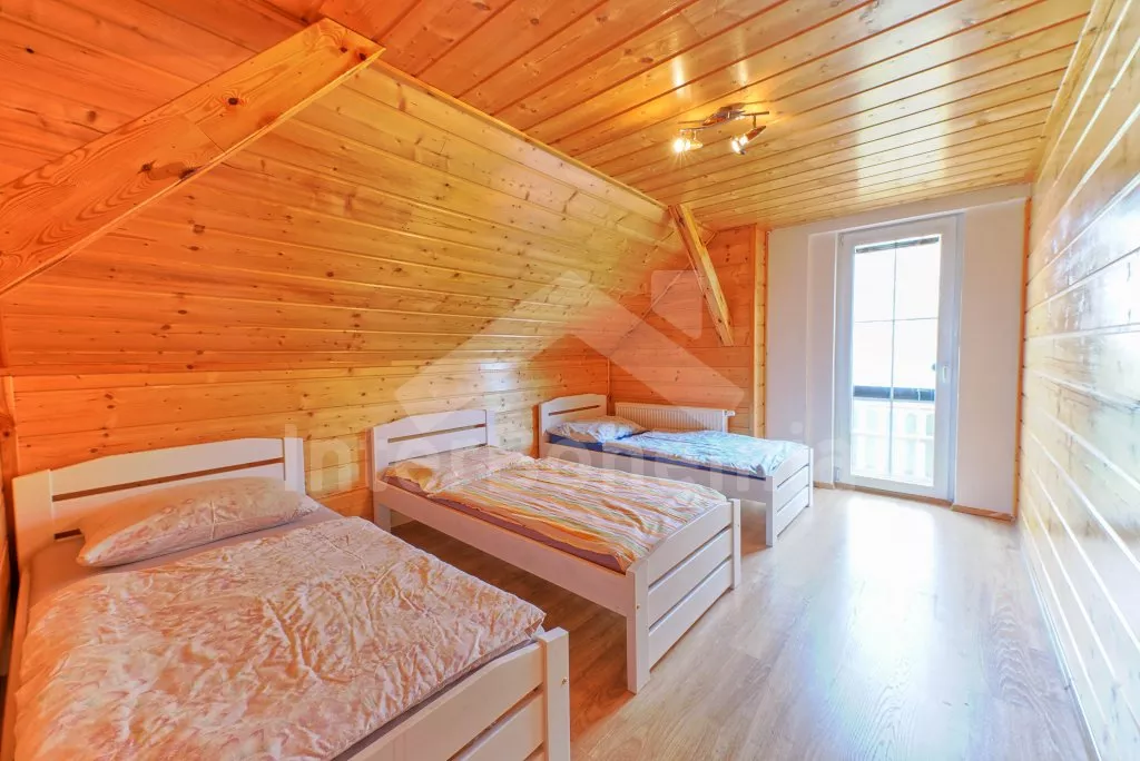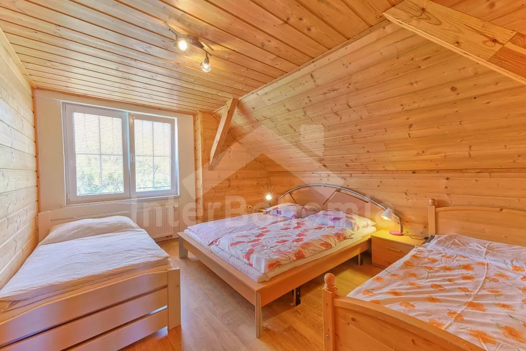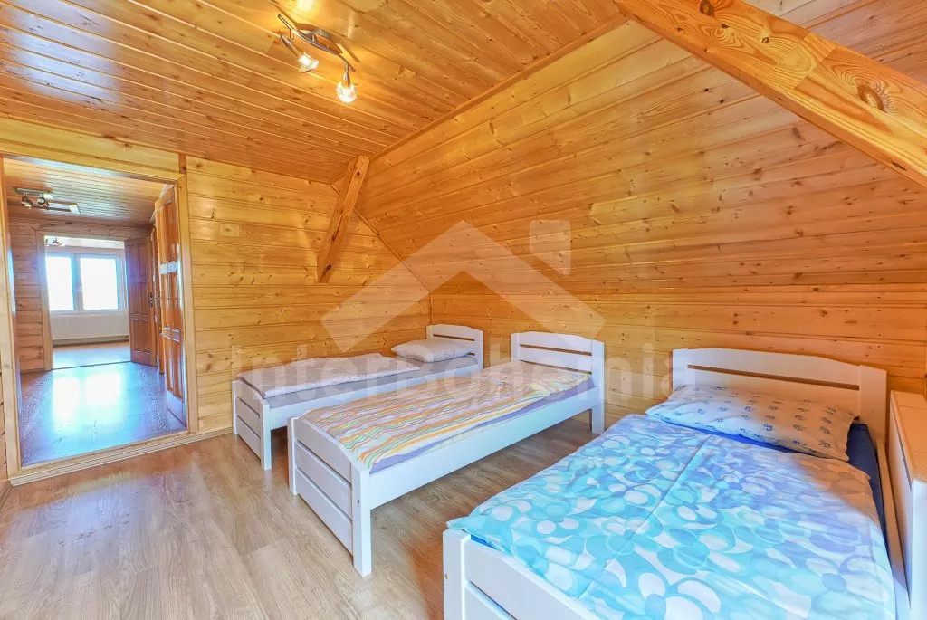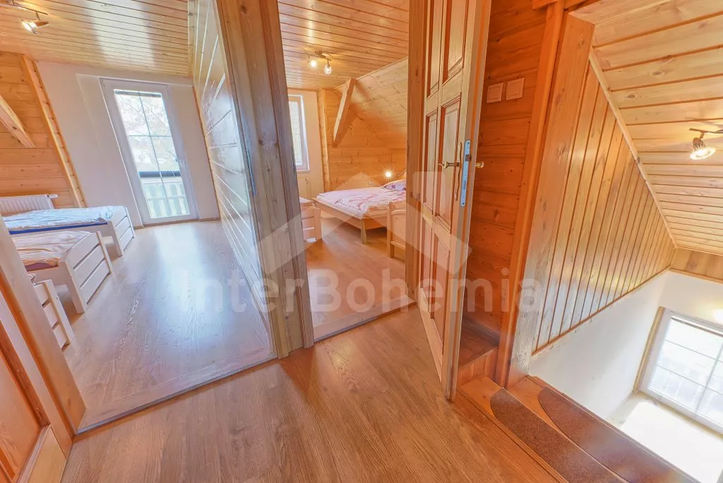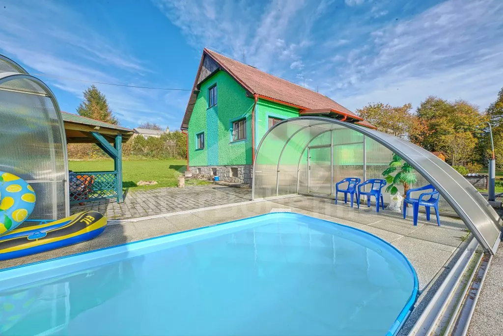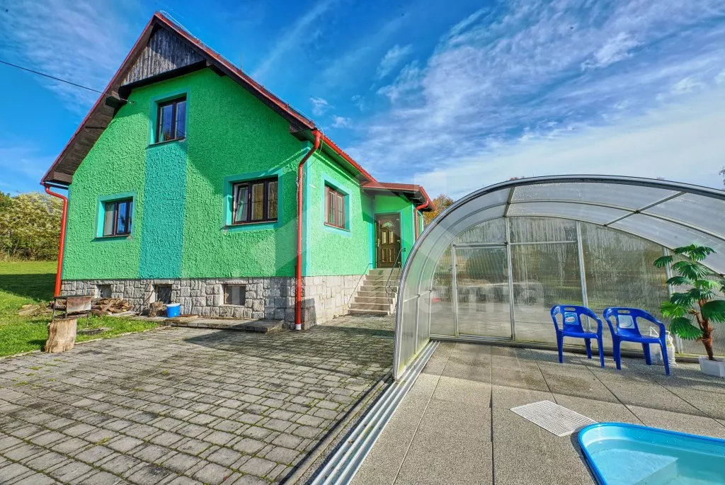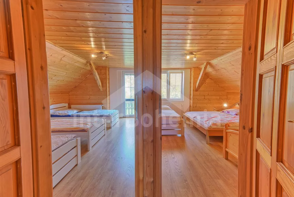 V roce 2018 částečně zrekonstruovaný prostorný dům s bazénem (celoroční použití), krytou pergolou (altánem) a velkou neoplocenou zahradou. Ideální místo pro velkou skupinu přátel. Vstup, centrální hala, na kterou navazuje obývací pokoj spojený s kuchyní. V kuchyni vybavená kuchyňská linka se sporákem (sklokeramický), troubou, mikrovlnnou troubou, lednicí s mrazákem, kávovarem, rychlovarnou konvicí, nádobím a myčkou na nádobí. Dále jídelní stůl pro 4 osoby. V obývacím pokoji druhý jídelní stůl pro 8 osob, sedací souprava s konferenčním stolkem, LCD televize a elektrický krb. V přízemí se nacházejí 2 ložnice, první s dvoulůžkem, palandou a LCD TV, druhá ložnice s dvoulůžkem a jedním jednolůžkem. Dále koupelna se sprchovým koutem, rohovou vanou a umyvadlem. Samostatné WC. V podkroví vpravo se nacházejí dvě ložnice, první se třemi jednolůžky, druhá s dvoulůžkem a dvěma jednolůžky. Třetí podkrovní ložnice v čele s jedním dvoulůžkem a sedací soupravou, konferenčním stolkem a LCD TV. Druhá koupelna se sprchovým koutem a umyvadlem. Druhé samostatné WC. Vytápění objektu ústřední na tuhá paliva + elektrokotel. Hosté mají k dispozici neoplocenou zahradu s krytou pergolou (altán), zapuštěný bazén 6 x 3 m s vyhříváním, přenosný gril, pro děti pak k dispozici venkovní hřiště 50 m od objektu s prolézačkami, houpačkou a skluzavkou. Parkování u objektu pro 6 automobilů.