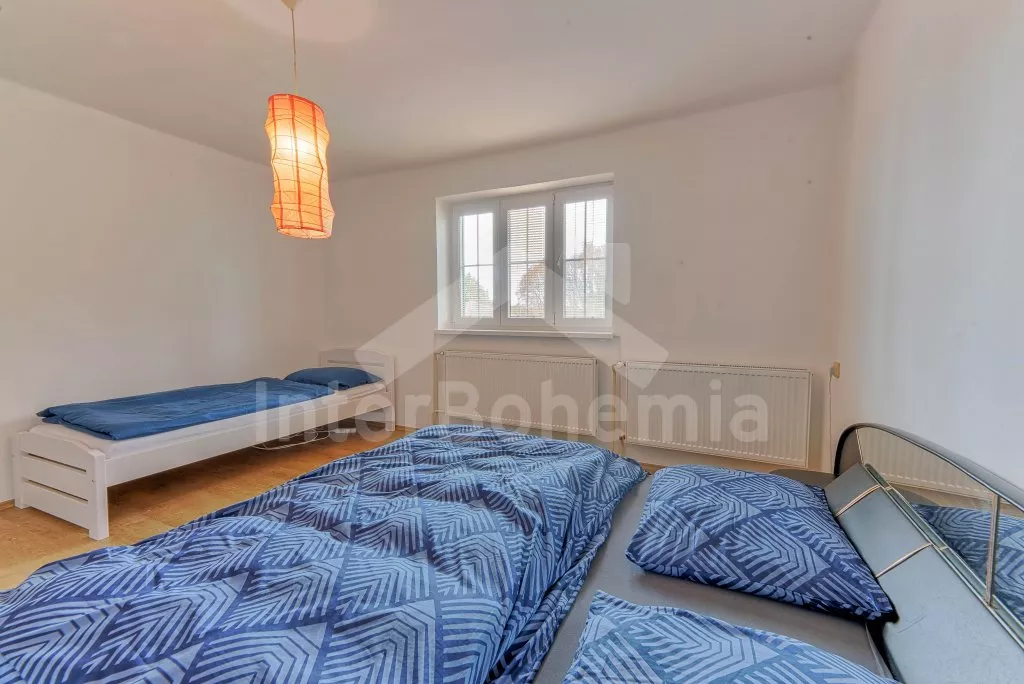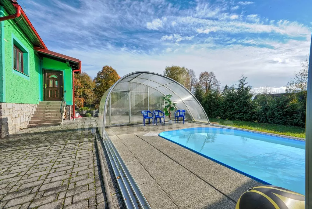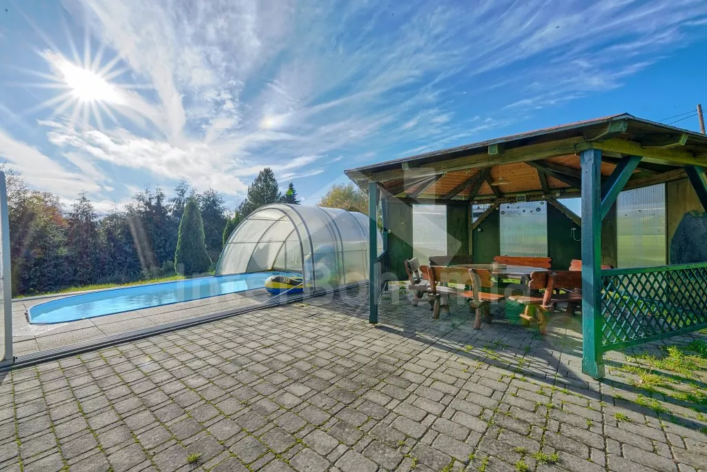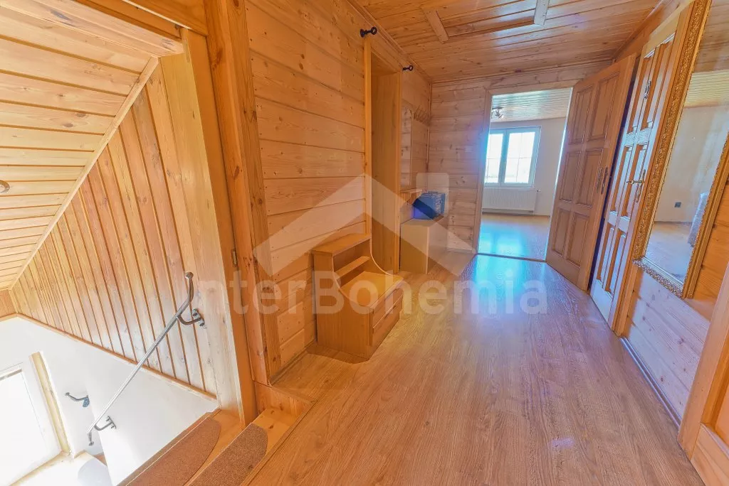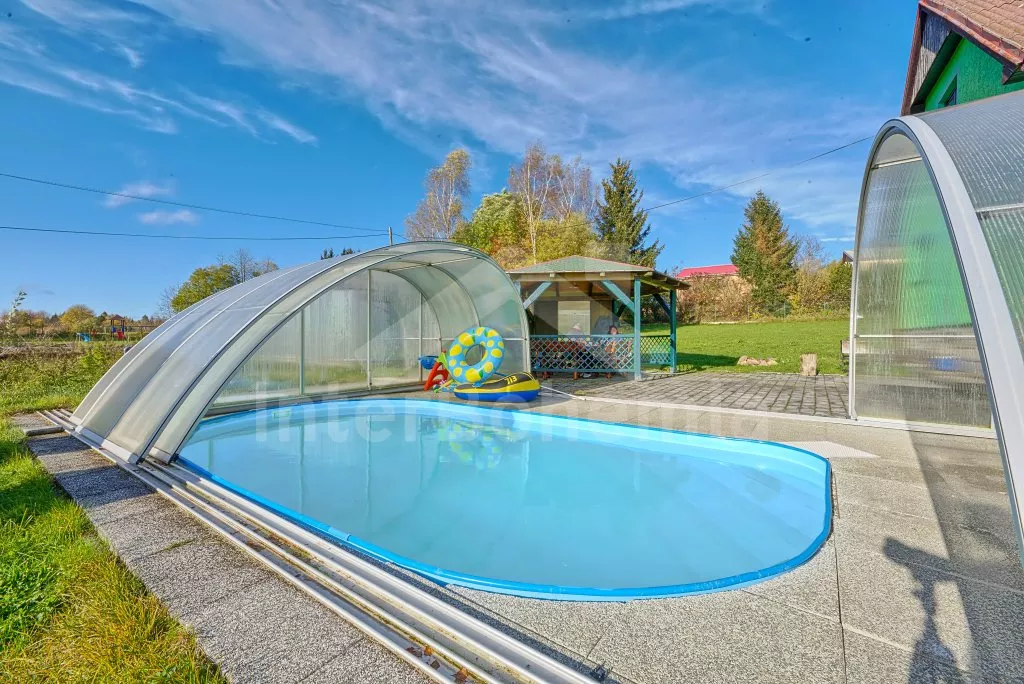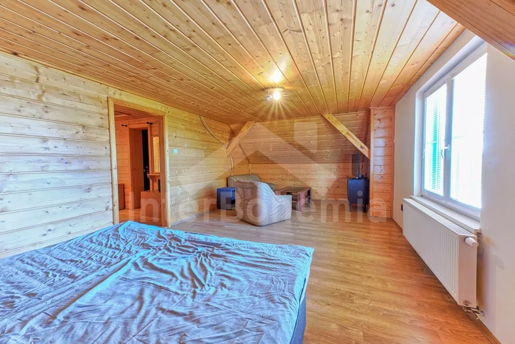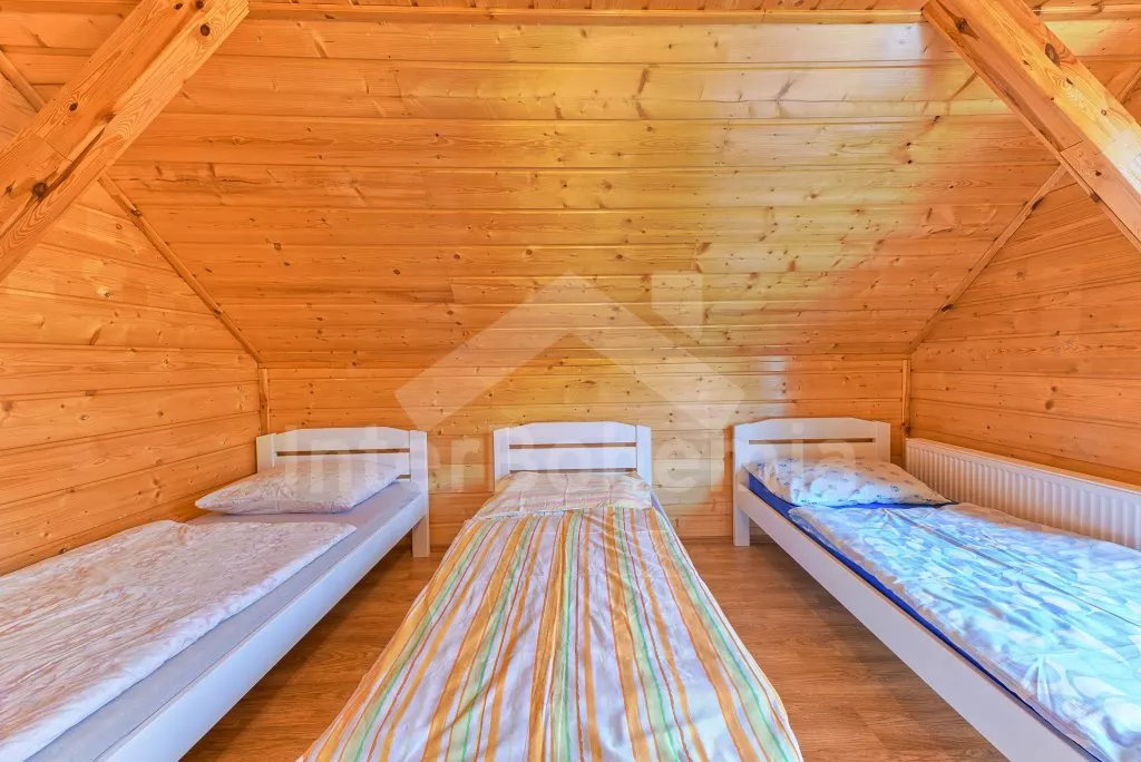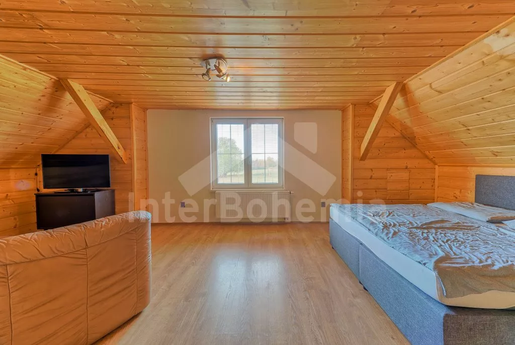 V roce 2018 částečně zrekonstruovaný prostorný dům s bazénem (celoroční použití), krytou pergolou (altánem) a velkou neoplocenou zahradou. Ideální místo pro velkou skupinu přátel. Vstup, centrální hala, na kterou navazuje obývací pokoj spojený s kuchyní. V kuchyni vybavená kuchyňská linka se sporákem (sklokeramický), troubou, mikrovlnnou troubou, lednicí s mrazákem, kávovarem, rychlovarnou konvicí, nádobím a myčkou na nádobí. Dále jídelní stůl pro 4 osoby. V obývacím pokoji druhý jídelní stůl pro 8 osob, sedací souprava s konferenčním stolkem, LCD televize a elektrický krb. V přízemí se nacházejí 2 ložnice, první s dvoulůžkem, palandou a LCD TV, druhá ložnice s dvoulůžkem a jedním jednolůžkem. Dále koupelna se sprchovým koutem, rohovou vanou a umyvadlem. Samostatné WC. V podkroví vpravo se nacházejí dvě ložnice, první se třemi jednolůžky, druhá s dvoulůžkem a dvěma jednolůžky. Třetí podkrovní ložnice v čele s jedním dvoulůžkem a sedací soupravou, konferenčním stolkem a LCD TV. Druhá koupelna se sprchovým koutem a umyvadlem. Druhé samostatné WC. Vytápění objektu ústřední na tuhá paliva + elektrokotel. Hosté mají k dispozici neoplocenou zahradu s krytou pergolou (altán), zapuštěný bazén 6 x 3 m s vyhříváním, přenosný gril, pro děti pak k dispozici venkovní hřiště 50 m od objektu s prolézačkami, houpačkou a skluzavkou. Parkování u objektu pro 6 automobilů.