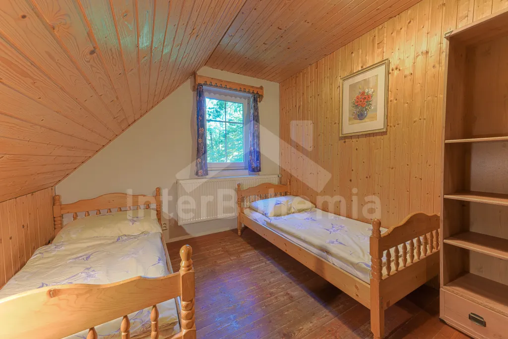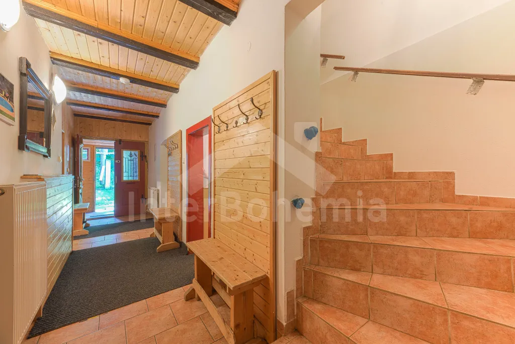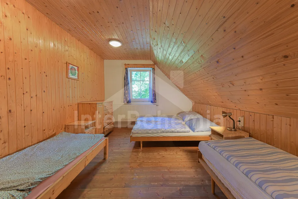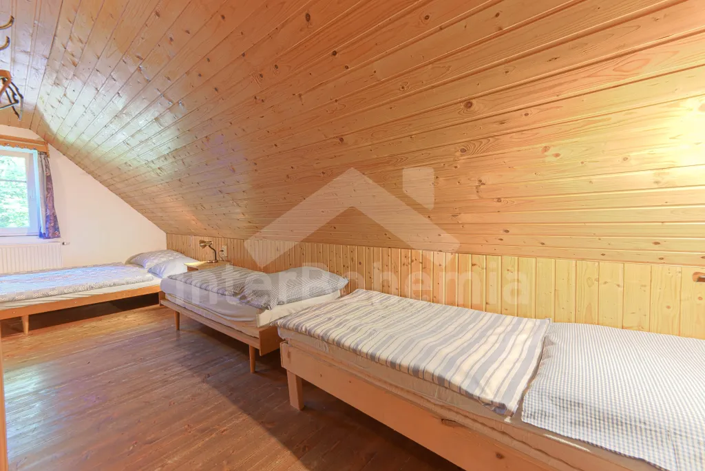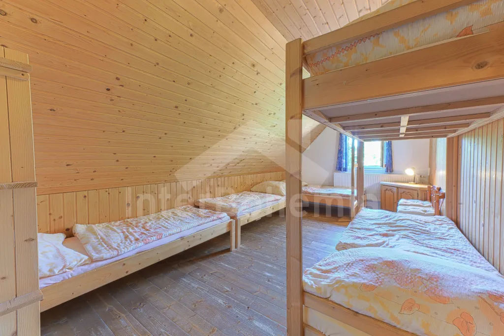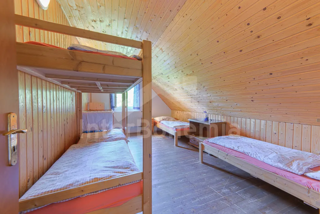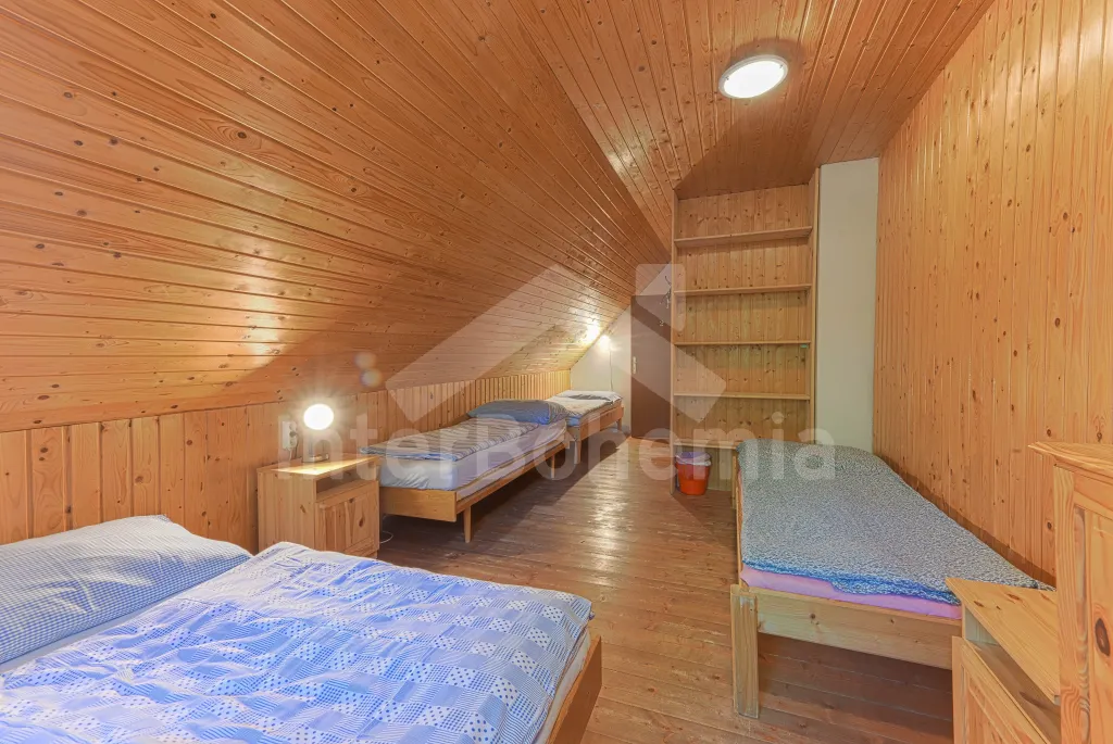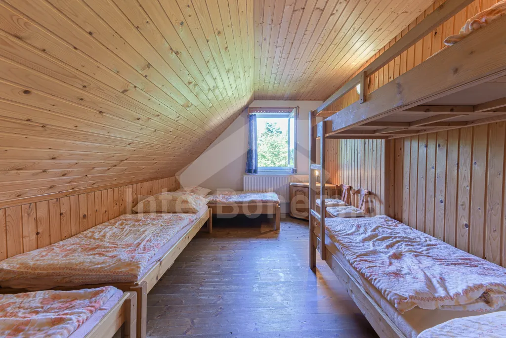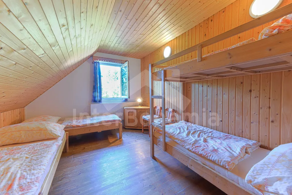 Volně stojící a prostorná chalupa, v roce 2005 zrekonstruovaná, účelně a příjemně zařízená. Vchod, chodba, prostor pro ukládání lyží a samostatná toaleta. Obývací pokoj se sedací soupravou pro 8 osob, televizí a hezkým krbem. Kuchyně s jídelním koutem, elektrickým sporákem, lednicí, kávovarem, varnou konvicí a mikrovlnnou troubou. Veranda s jídelními stoly a lavicemi. Malá průchozí ložnice s rozkládacím gaučem (slouží také jako dvojlůžko). Prostorná společenská místnost přístupná přes malou ložnici nebo zvenčí. Ve společenské místnosti se nachází kompletní výčepní zařízení, krbová kamna, chladicí skříň a posezení – stoly a lavice. Z chodby vedou schody do podkroví, kde se nachází chodba, koupelna s vanou a toaletou, druhá koupelna se sprchou a toaletou a další čtyři ložnice. První dvě ložnice každá s palandou a dvěma samostatnými lůžky a další dvě ložnice každá s palandou a třemi samostatnými lůžky. V suterénu se nachází finská sauna se sprchou a toaletou (přístup ze zahrady). Vytápění krbem a krbovými kamny, v zimě ústřední topení (o topení se stará správce). Chalupa stojí na vlastním oploceném pozemku, k dispozici je dřevěný zahradní nábytek, zahradní gril a bazén 5,5 x 3 m se zastřešením. Vlastní parkoviště.
