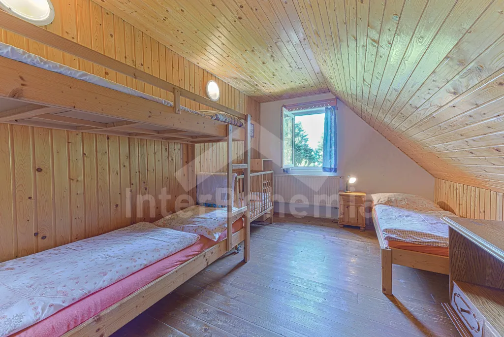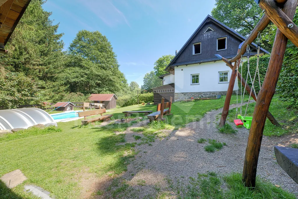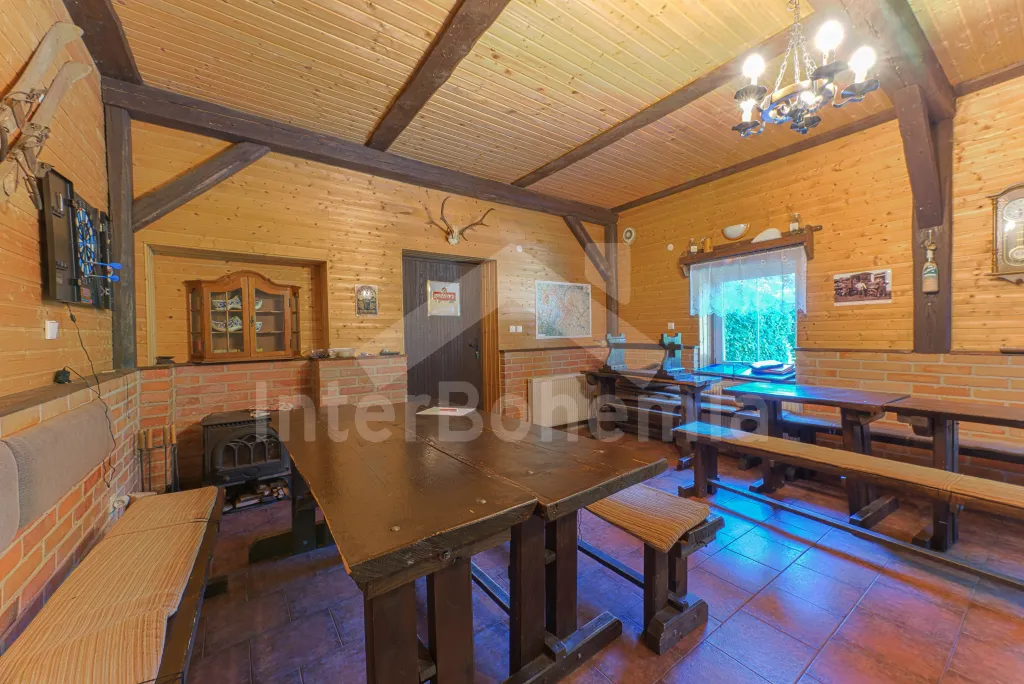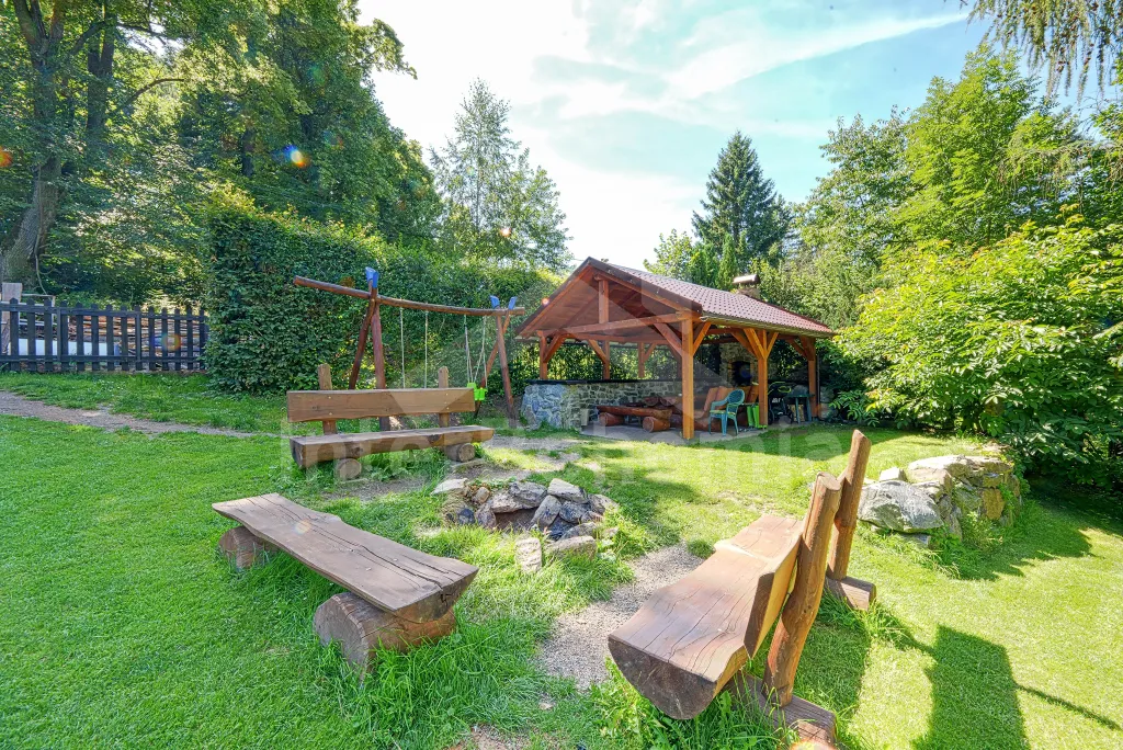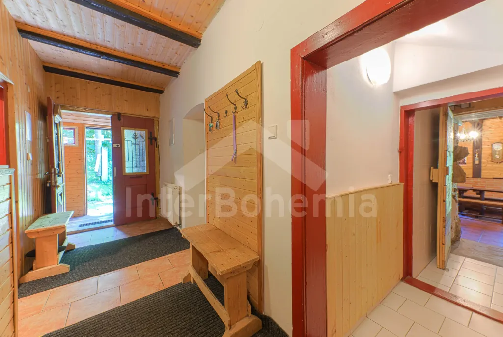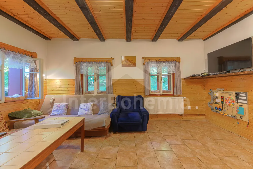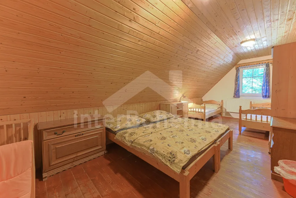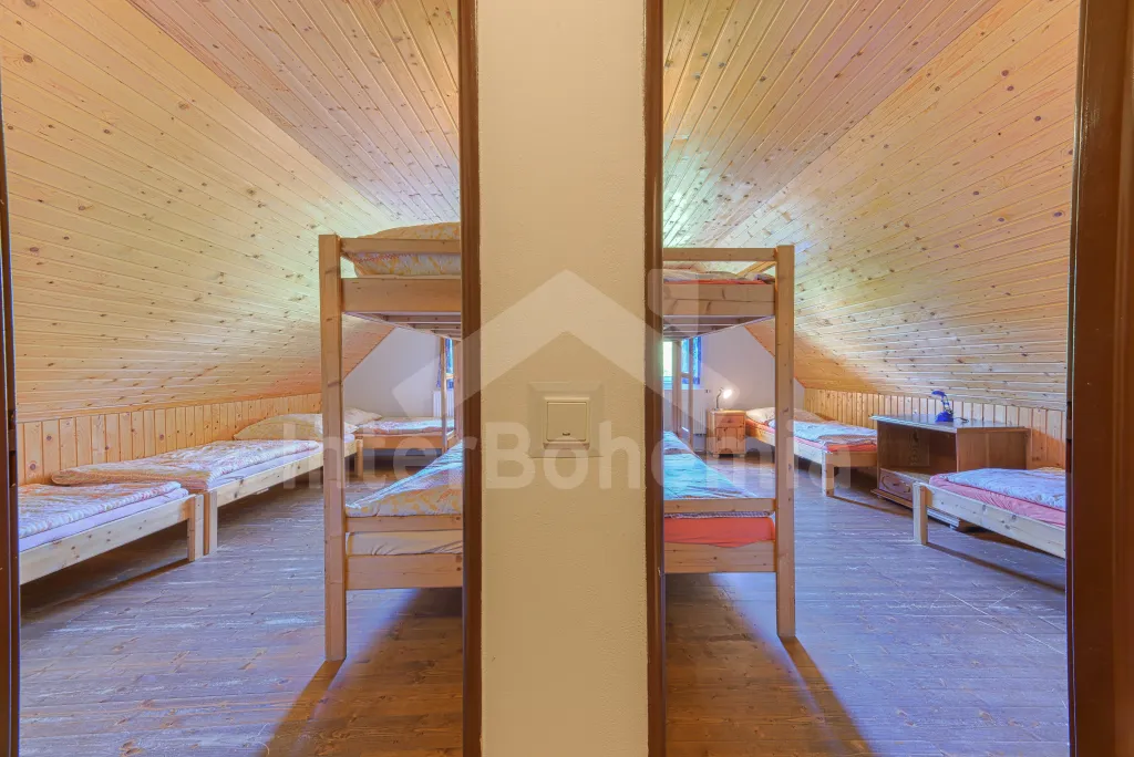 Volně stojící a prostorná chalupa, v roce 2005 zrekonstruovaná, účelně a příjemně zařízená. Vchod, chodba, prostor pro ukládání lyží a samostatná toaleta. Obývací pokoj se sedací soupravou pro 8 osob, televizí a hezkým krbem. Kuchyně s jídelním koutem, elektrickým sporákem, lednicí, kávovarem, varnou konvicí a mikrovlnnou troubou. Veranda s jídelními stoly a lavicemi. Malá průchozí ložnice s rozkládacím gaučem (slouží také jako dvojlůžko). Prostorná společenská místnost přístupná přes malou ložnici nebo zvenčí. Ve společenské místnosti se nachází kompletní výčepní zařízení, krbová kamna, chladicí skříň a posezení – stoly a lavice. Z chodby vedou schody do podkroví, kde se nachází chodba, koupelna s vanou a toaletou, druhá koupelna se sprchou a toaletou a další čtyři ložnice. První dvě ložnice každá s palandou a dvěma samostatnými lůžky a další dvě ložnice každá s palandou a třemi samostatnými lůžky. V suterénu se nachází finská sauna se sprchou a toaletou (přístup ze zahrady). Vytápění krbem a krbovými kamny, v zimě ústřední topení (o topení se stará správce). Chalupa stojí na vlastním oploceném pozemku, k dispozici je dřevěný zahradní nábytek, zahradní gril a bazén 5,5 x 3 m se zastřešením. Vlastní parkoviště.