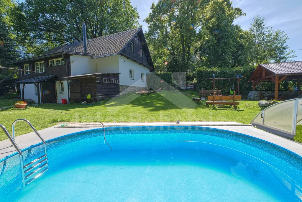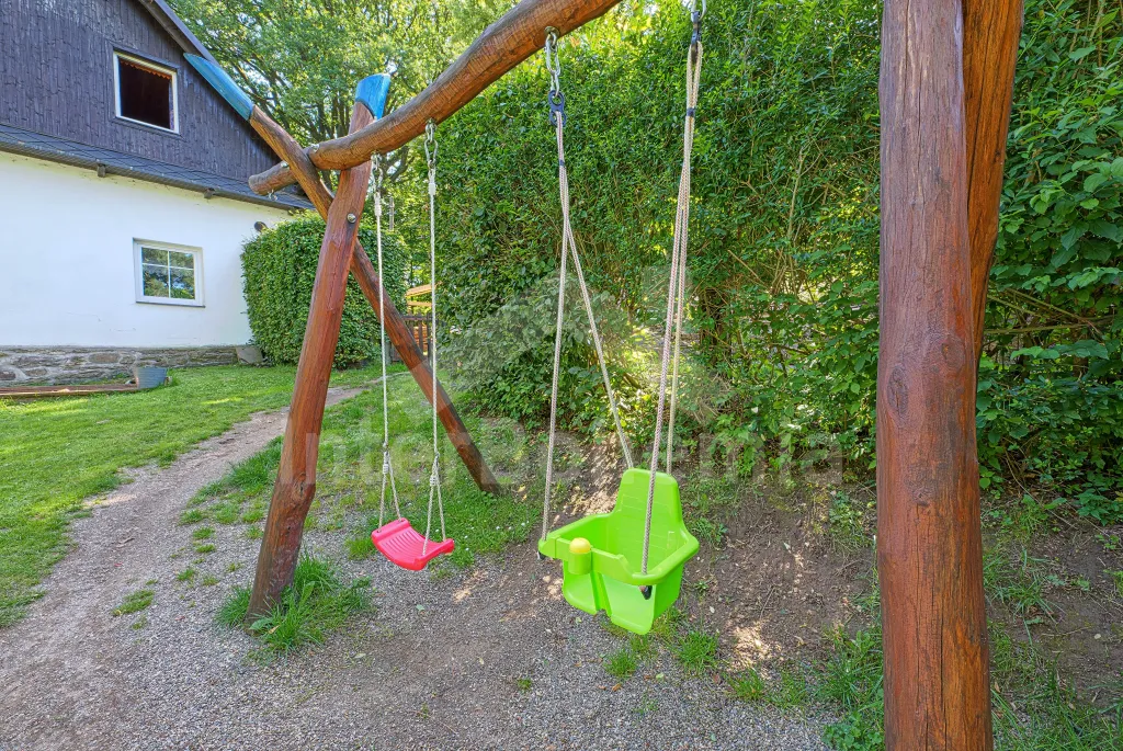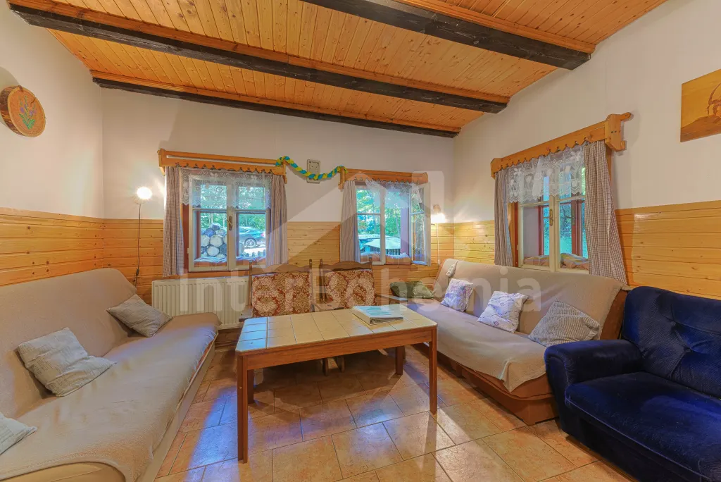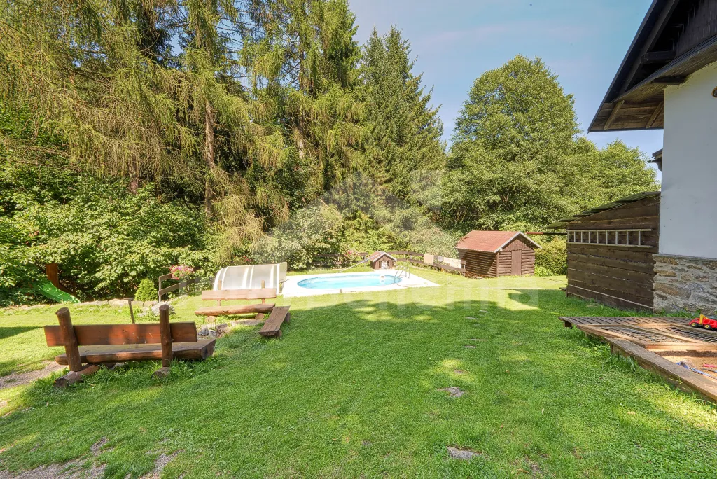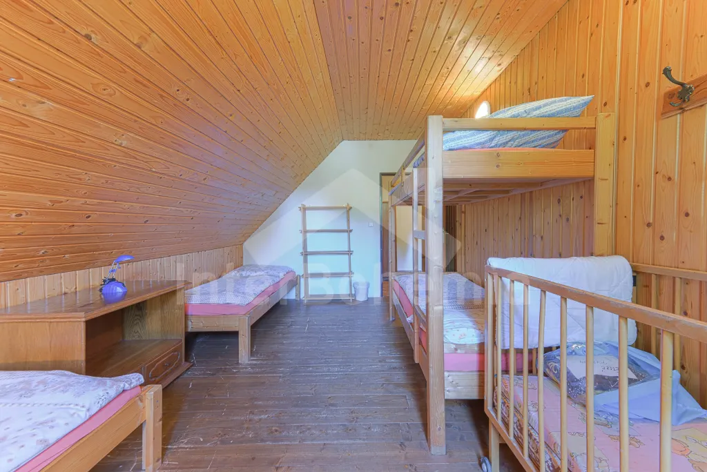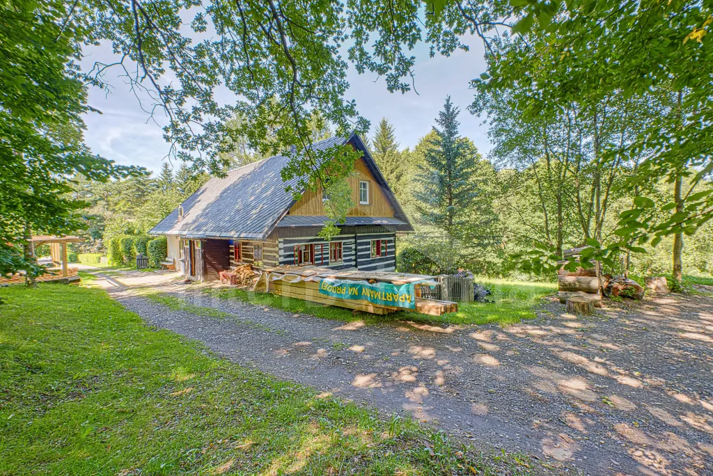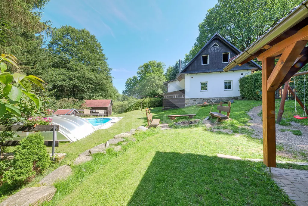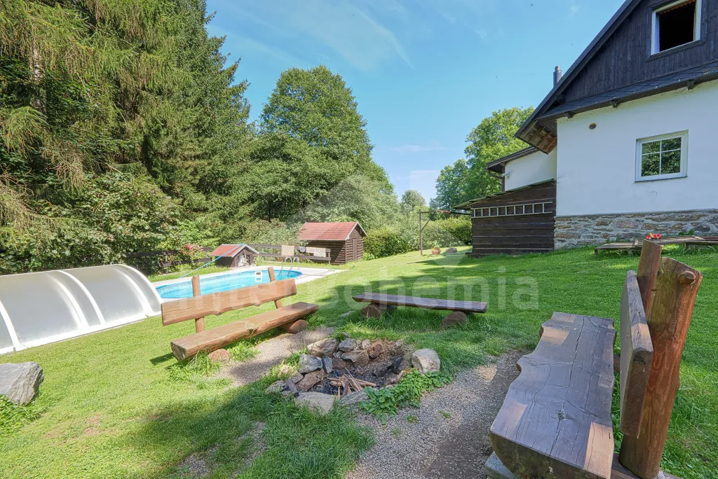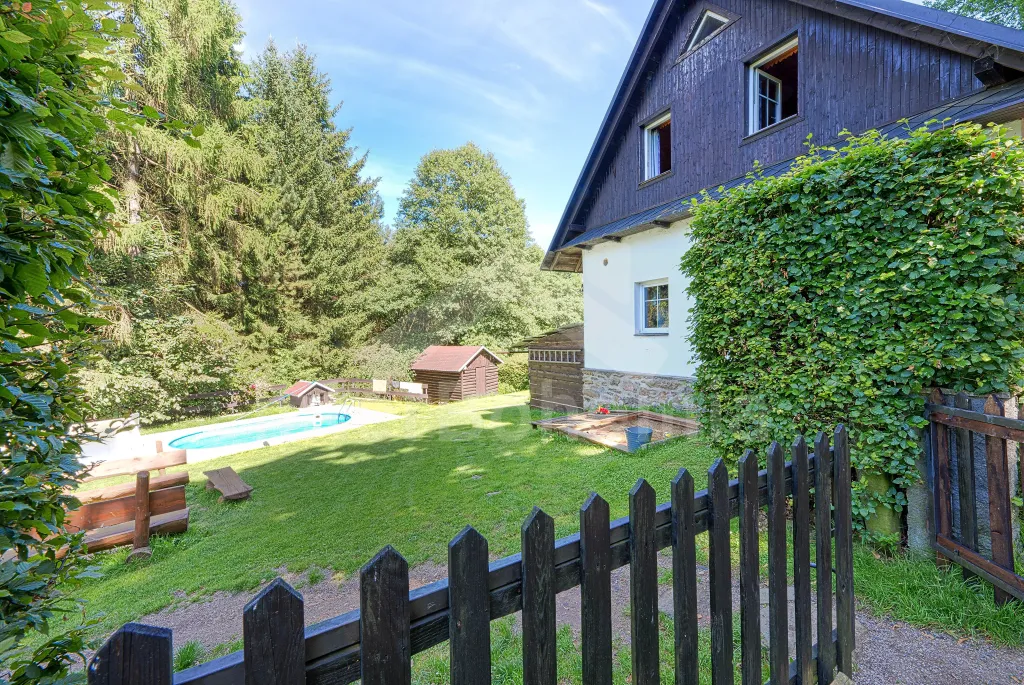 Volně stojící a prostorná chalupa, v roce 2005 zrekonstruovaná, účelně a příjemně zařízená. Vchod, chodba, prostor pro ukládání lyží a samostatná toaleta. Obývací pokoj se sedací soupravou pro 8 osob, televizí a hezkým krbem. Kuchyně s jídelním koutem, elektrickým sporákem, lednicí, kávovarem, varnou konvicí a mikrovlnnou troubou. Veranda s jídelními stoly a lavicemi. Malá průchozí ložnice s rozkládacím gaučem (slouží také jako dvojlůžko). Prostorná společenská místnost přístupná přes malou ložnici nebo zvenčí. Ve společenské místnosti se nachází kompletní výčepní zařízení, krbová kamna, chladicí skříň a posezení – stoly a lavice. Z chodby vedou schody do podkroví, kde se nachází chodba, koupelna s vanou a toaletou, druhá koupelna se sprchou a toaletou a další čtyři ložnice. První dvě ložnice každá s palandou a dvěma samostatnými lůžky a další dvě ložnice každá s palandou a třemi samostatnými lůžky. V suterénu se nachází finská sauna se sprchou a toaletou (přístup ze zahrady). Vytápění krbem a krbovými kamny, v zimě ústřední topení (o topení se stará správce). Chalupa stojí na vlastním oploceném pozemku, k dispozici je dřevěný zahradní nábytek, zahradní gril a bazén 5,5 x 3 m se zastřešením. Vlastní parkoviště.