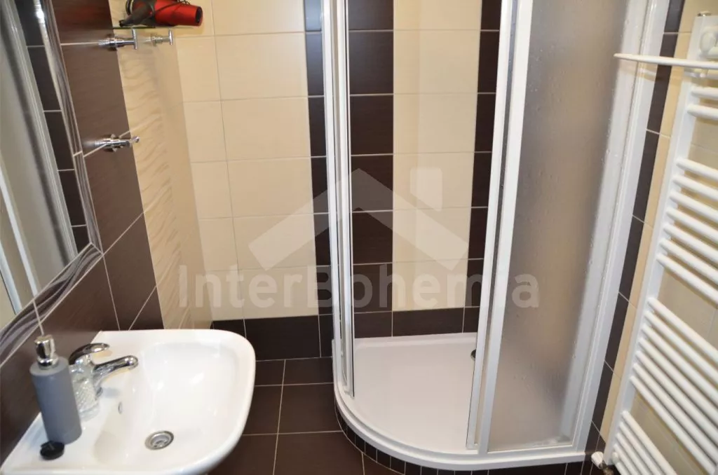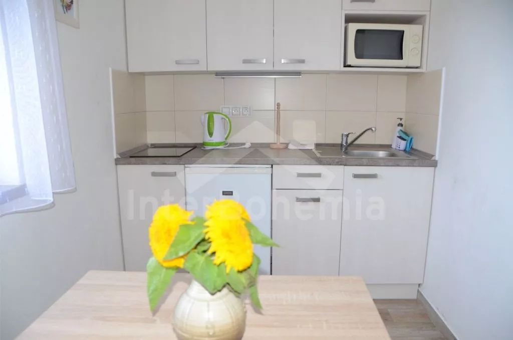 Apartmán č.2 - kuchyňská linka se sklokeramickou dvouplotýnkovou varnou deskou, mikrovlnnou troubou, lednicí, kávovarem, rychlovarnou konvicí a nádobím. Dále jídelní stůl pro 3 osoby. Ložnice s dvoulůžkem a LCD televizí. Druhá ložnice s dvěma jednolůžky. Koupelna se sprchovým koutem, umyvadlem a wc.