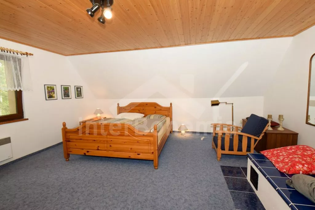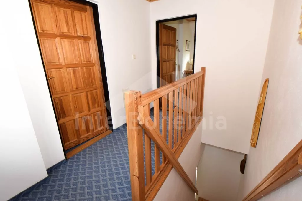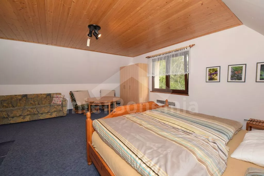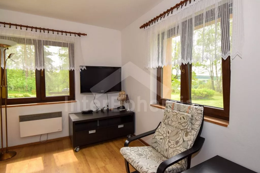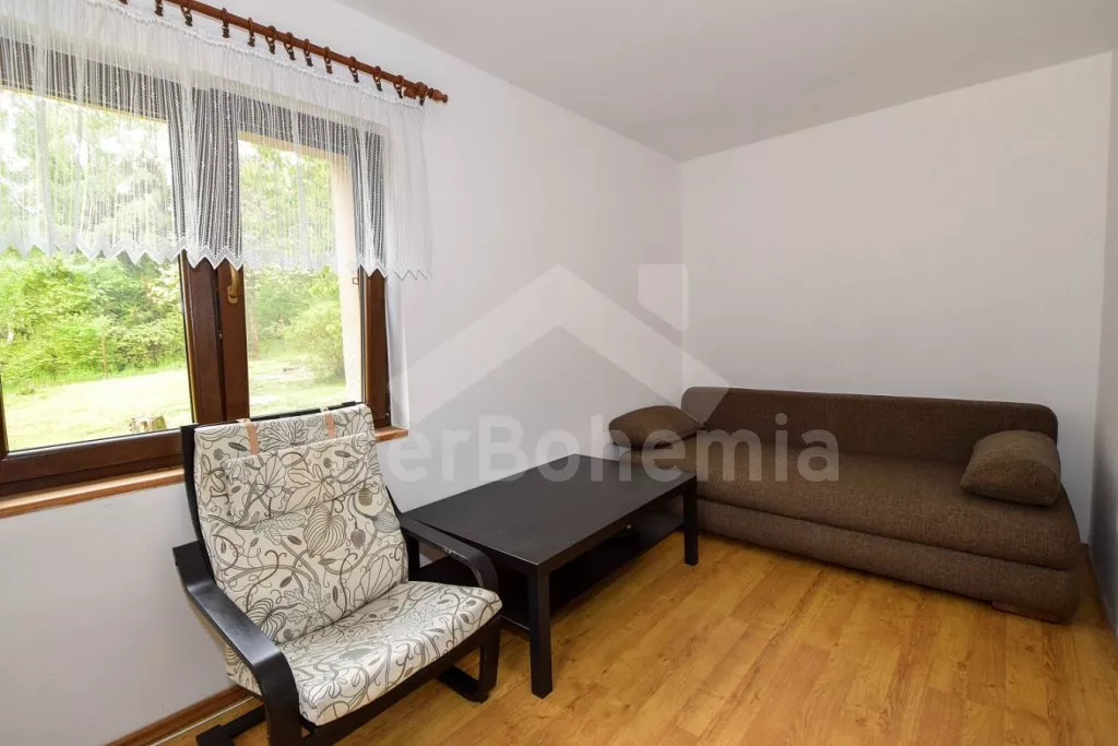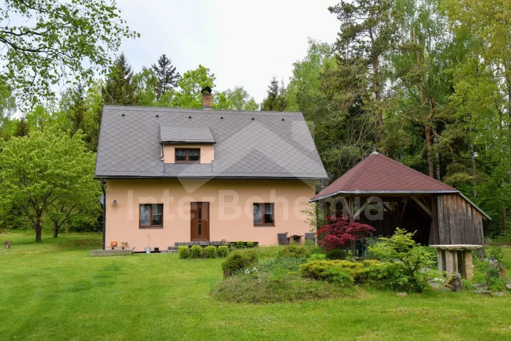 Samostatně stojící chalupa, na rozlehlém oploceném pozemku, po celkové rekonstrukci v roce 2020. Vstup, chodba, jídelna s posezením, kamny a kuchyňským koutem se sklokeramickou varnou deskou, troubou, mikrovlnnou troubou, rychlovarnou konvicí a nádobím. Obývací pokoj s pohovkou (extra dvoulůžko) a LCD televizí se satelitem. Koupelna se sprchovým koutem, umyvadlem a pračkou. Samostatné WC. Vstup do podkroví po strmějších schodech. První ložnice s dvoulůžkem a třemi extra lůžky (rozkládací křesla a pohovka). Druhá ložnice se dvěma samostatnými lůžky a psacím stolem. Vytápění objektu kamny a přímotopy. Rozlehlá, kompletně oplocená zahrada s venkovním posezením, plynovým grilem v pergole, ohništěm a nadzemním bazénem. Parkování přímo u objektu až pro 3 vozidla.