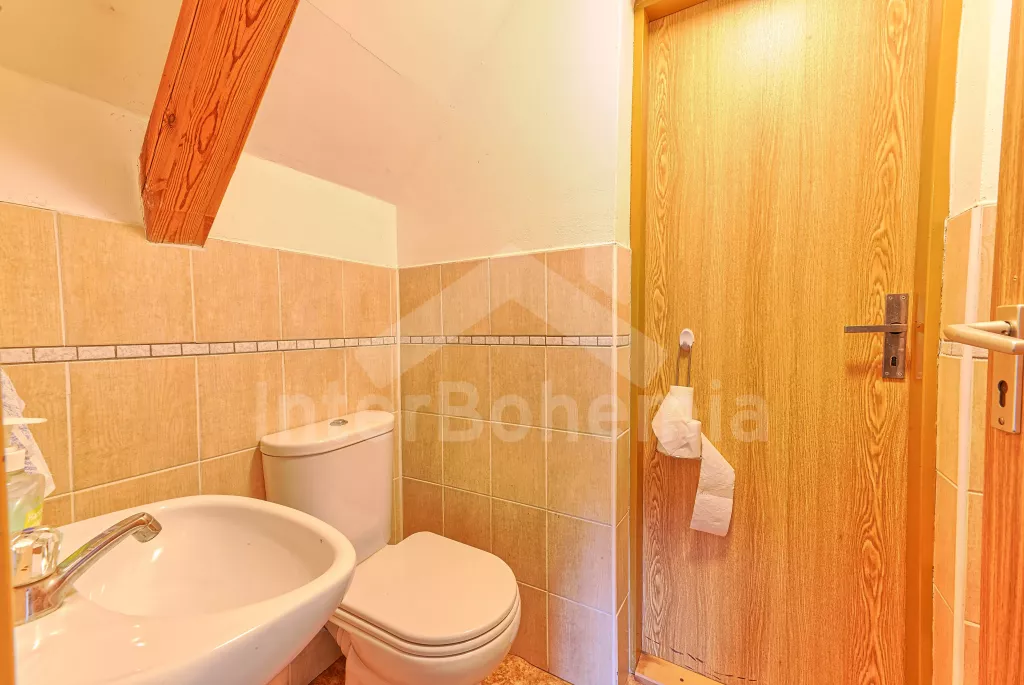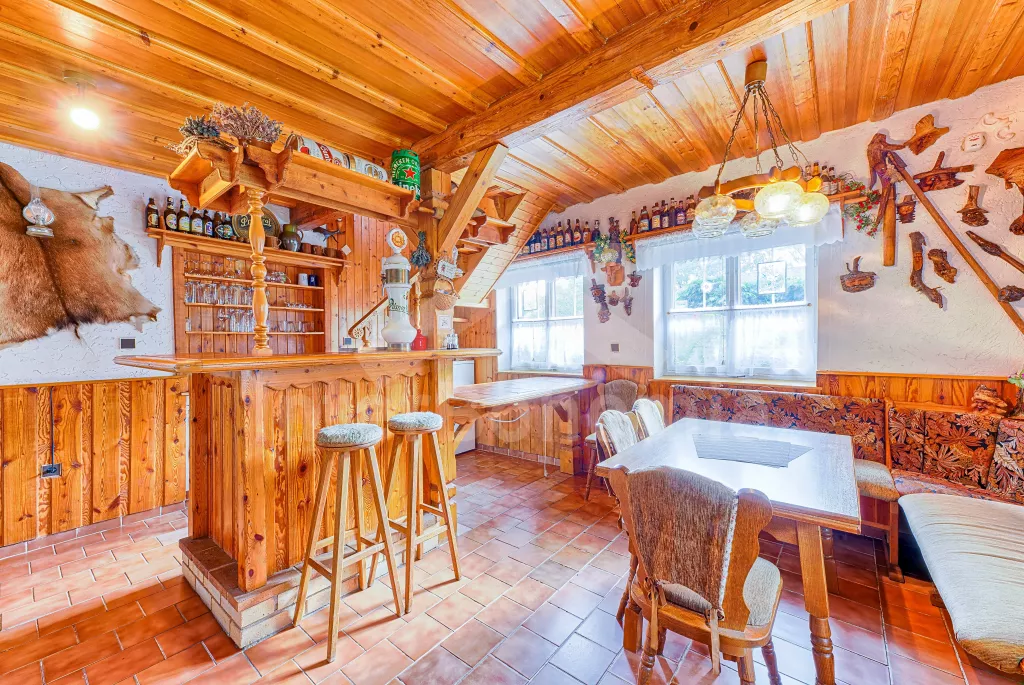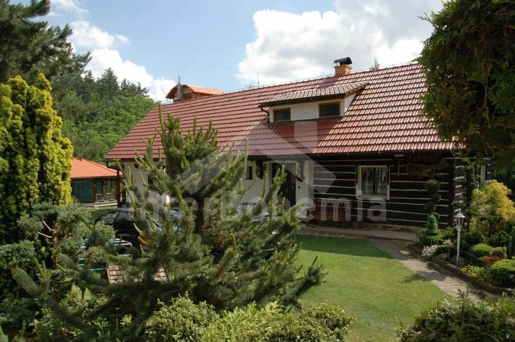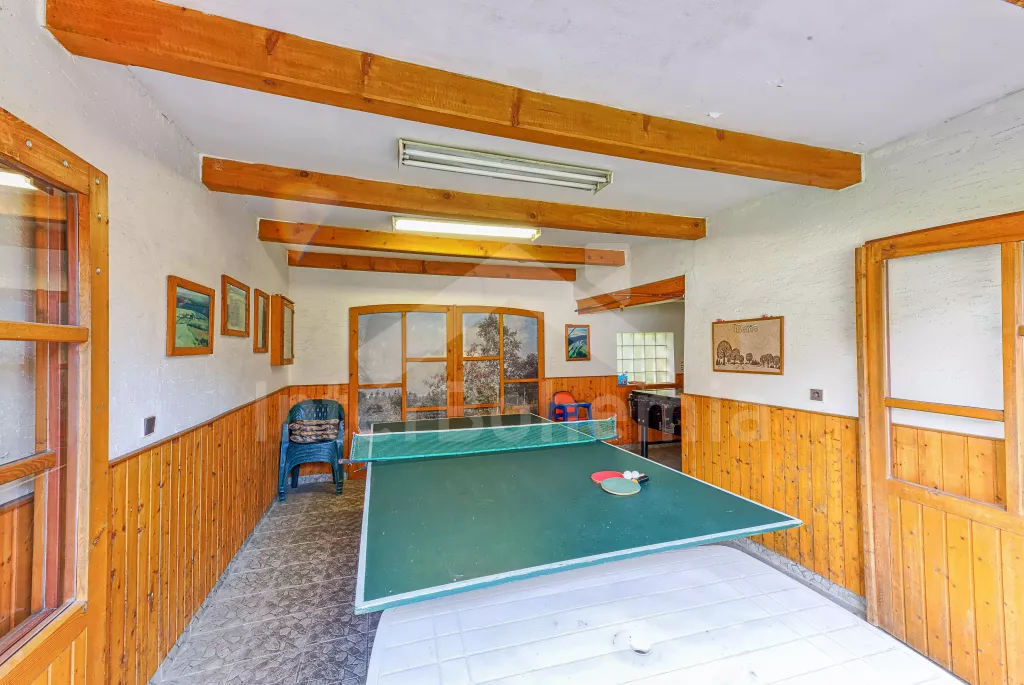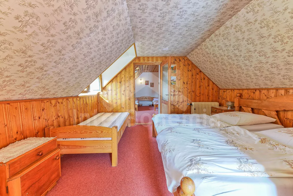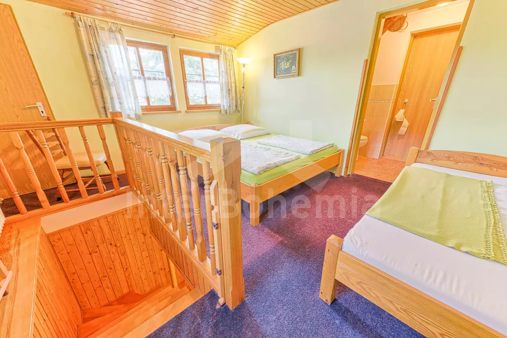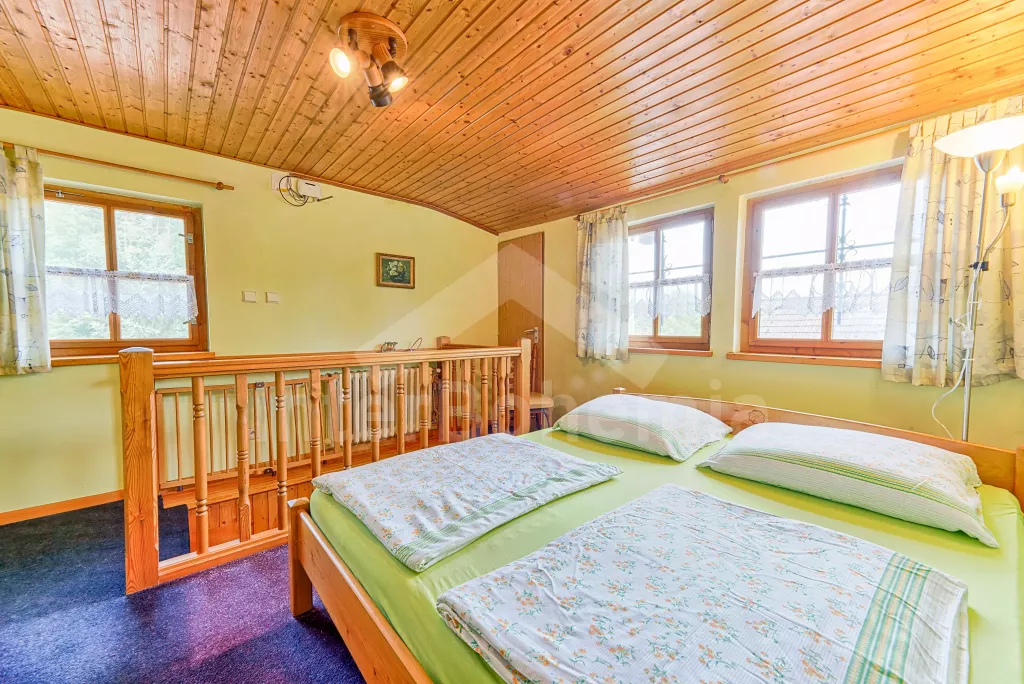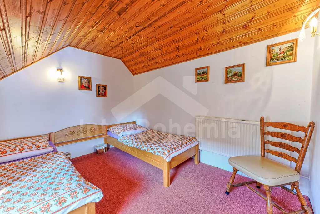 Volně stojící dům, velmi pěkné a pohodlné ubytování! Objekt je vkusně zařízen a pečlivě udržován. Obytná část tohoto domu, zrenovovaného ve starém stylu, se skládá z 6 místností. Vchod do haly. Obývací pokoj se sedací soupravou pro 6 osob, jídelním stolem pro 7 osob, krbem, televizí se satelitním příjmem, radiem a vstupem na terasu. Z části otevřená kuchyně s barem s chladícím výčepním zařízením a barovými stoličkami, elektrickým sporákem s elektrickou troubou, lednicí, myčkou, kávovarem a varnou konvicí. Koupelna s vanou a WC. Druhé samostatné WC. Ložnice s dvojlůžkem a dětskou postýlkou. Tato ložnice je přístupná z chodby nebo z druhého obývacího pokoje. Druhý obývací pokoj má samostatný vchod zvenčí a je vybaven sedací soupravou a jídelním stolem pro 4 osoby a televizí se satelitním příjmem. Malý kuchyňský kout s dvouplotýnkovým vařičem, lednicí, mikrovlnkou, kávovarem a varnou konvicí. Druhá koupelna se sprchou a WC. V patře se nachází ještě tři ložnice – jedna průchozí se třemi lůžky, druhá ložnice s dvojlůžkem a třetí ložnice s dvojlůžkem, jedním samostatným lůžkem a vlastní toaletou s umyvadlem. Ústřední plynové topení. V letní sezoně (květen - září) je k dispozici vnitřní bazén 6,5 x 4 m s filtrací a s vyhříváním tepelným čerpadlem. Dále je v objektu sauna, biliár (na mince), stolní fotbal, stolní tenis. Okrasná zahrada s květinami a malým rybníčkem. Dvě terasy, z nichž jedna je zastřešená. K dispozici zahradní krb, zahradní nábytek a slunečník. Pro děti je k dispozici domeček na hraní se skluzavkou, houpačka, houpací koník a pískoviště.